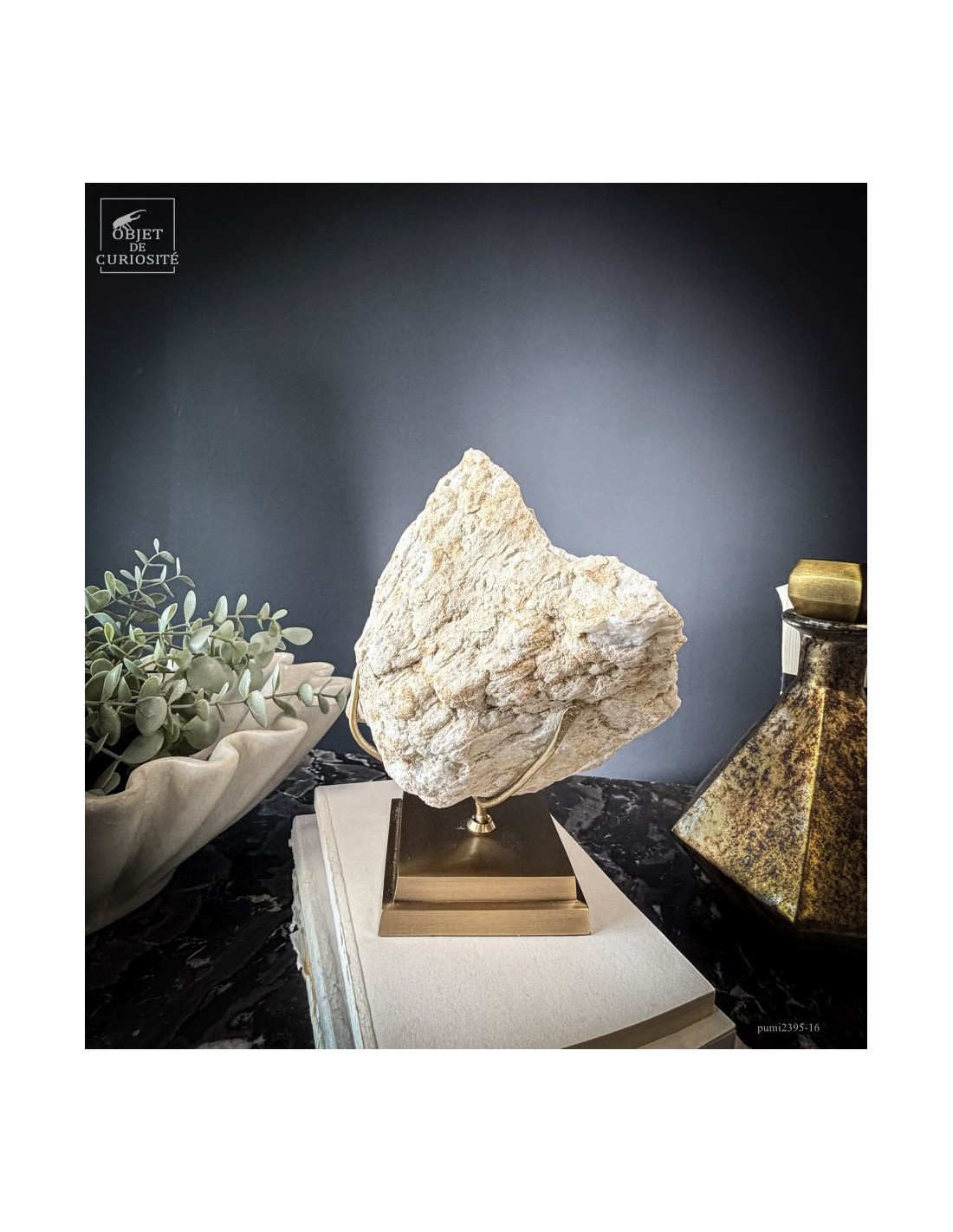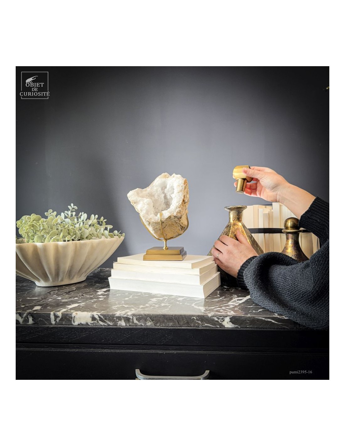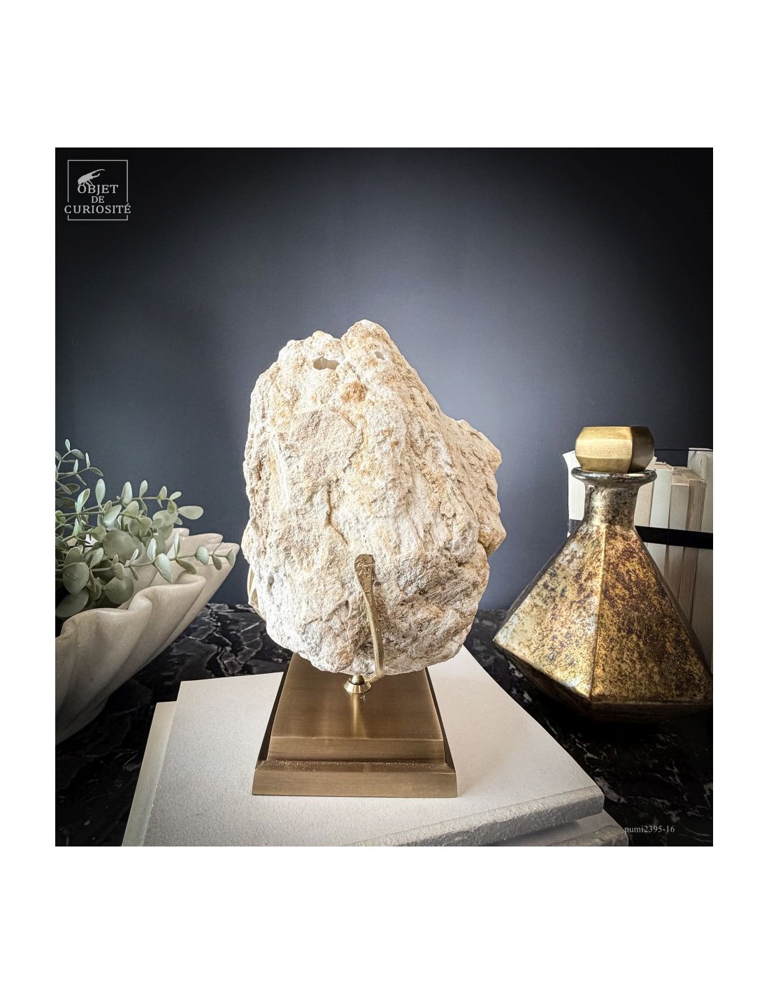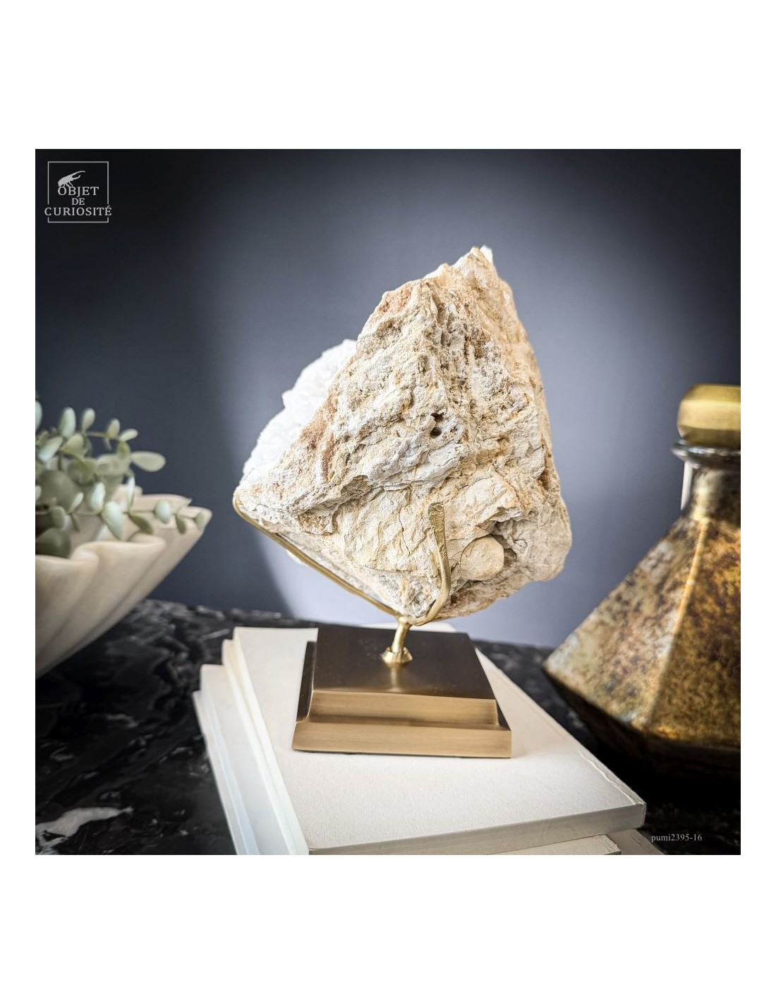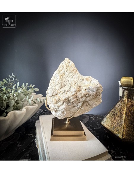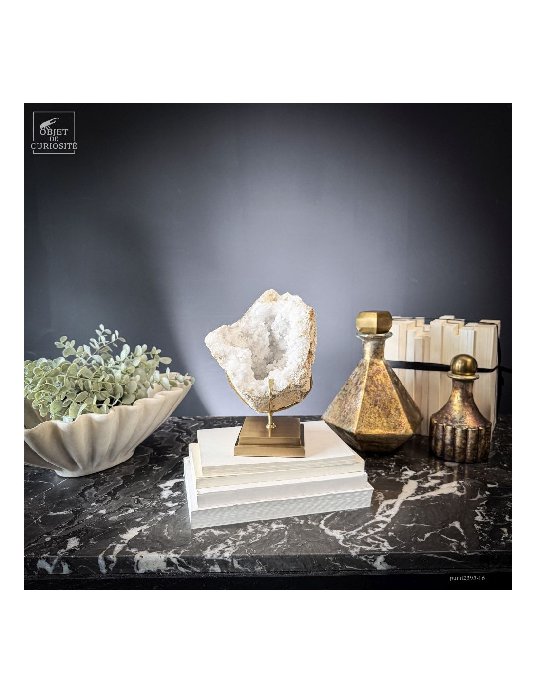 Ce minéral est une géode de Quartz blanc de l'extrême sud Marocain - près de Laâyoune - et qui a l'air d'une simple boule de pierre naturelle. L'intérieur est une vraie cavité de cristaux naturels. Comme celle-ci est profonde, on voit des macles de cristaux (groupe de cristaux partant dans tous les sens, mais avec la même racine). Une blancheur éclatante.