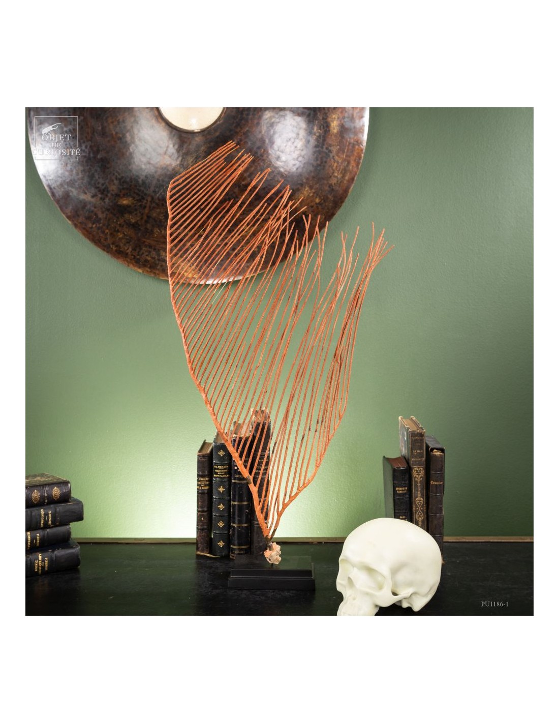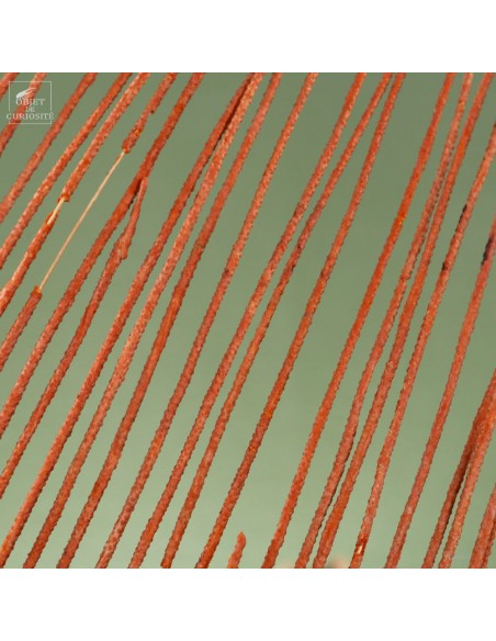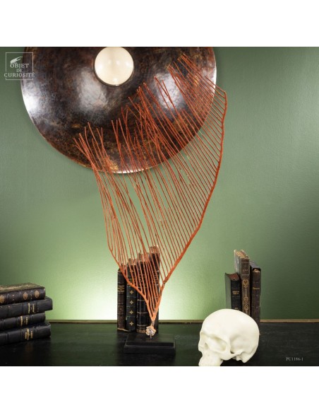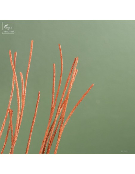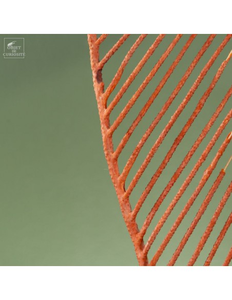 Cette gorgone lyre orange (Ctenocella pectinata), originaire de l’Océan Indien, doit son nom à sa forme distinctive qui évoque une lyre. Les gorgones, comme les coraux, sont des colonies de polypes sessiles se nourrissant de plancton. Cette espèce se développe perpendiculairement aux courants marins pour maximiser la capture des nutriments. Son squelette de gorgonine, à la fois flexible et solide, lui permet de résister aux forts courants des profondeurs.