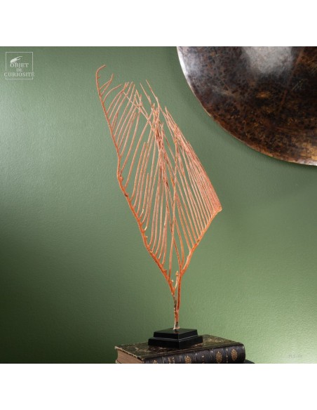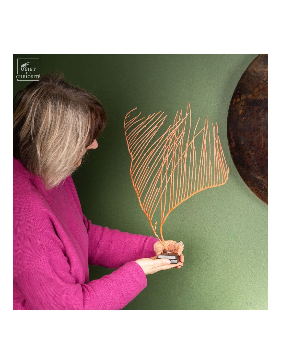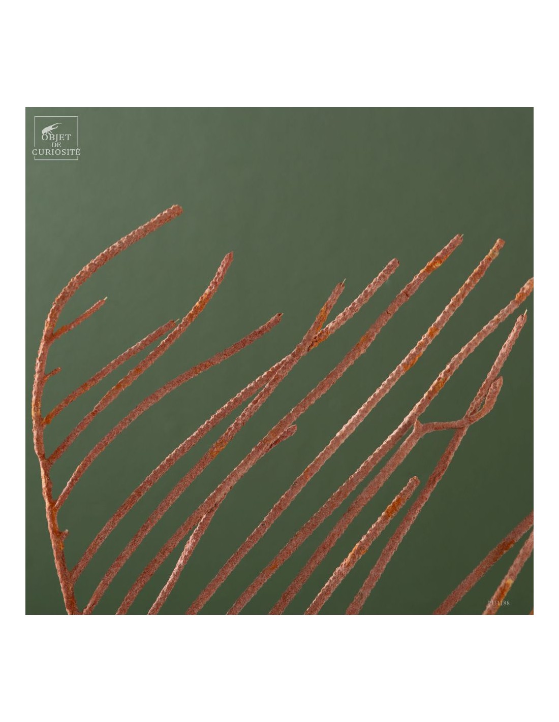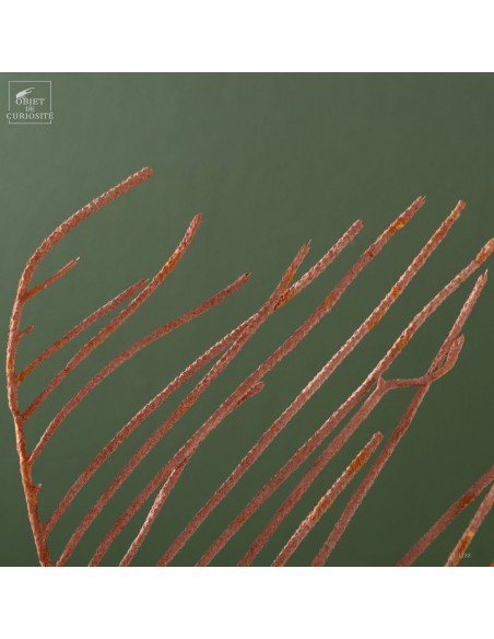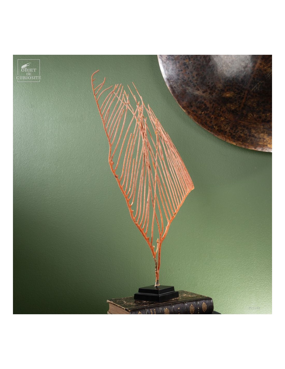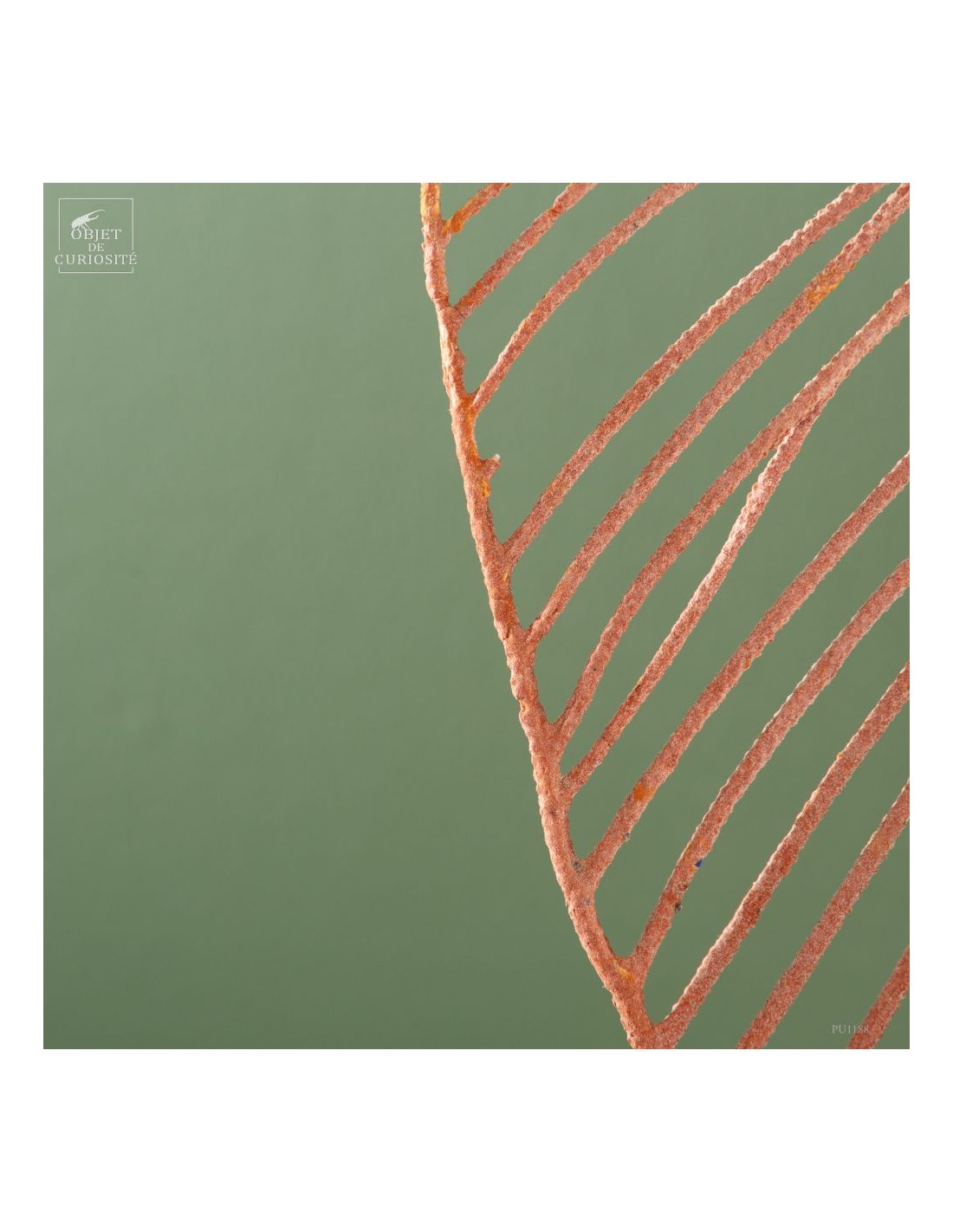 Cette gorgone lyre orange (Ctenocella pectinata), originaire de l’Océan Indien, doit son nom à sa forme distinctive qui évoque une lyre. Les gorgones, comme les coraux, sont des colonies de polypes sessiles se nourrissant de plancton. Cette espèce se développe perpendiculairement aux courants marins pour maximiser la capture des nutriments. Son squelette de gorgonine, à la fois flexible et solide, lui permet de résister aux forts courants des profondeurs.