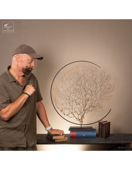 Elle est ici présentée dans un cercle de métal au design exclusif développé par Objet de Curiosité, qui souligne l’architecture naturelle du spécimen et en fait une véritable sculpture de curiosité marine.
