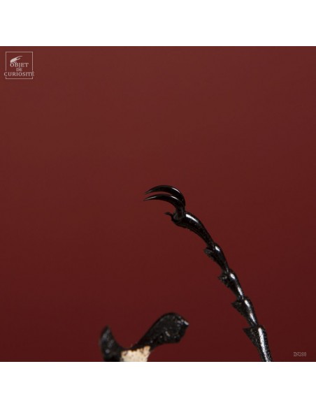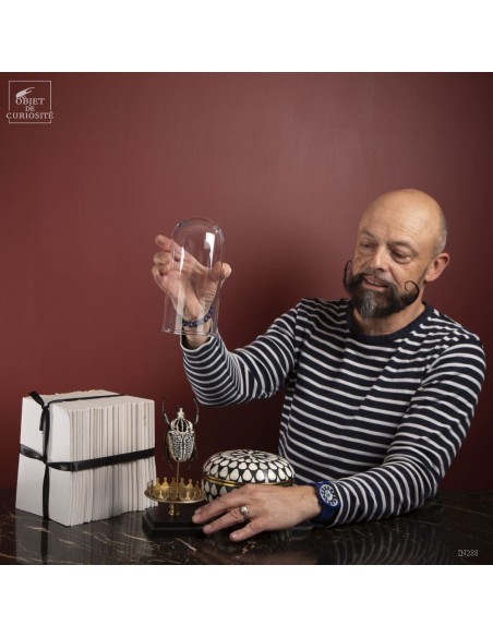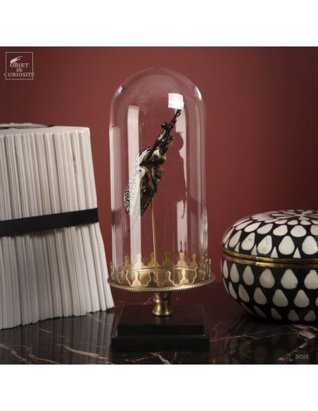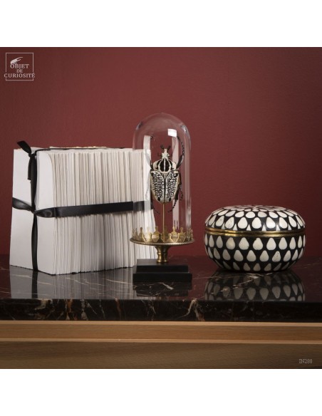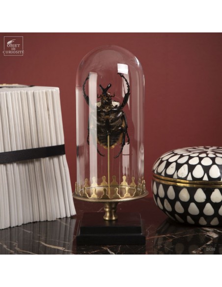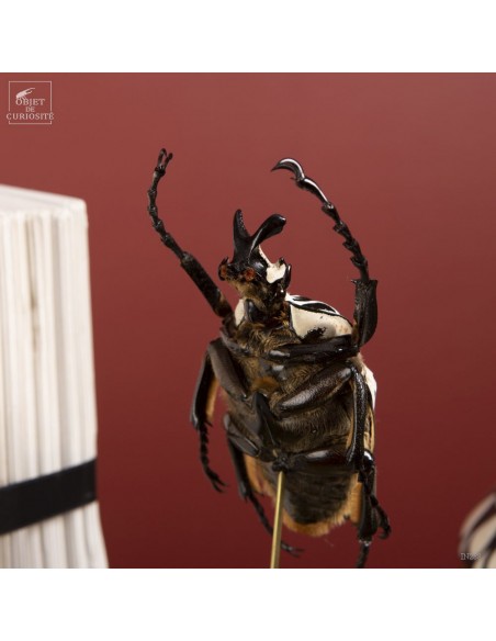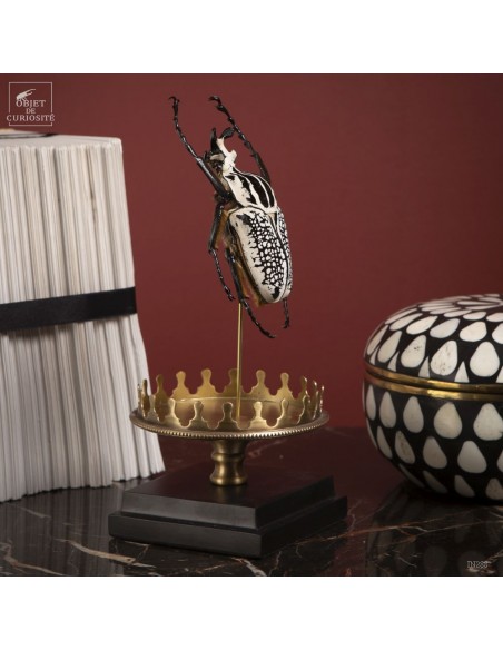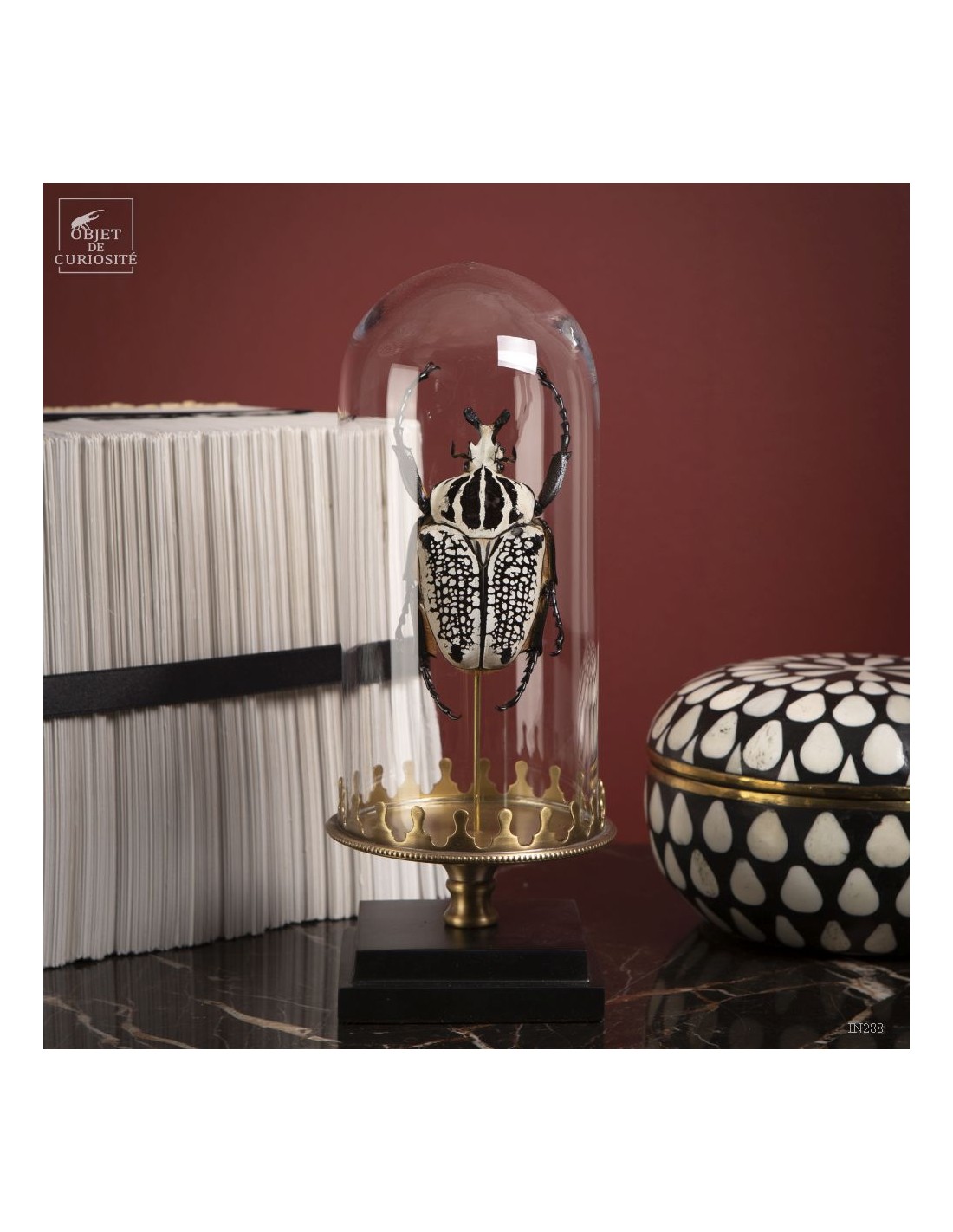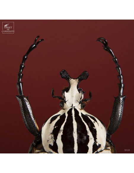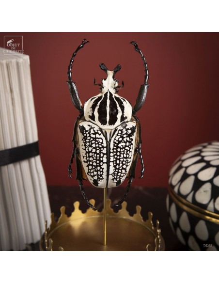 Goliathus Orientalis sous mini globe. Le Goliathus est une espèce Africaine pouvant atteindre plus d'une dizaine de centimètres et peser jusqu'à 100g, rendant le spectacle de sa sortie de terre et son envol au début de la saison des pluies vraiment impressionnants. La corne noire en forme de Y portée fièrement par les mâles, est utilisée comme levier lors des batailles en période de reproduction ou tout simplement pour défendre un fruit sucré. Un alignement parfait en noir et blanc.
