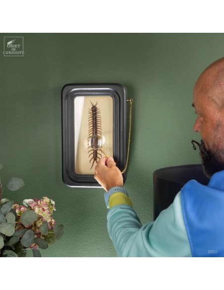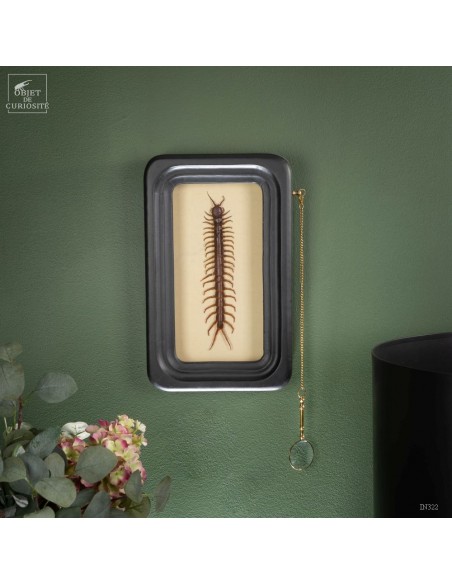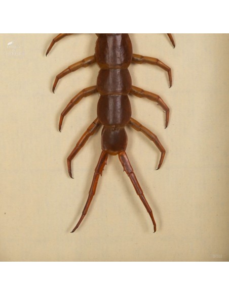 SCOLOPENDRA SUBSPINIPES dans un cadre d'observation. Cet impressionnant Myriapodes d'origine thaïlandais est constitué de 21 segments, une paire de pattes chacun, pouvant atteindre un maximum de 25cm de long. Très agressive, la Scolopendre paralyse ses proies grâce à ses forcipules venimeuses, mais rassurez-vous, la morsure n'est pas mortelle si vous êtes plus grand qu'une souris!