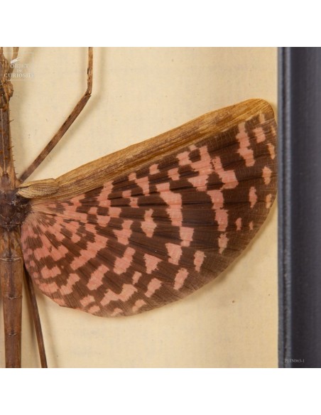 le phasme tesselé, Diesbachia tamyris, provient des forêts tropicales d’Asie du Sud-Est, notamment des régions de Malaisie et d’Indonésie. Il vit dans des environnements denses, riches en végétation, où il se camoufle aisément parmi les branches et les feuilles. Le mimétisme de cette espèce est si abouti que le phasme peut rester immobile pendant des heures, voire des jours, pour échapper aux prédateurs. Les deux sexes de cette espèce possèdent des ailes aux motifs roses et noirs. La femelle, généralement plus grande que le mâle, est particulièrement impressionnante lorsque ses ailes sont déployées. Ces ailes, bien que rarement utilisées pour le vol, servent surtout de mécanisme de défense, surprenant les prédateurs avec leur couleur vive.