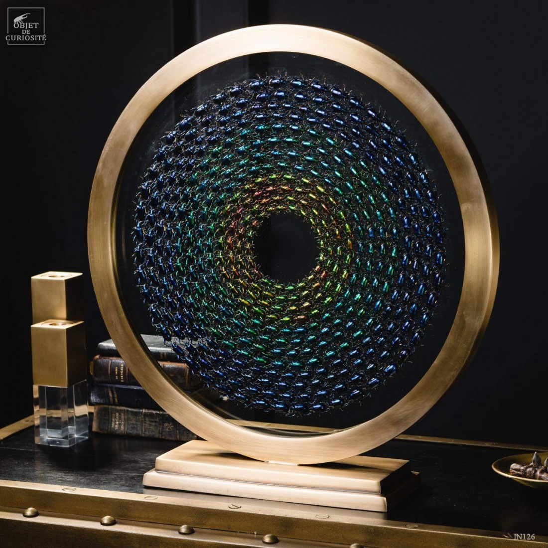 Loin des présentations de musée, certains insectes sont absolument stupéfiants! Cette espèce de scarabée à cuisses de grenouille s'appelle Sagra Fermorata. Les cercles concentriques sont composés d'insectes strictement naturels. Les femelles au centre avec de grandes variations de couleur, mais toujours avec des reflets métalliques, et progressivement les mâles, des plus petits aux spécimens exceptionnels. La présentation de ces scarabés de Malaisie et Thaïlande entre 2 vitres, et placées dans ce grand cercle de laiton massif, les rend irréels. Pourtant ils le sont! Et il nous faut plus d'1 semaine de travail pour terminer cette roue chromatique naturelle.