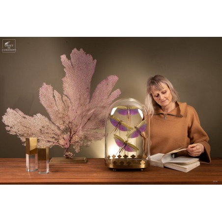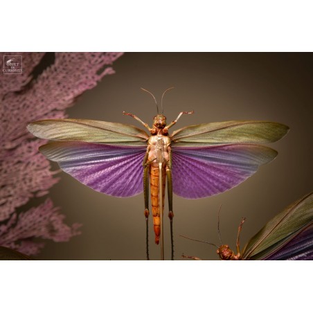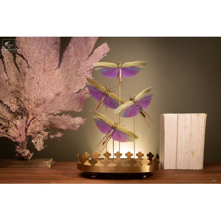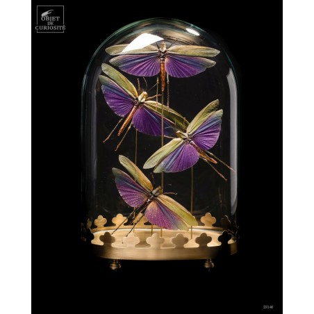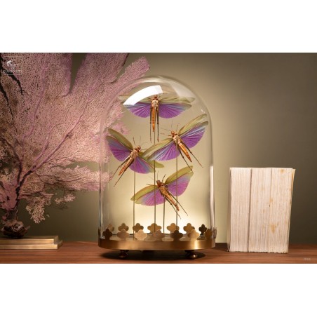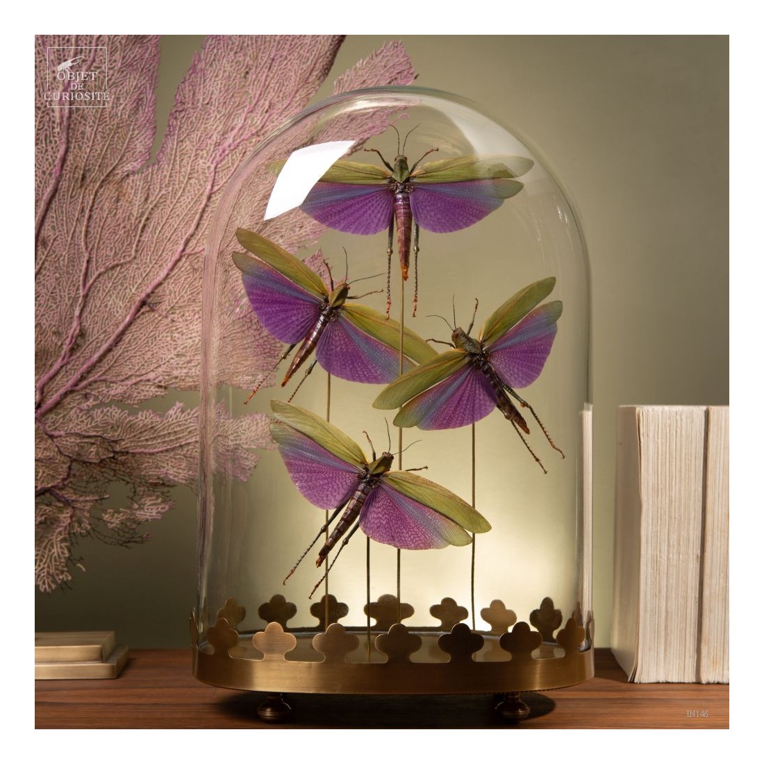 4 criquets VIOLETS (Guyane) sous globe ovale, socle laiton