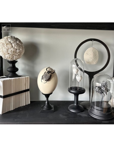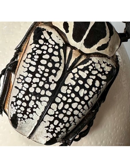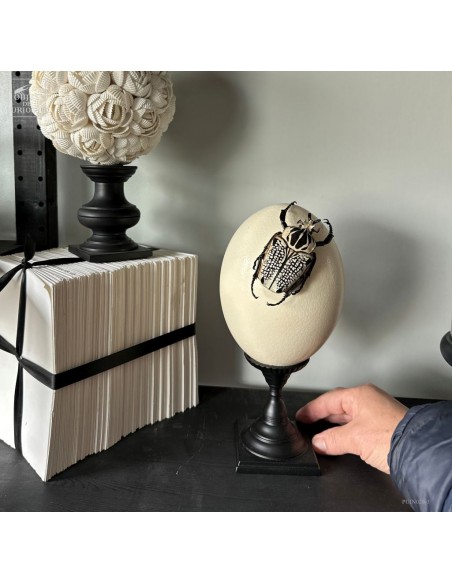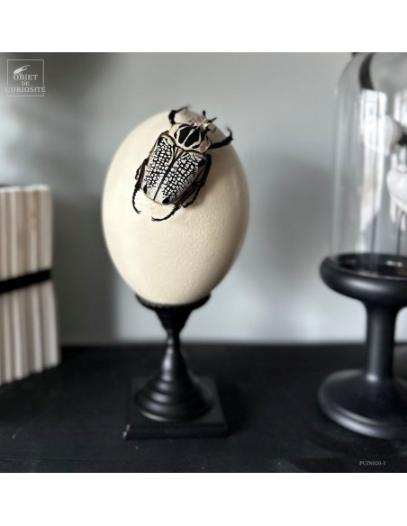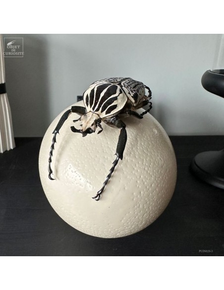 Goliathus Orientalis sur oeuf d'autruche. Décrit par le naturaliste français Jean-Baptiste Lamarck en 1801, le Goliathus est une espèce Africaine pouvant atteindre plus d'une dizaine de centimètres et peser jusqu'à 100g, rendant le spectacle de sa sortie de terre et son envol au début de la saison des pluies vraiment impressionnants. La corne noire en forme de Y portée fièrement par les mâles, est utilisée comme levier lors des batailles en période de reproduction ou tout simplement pour défendre un fruit sucré. Un alignement parfait en noir et blanc.
