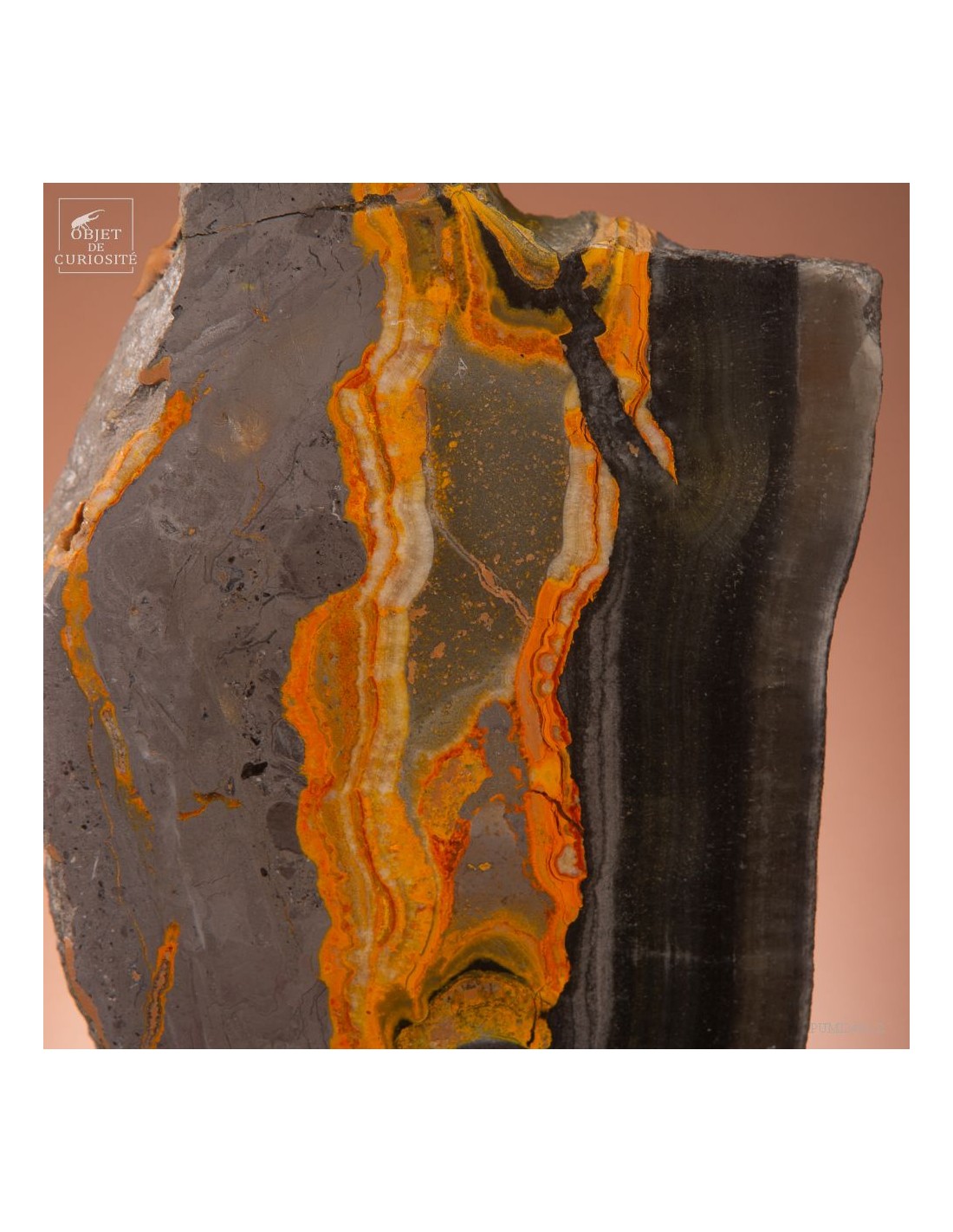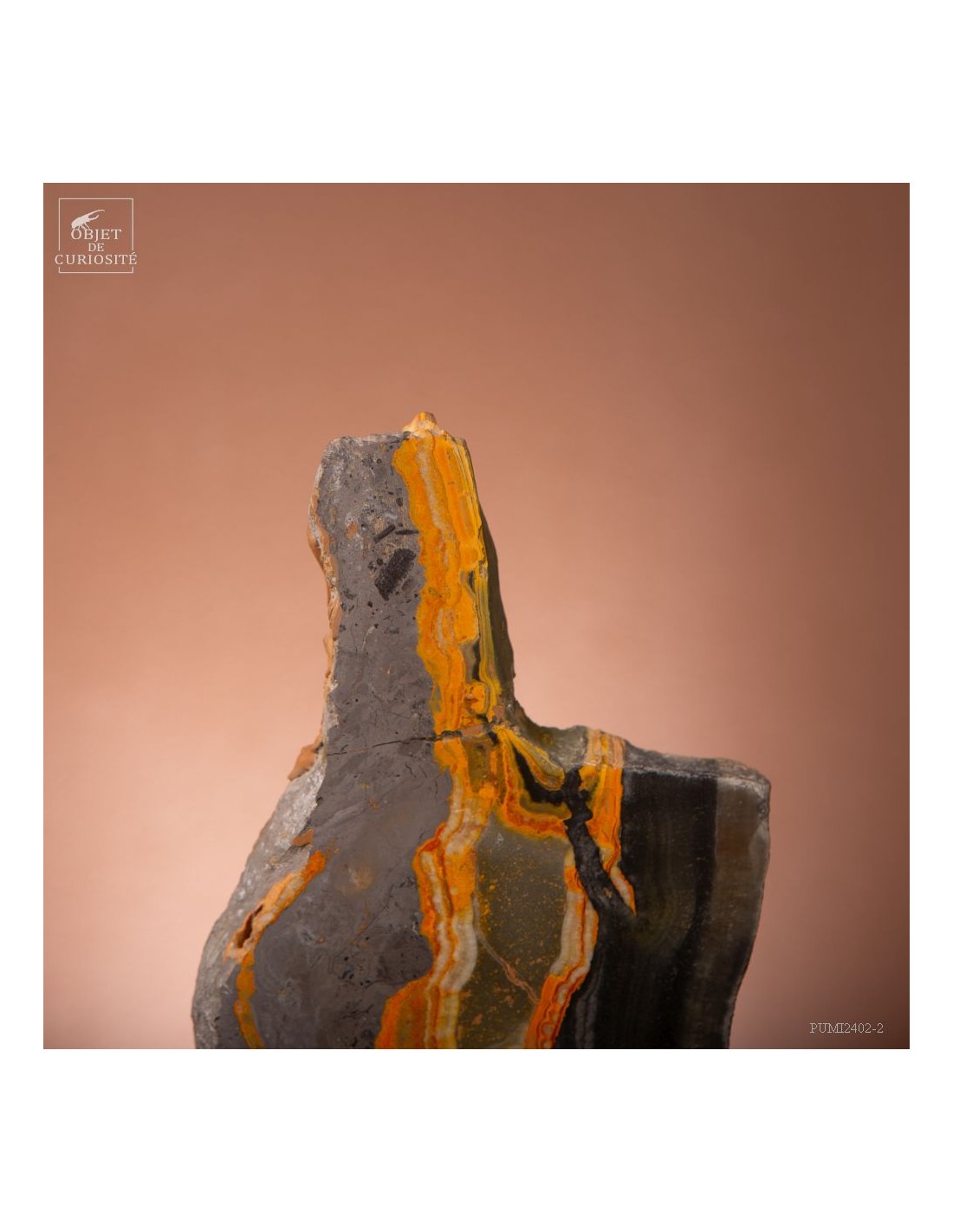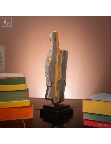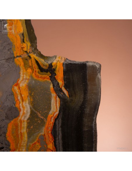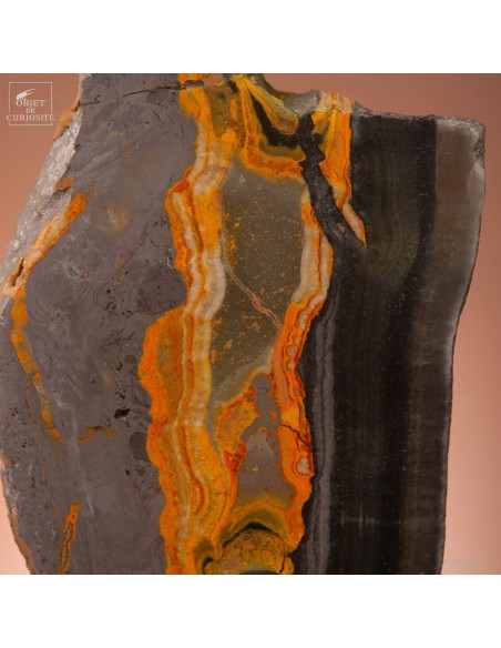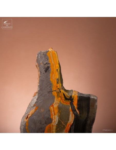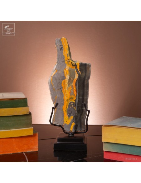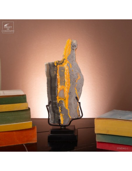 Un mélange de couleurs inhabituel dans le monde minéral. Le Jaspe Bourdon fait effectivement penser à cet insecte avec ses lignes jaunes noires et orangées. Cette pierre a été trouvée au pied d'un volcan toujours en activité à l'Ouest de Java: le Papandayan. Ce n'est pas exactement un Jaspe, mais il a souvent une structure botryoidal (cristaux radiés à partir d'un nucleus), comme certains Jaspes. Ces bandes jaunes/orange et noires se sont formées avec la compression de couches issues du volcan. Les lignes noires sont chargée en hématite, après oxydation de la pyrite, et les veines jaunes orangées sont chargée en Orpiment, un sulfure d'Arsenic. Cette pierre s'est répandue en occident à partir de 1990, quand les ouvriers qui vont chercher du souffre parmi les fumerolles toxiques du volcan, ont commencé à récolter ces magnifiques curiosités. Un bourdon aux couleurs exceptionnelles...