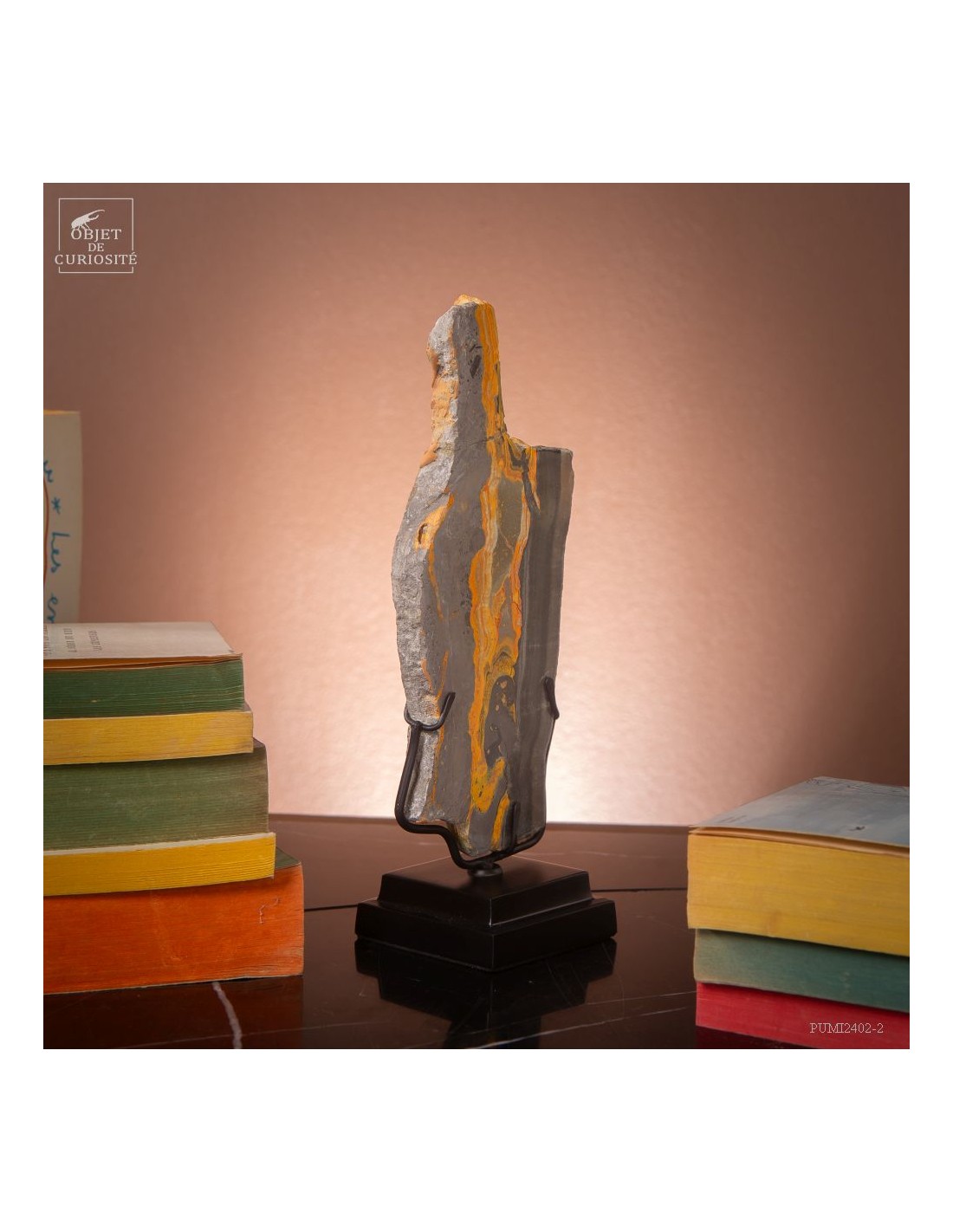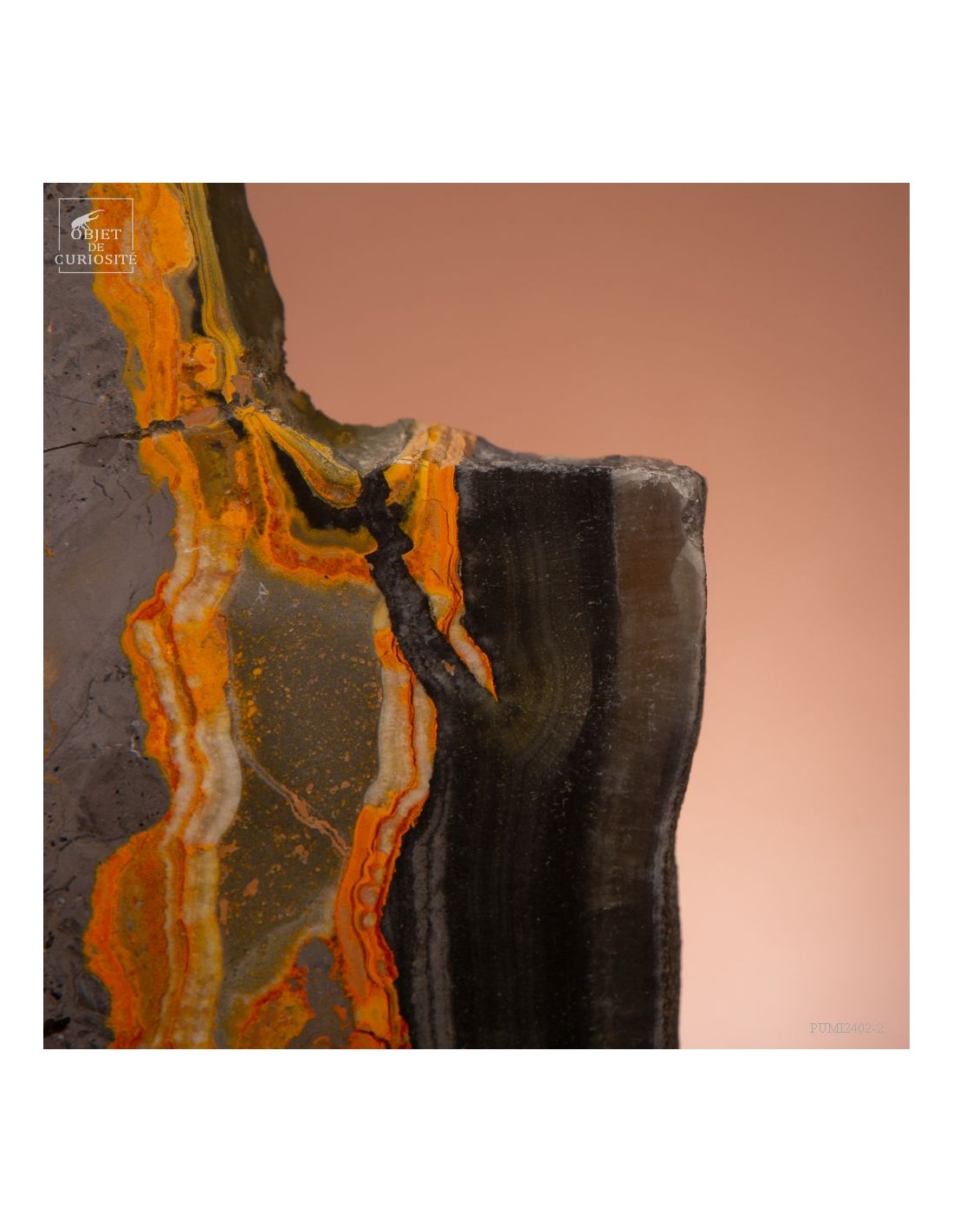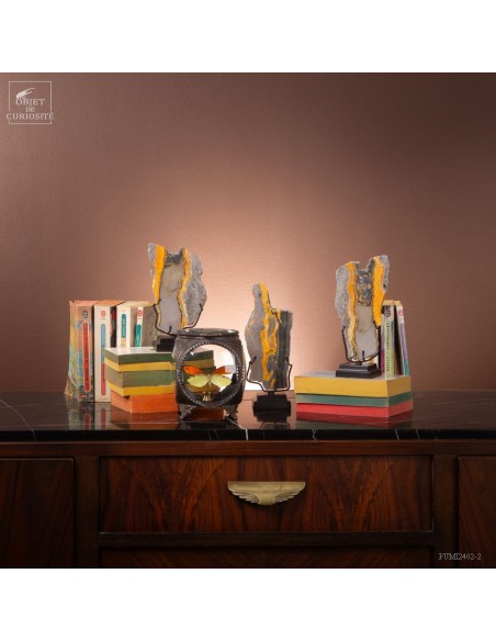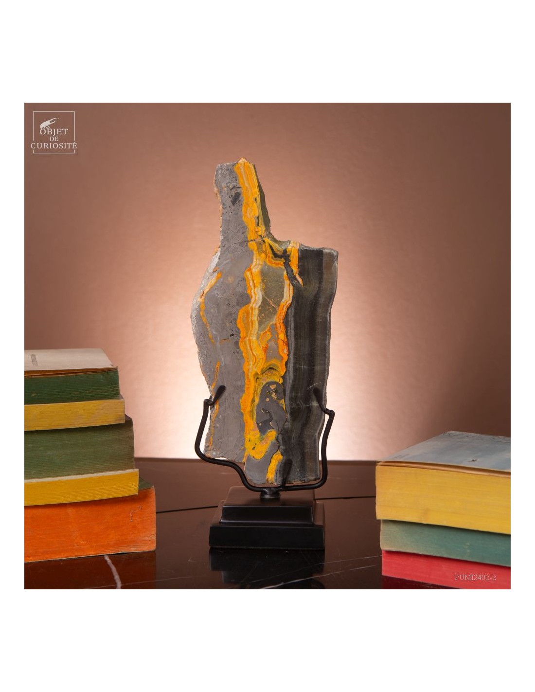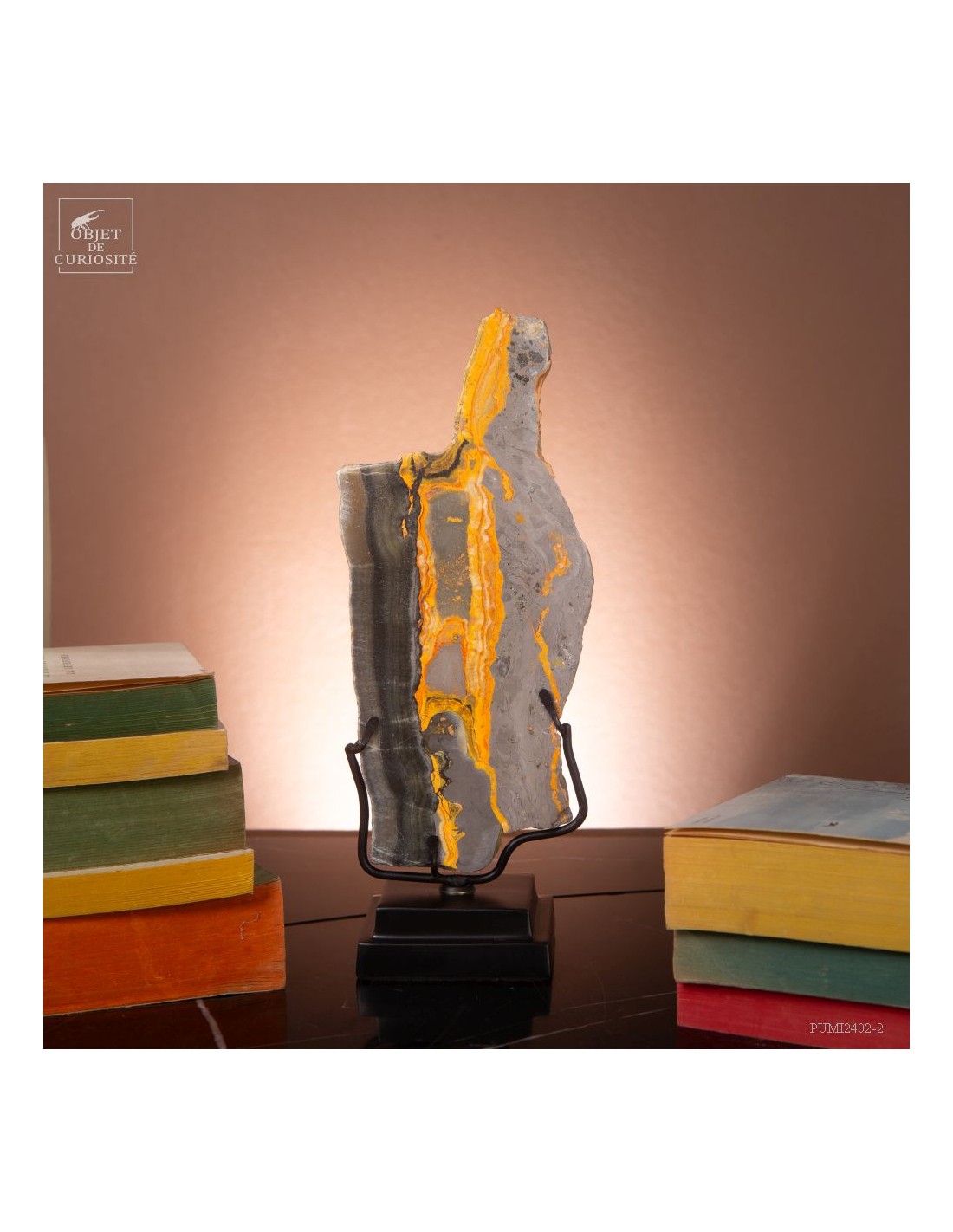 Un mélange de couleurs inhabituel dans le monde minéral. Le Jaspe Bourdon fait effectivement penser à cet insecte avec ses lignes jaunes noires et orangées. Cette pierre a été trouvée au pied d'un volcan toujours en activité à l'Ouest de Java: le Papandayan. Ce n'est pas exactement un Jaspe, mais il a souvent une structure botryoidal (cristaux radiés à partir d'un nucleus), comme certains Jaspes. Ces bandes jaunes/orange et noires se sont formées avec la compression de couches issues du volcan. Les lignes noires sont chargée en hématite, après oxydation de la pyrite, et les veines jaunes orangées sont chargée en Orpiment, un sulfure d'Arsenic. Cette pierre s'est répandue en occident à partir de 1990, quand les ouvriers qui vont chercher du souffre parmi les fumerolles toxiques du volcan, ont commencé à récolter ces magnifiques curiosités. Un bourdon aux couleurs exceptionnelles...