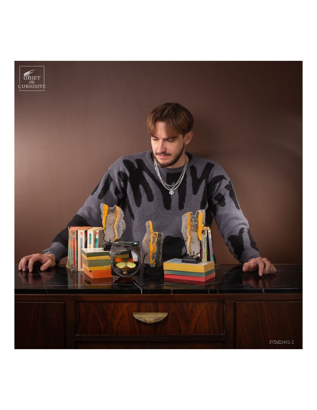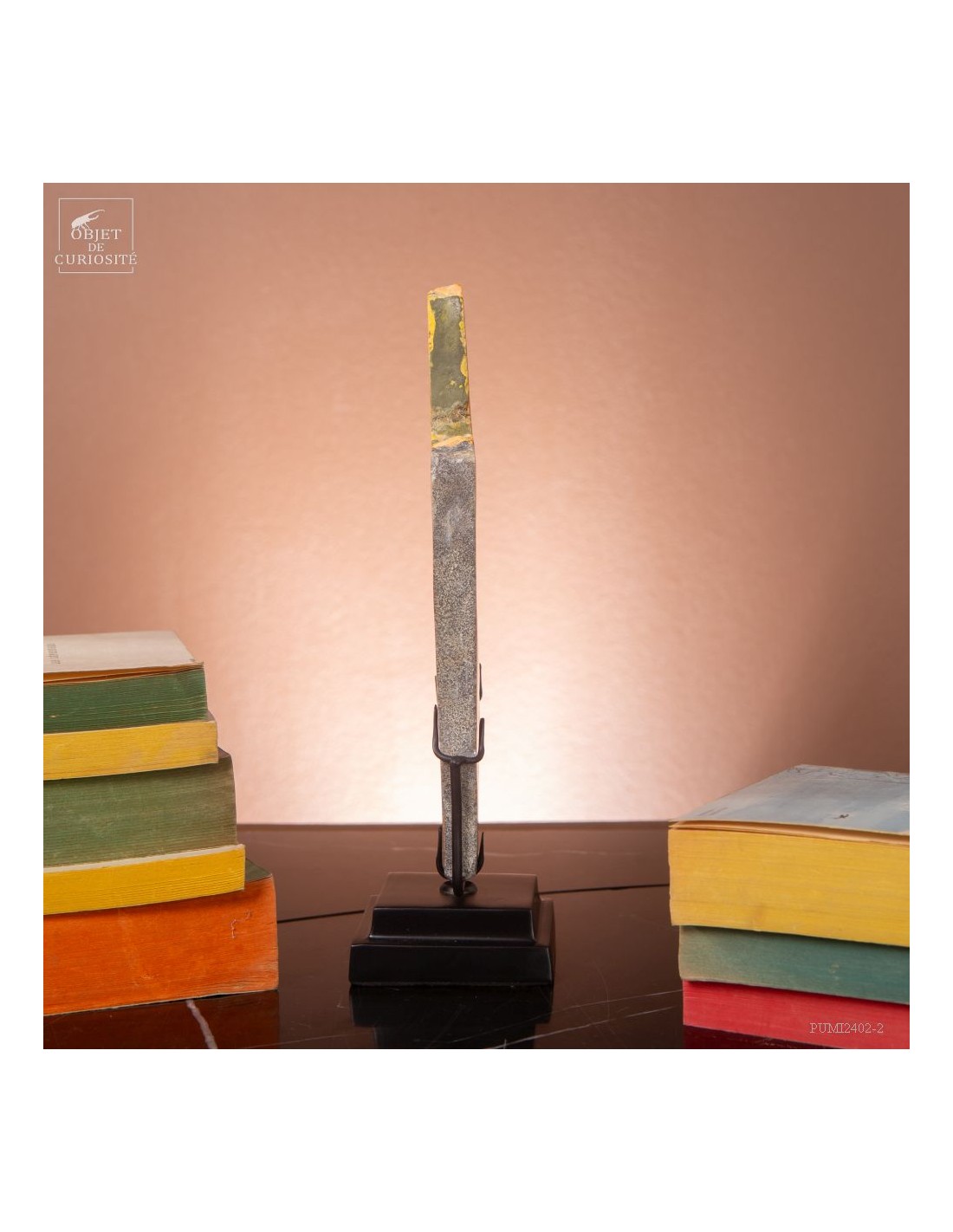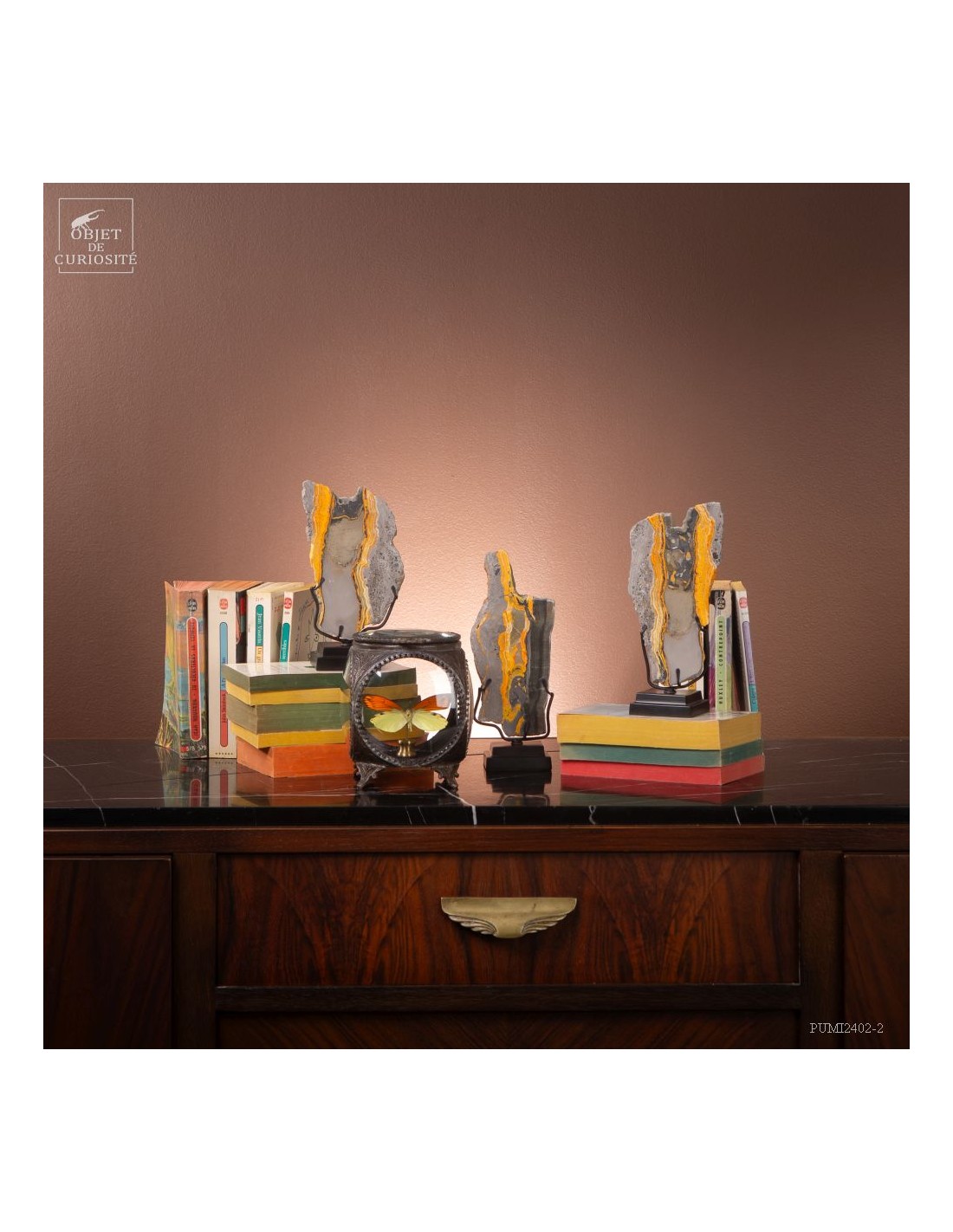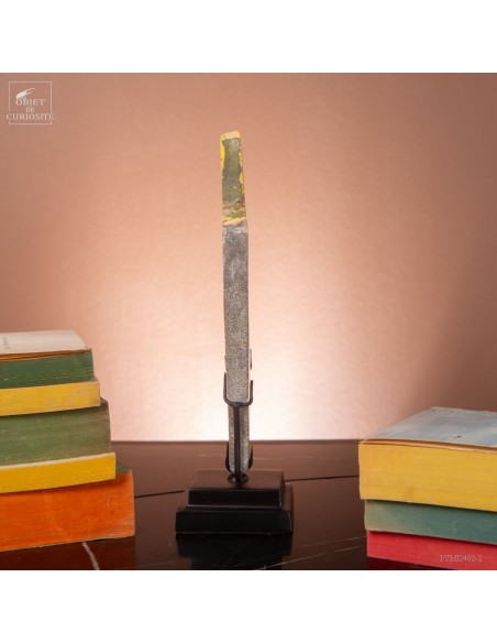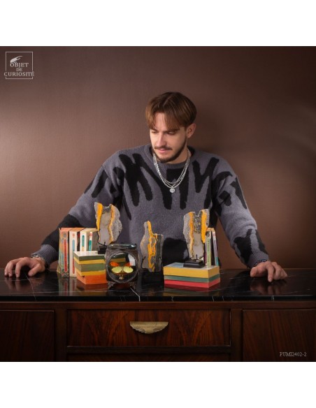 Un mélange de couleurs inhabituel dans le monde minéral. Le Jaspe Bourdon fait effectivement penser à cet insecte avec ses lignes jaunes noires et orangées. Cette pierre a été trouvée au pied d'un volcan toujours en activité à l'Ouest de Java: le Papandayan. Ce n'est pas exactement un Jaspe, mais il a souvent une structure botryoidal (cristaux radiés à partir d'un nucleus), comme certains Jaspes. Ces bandes jaunes/orange et noires se sont formées avec la compression de couches issues du volcan. Les lignes noires sont chargée en hématite, après oxydation de la pyrite, et les veines jaunes orangées sont chargée en Orpiment, un sulfure d'Arsenic. Cette pierre s'est répandue en occident à partir de 1990, quand les ouvriers qui vont chercher du souffre parmi les fumerolles toxiques du volcan, ont commencé à récolter ces magnifiques curiosités. Un bourdon aux couleurs exceptionnelles...