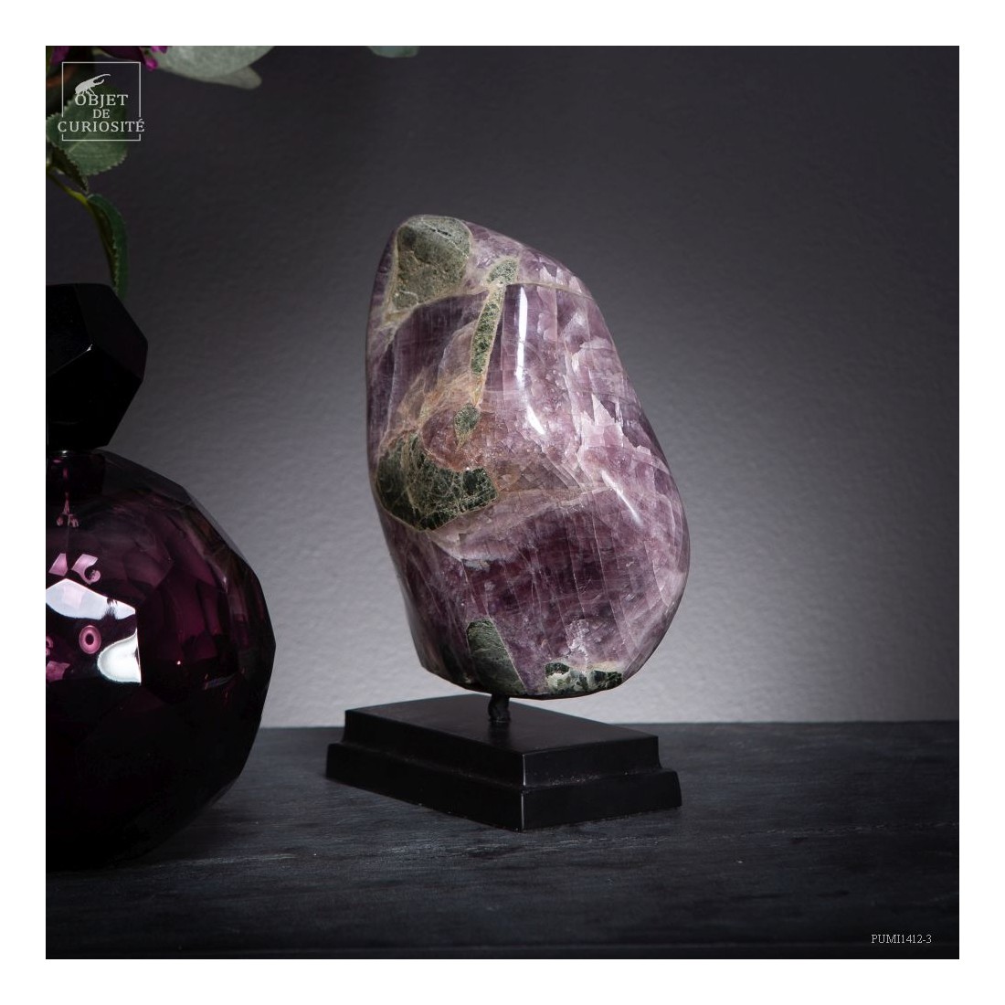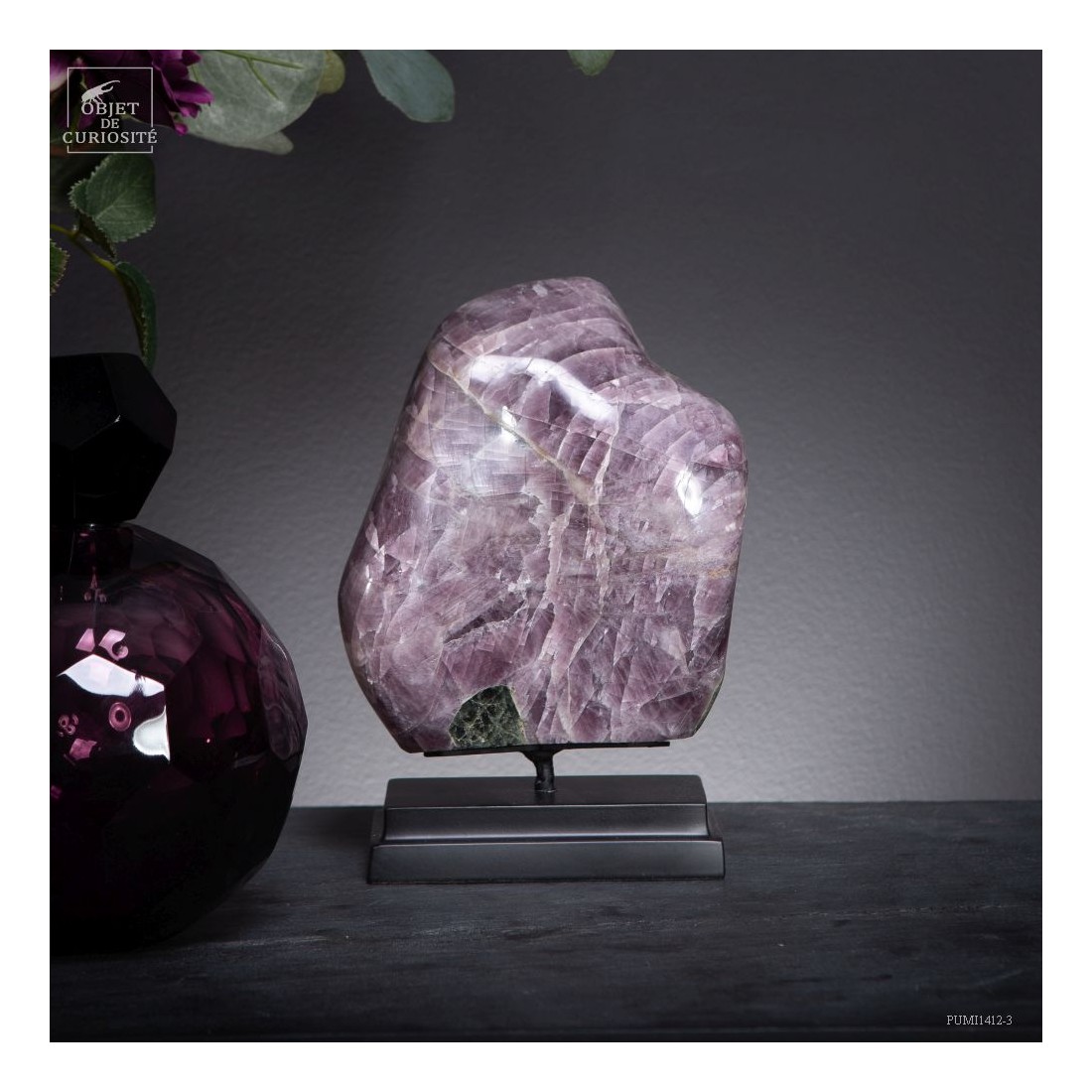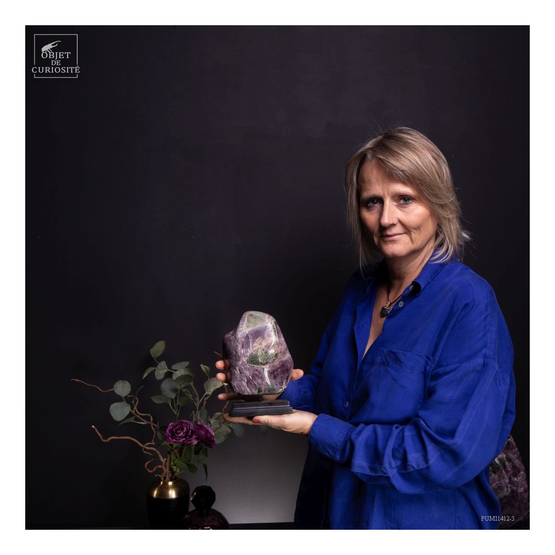 Cette Anhydrite violette de Madagascar n'est pas un minéral qui s'est formé directement, mais il est le résultat de la déshydratation d'un gypse. La perte d'eau entraîne une perte de volume parmi les couches de roche, provoquant parfois des crevasses entre les couches. L'Anhydrite est un sulfate de Calcium anhydre -CaSO4-, mais il se rencontre plus souvent de couleur blanche ou parfois bleutée. Cet exemplaire s'est teinté de mauve avec des reflets argentés dus aux longs cristaux qui le composent. Mais n'arrosez pas ce minéral, car il redeviendrait du gypse!