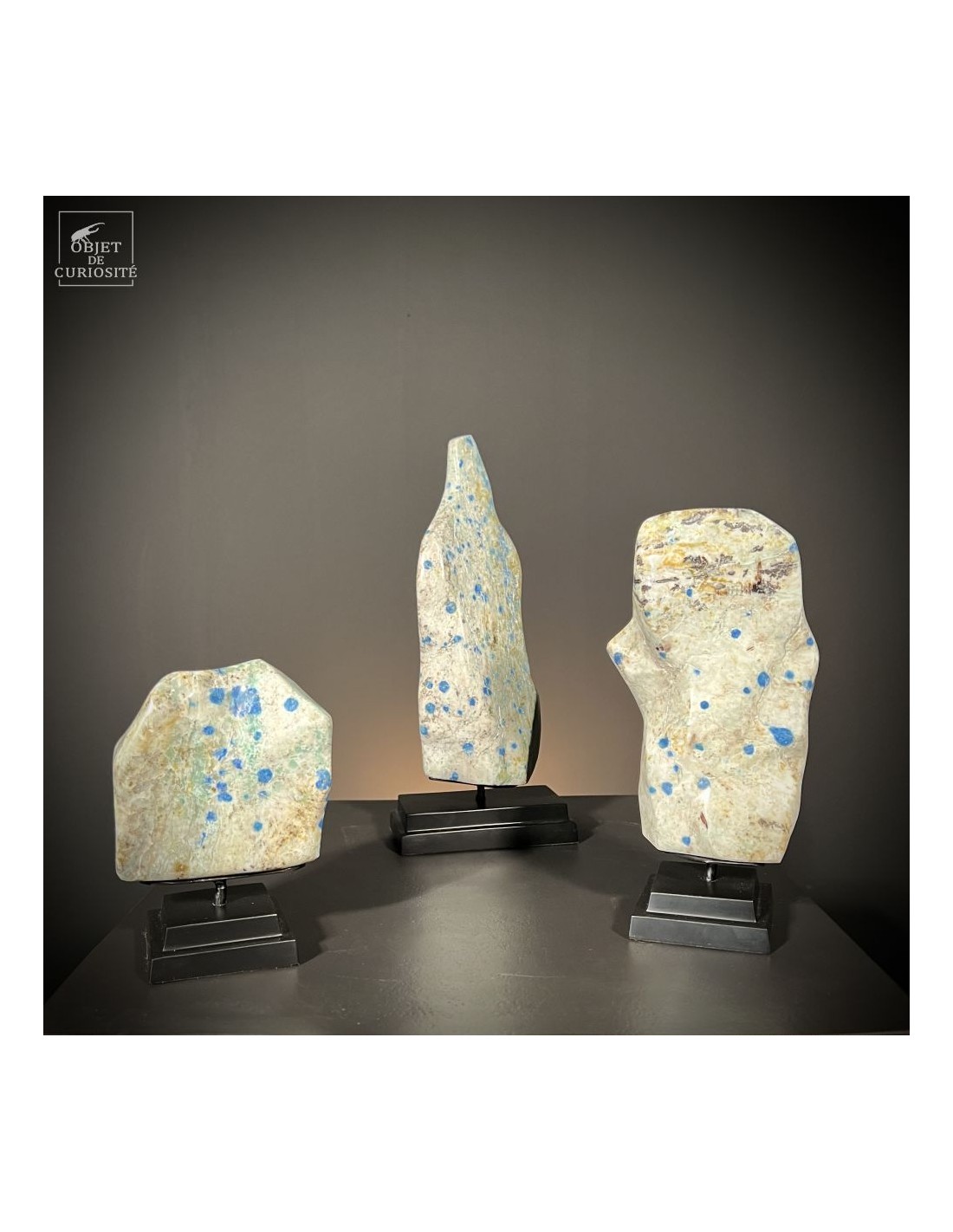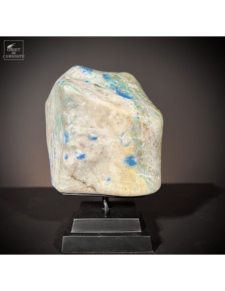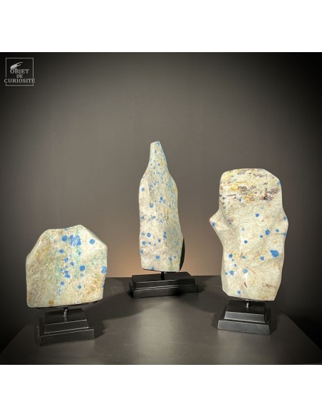 Ce minéral surprenant et rare tient son nom de la 2ème montagne la plus haute au monde: le K2. Ce granite blanc semble tâché par des gouttes d'encre bleu, mais c'est bien de l'Azurite -le composant le plus bleu du lapis Lazuli- sous forme d'orbes. ces deux minéraux ne se rencontrent presque jamais ensemble, mais la rareté de cette Ketonite vient aussi des difficultés d'exploitation de la mine artisanale, en altitude à la frontière du Pakistan et de la Chine, dans la chaîne du Karakoram. Un minéral que peu de gens ont déjà croisé: le plaisir de la rareté !
