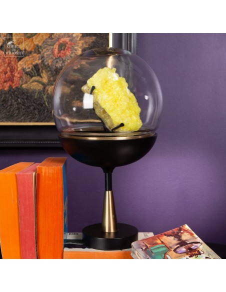 Présenté sous un globe bulle en verre, avec une base en laiton et des finitions noires, cet assemblage met en valeur la brillance et la structure unique de ce minéral. Chaque détail de la présentation souligne son caractère à la fois naturel et travaillé.