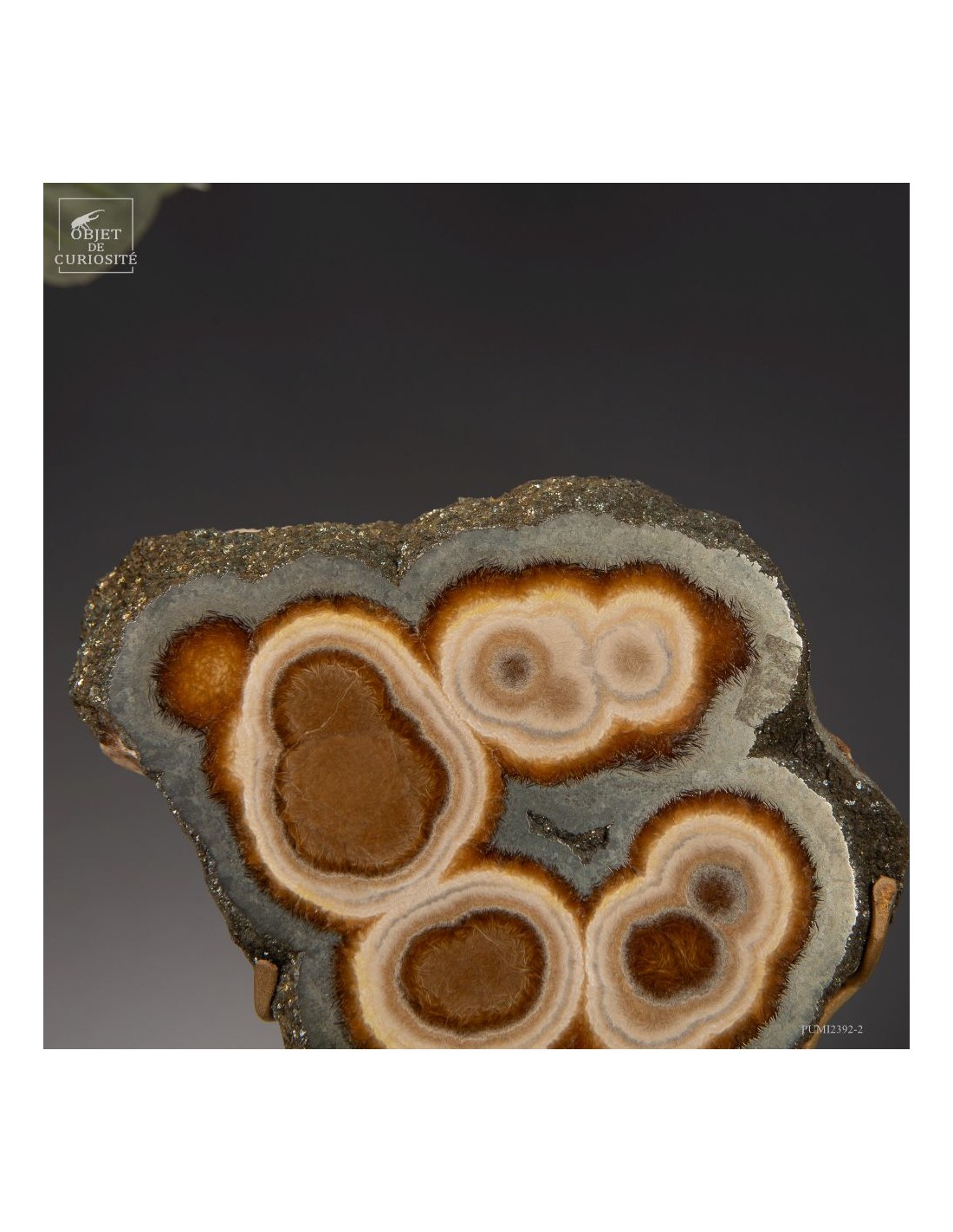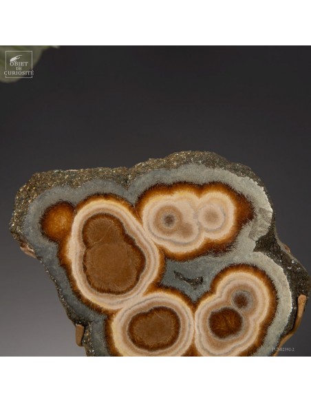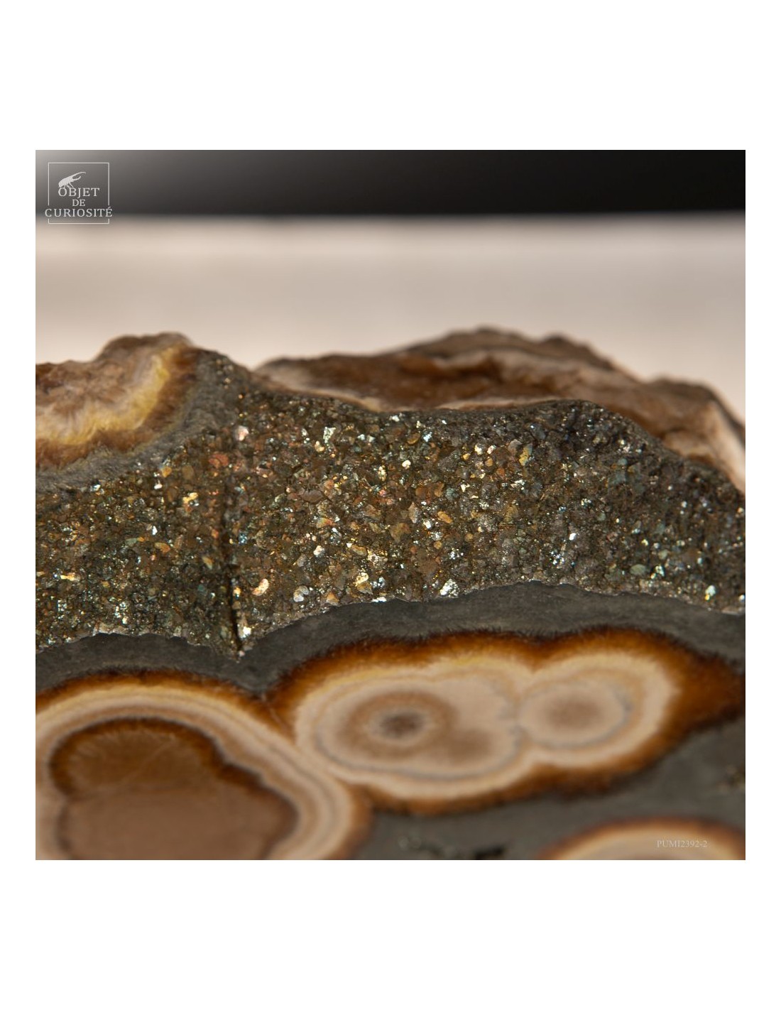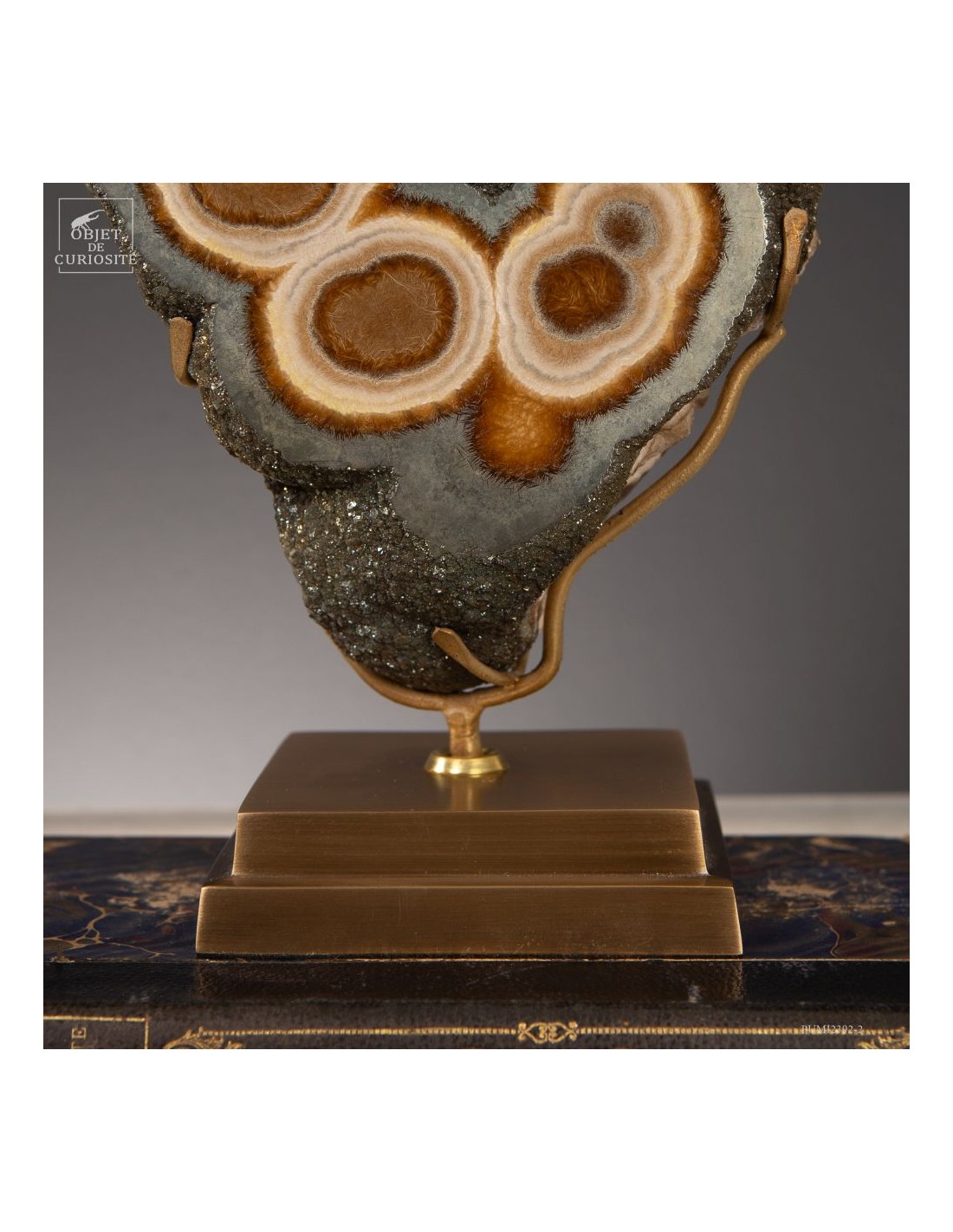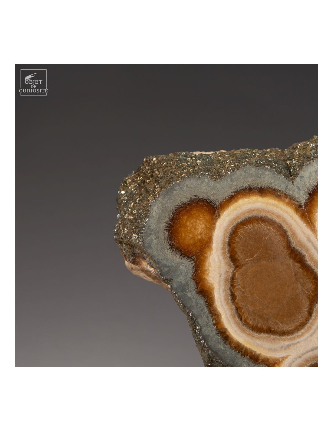 Ces beaux tons chauds de marron et or sont une cristallisation de Marcasite autour d'un nodule de Baryte. Ces minéraux arrondis (botryoidal) -appelés "minéraux en forme de rein" en Anglais- viennent de la mine de Lubin en Pologne, ou 1000 personnes travaillent aujourd'hui dans des mines de cuivre et d'argent. En creusant, ils découvrent parfois des poches creuses dont les parois sont tapissées de ces nodules de Baryte beige/brun qui forment des mini collines, et qui ont été recouverts d'une couche de Marcassite. Donc un disulfure de fer, proche de la Pyrite. On reconnaît la forme caractéristique en lamelles des cristaux de Baryte au cœur des nodules. Et c'est beau!
