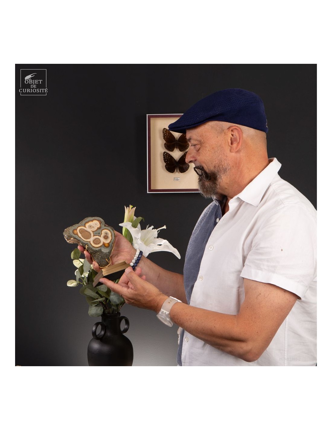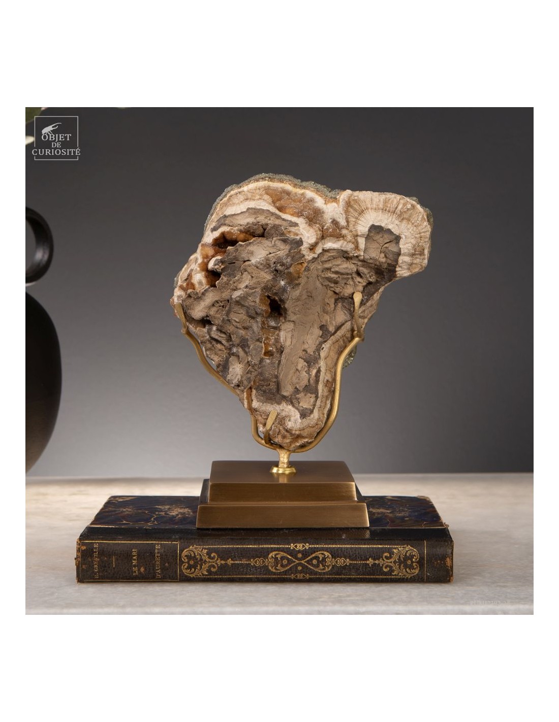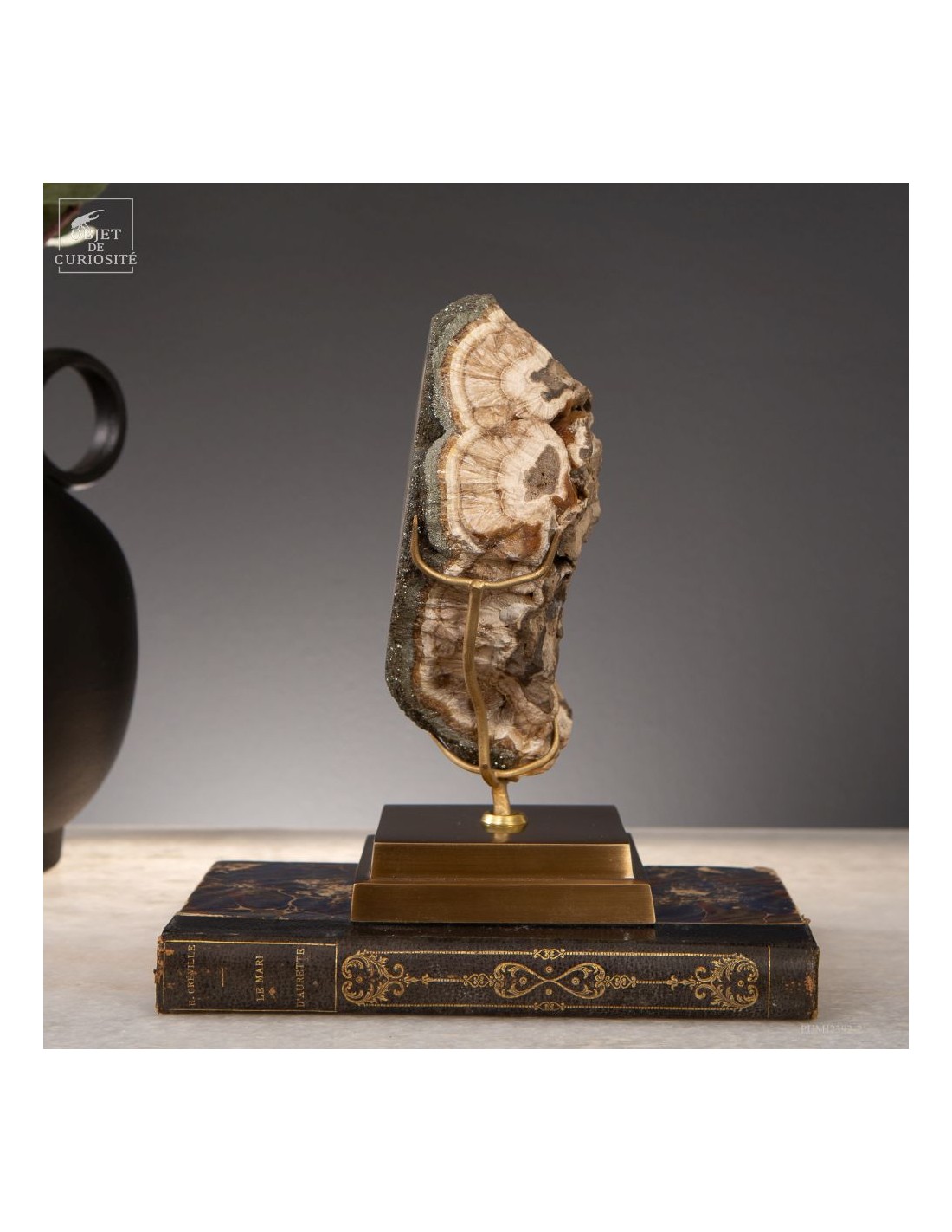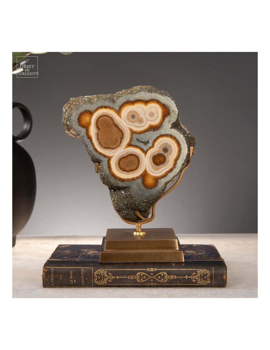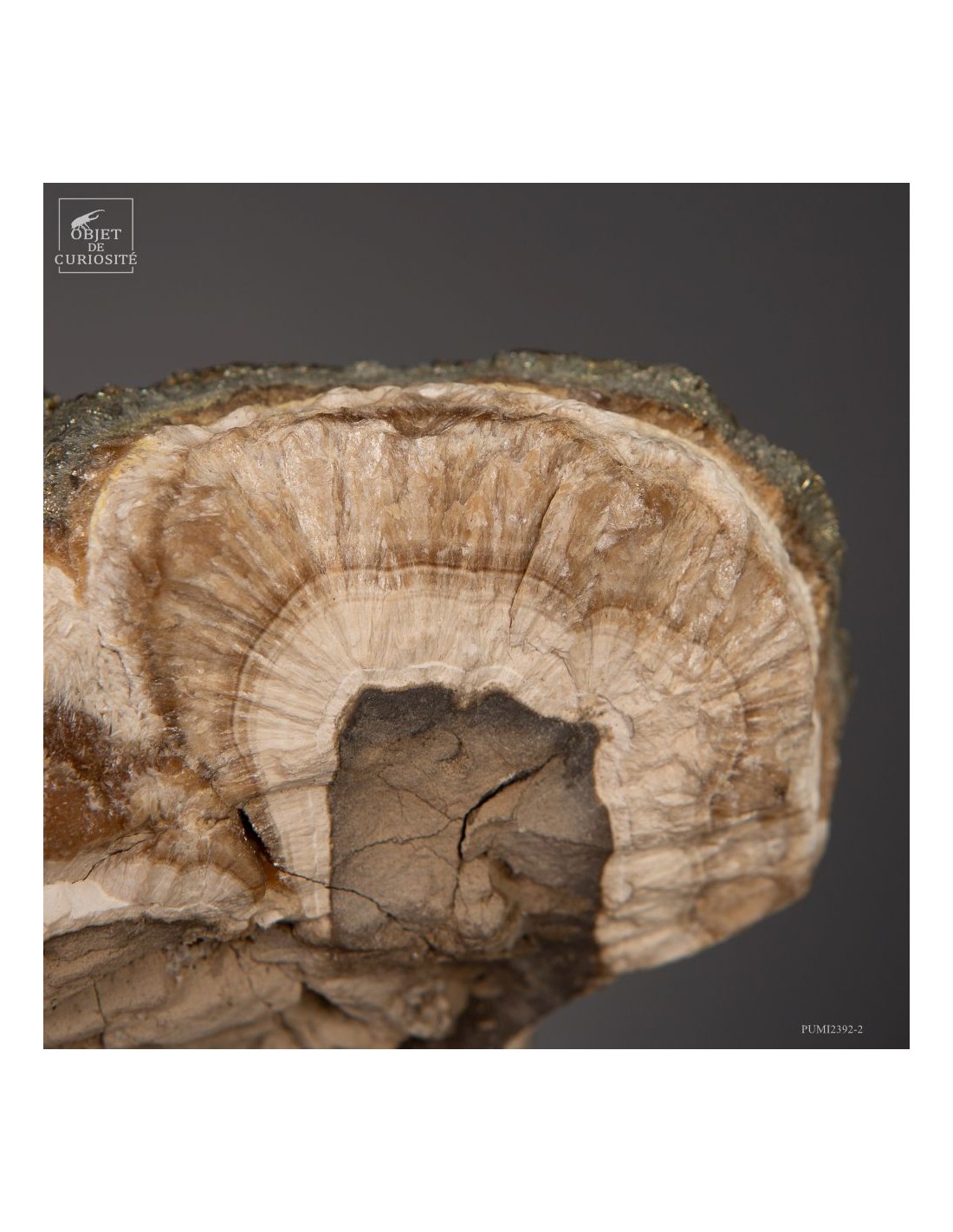 Ces beaux tons chauds de marron et or sont une cristallisation de Marcasite autour d'un nodule de Baryte. Ces minéraux arrondis (botryoidal) -appelés "minéraux en forme de rein" en Anglais- viennent de la mine de Lubin en Pologne, ou 1000 personnes travaillent aujourd'hui dans des mines de cuivre et d'argent. En creusant, ils découvrent parfois des poches creuses dont les parois sont tapissées de ces nodules de Baryte beige/brun qui forment des mini collines, et qui ont été recouverts d'une couche de Marcassite. Donc un disulfure de fer, proche de la Pyrite. On reconnaît la forme caractéristique en lamelles des cristaux de Baryte au cœur des nodules. Et c'est beau!