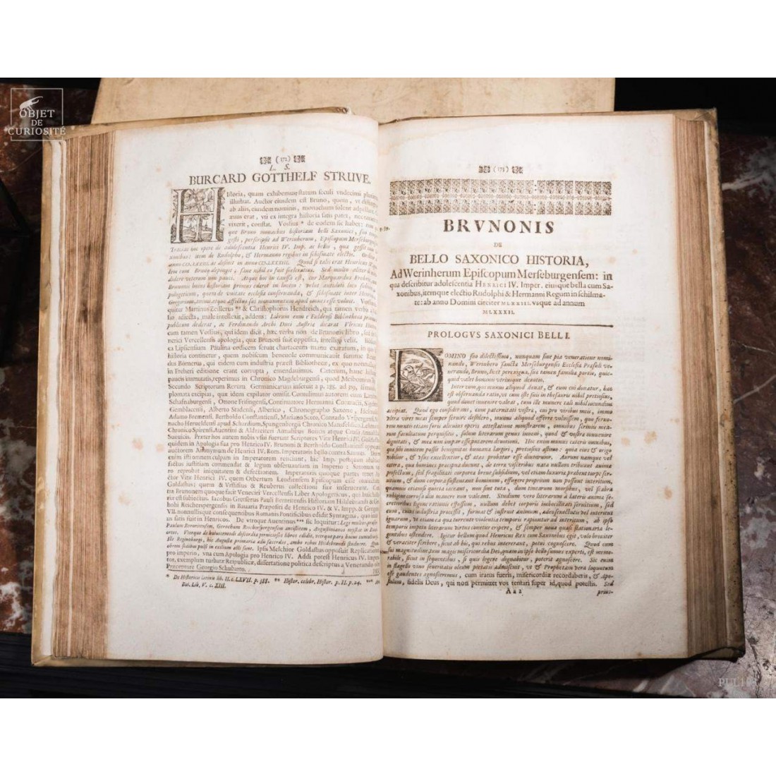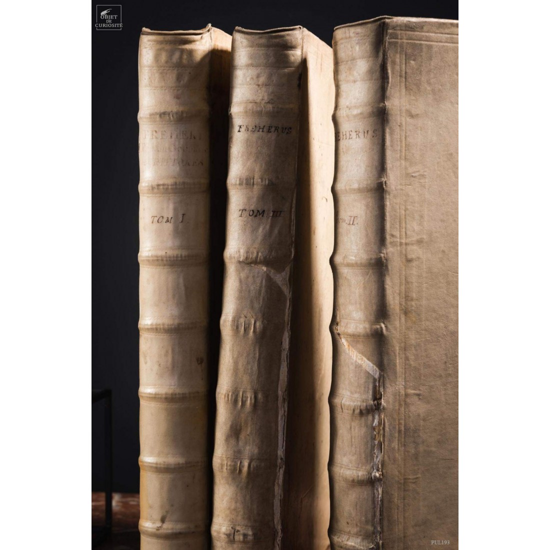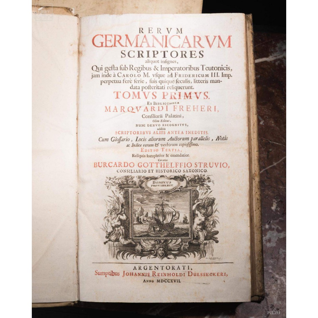 Ces 3 volumes imprimés en 1717 à Strasboug sont la deuxième édition de cette histoire de l'Empire Teutonique. Marquard Freher (1565-1614) avait publié la première version en 1600. L'auteur est un juriste Allemand, mais qui exerça aussi en tant que journaliste, historien et diplomate. Ces ouvrages sont recouverts de vélin: une peau de veau très fine -traditionnellement de veau mort-né-. Le volume deux présente quelques fentes de retrait dans le vélin du dos. Les ouvrages sont en latin.
