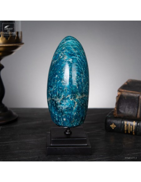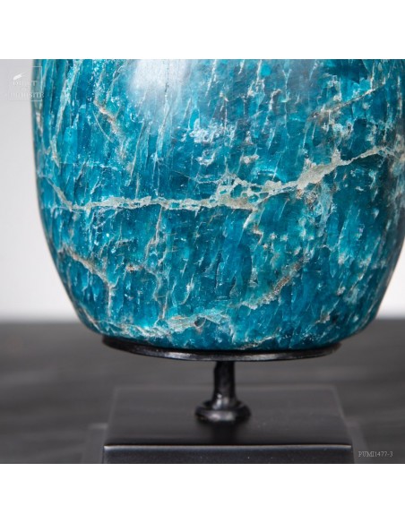 Venue de L'extrême Sud Est de Madagascar -Betroka- Les meilleures Apatite bleue proviennent d’une mine exploitée par Norcross. L’apatite peut être trouvée de vert à bleu, mais les plus belles Apatite bleues sont comme celle-ci : une vue au-dessus d’un océan rugissant. Provenant d’une origine hydrothermale, et se formant dans les veines, c’est un phosphate de calcium. Et le plus souvent une Fluorapatite, car elle contient de la fluorite. Mais le nom commercial reste l'Apatite bleue...sur la photo de groupe, c'est celle du milieu.
