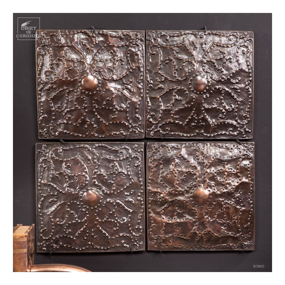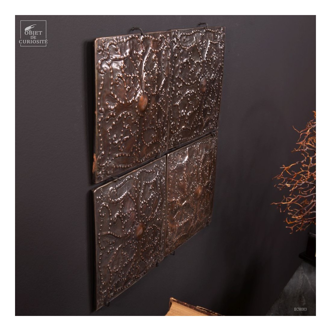 Tonalité bronze-cuivrée. Peut être collé au mur avec du mastic-colle, ou fixé avec des minis équerres. Peut-être posé en frise ou toute autre composition. 20cm x 20cm