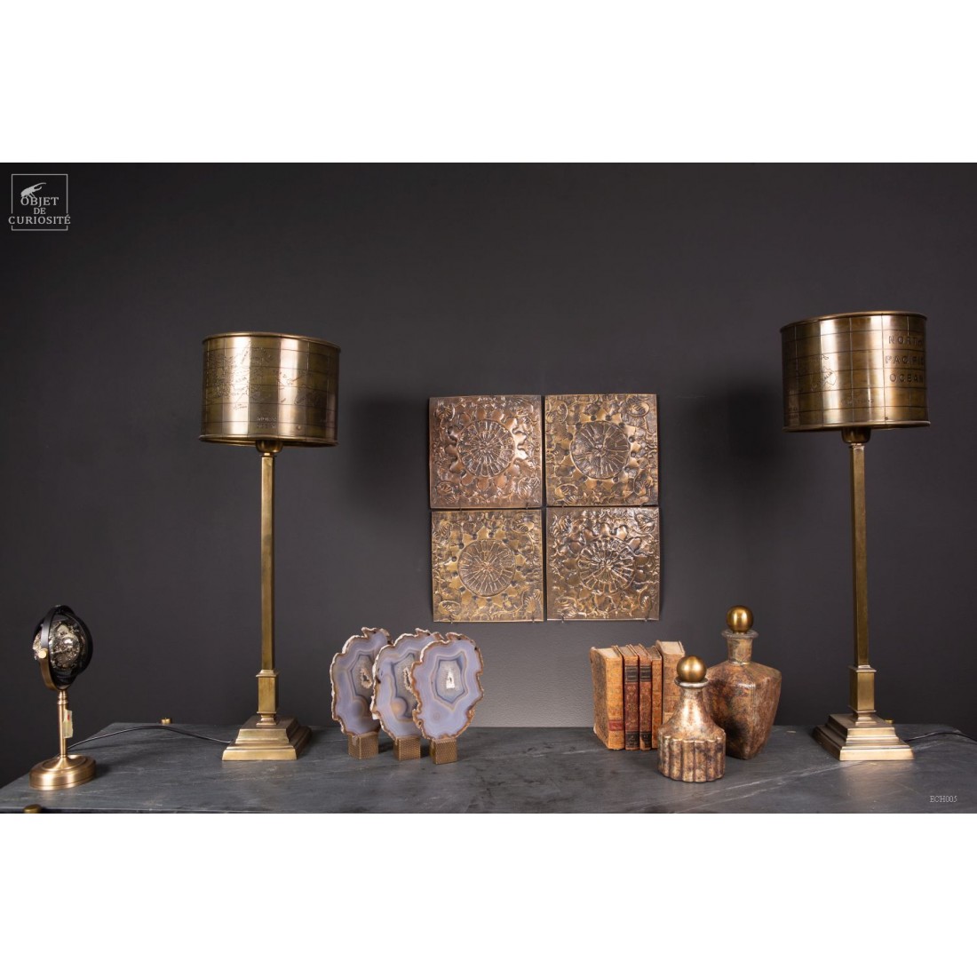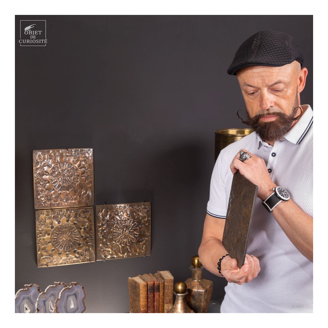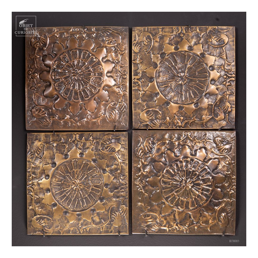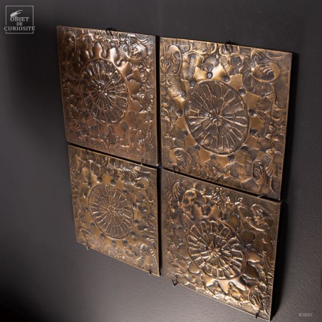 Tonalité bronze-laiton. Peut être collé au mur avec du mastic-colle, ou fixé avec des minis équerres. Peut-être posé en frise ou toute autre composition. Une tête de lit? 20cm x 20cm. Il existe aussi le même motif en 80cm x80cm.