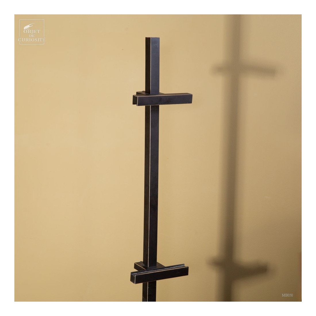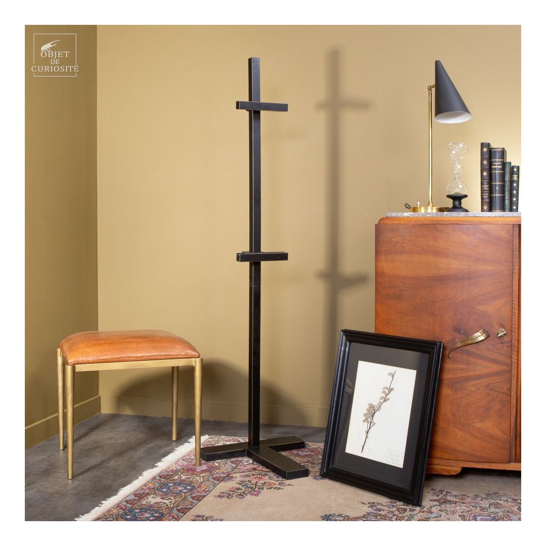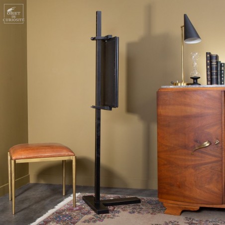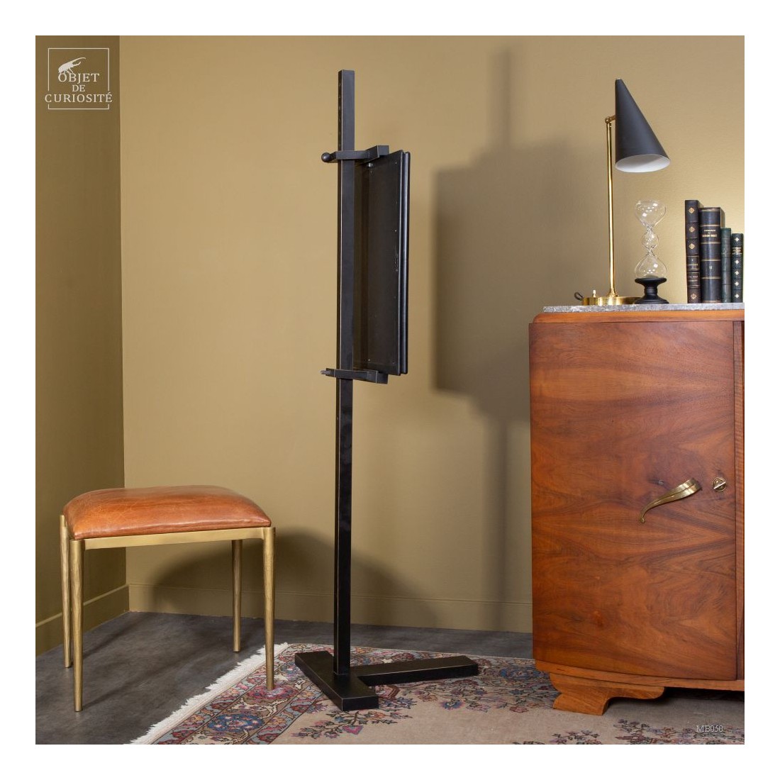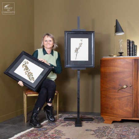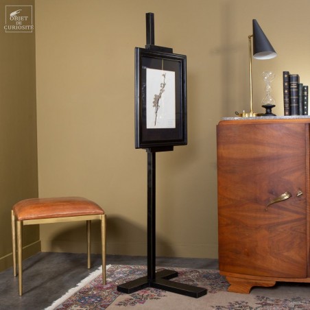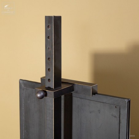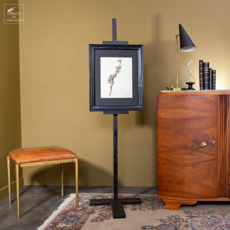 La simplicité du bois noir légèrement usé sur les arrêtes (du hêtre massif), car la star c'est le tableau ou la photo que vous mettrez en valeur... Il est réglable en hauteur: de 50cm à 83cm avec des emplacements déjà prévus. Si vous aviez un cadre plus haut, il y a toujours une possibilité pour un emplacement supplémentaire...