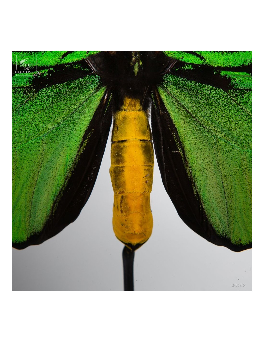 Le plus commun des papillon à ailes d'oiseaux -Ornithoptera Priamus- n'est en fait pas aussi commun, car il ne se trouve que dans quelques petites îles du Pacifique: Papouasie Nouvelle Guinée, Sud des îles Molluques, Iles Salomon... Des îles où leurs forêts diminuent année après année sous l'influence des hommes. C'est pourquoi cette espèce protégée sera livrée avec un CITES. Seuls les mâles possèdent ces couleurs éclatantes, les femelles sont encore plus grandes, mais de couleur marron. Ils sont tellement remarquables que nos spécimens viennent désormais d'une ferme en Indonésie.