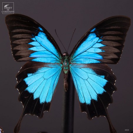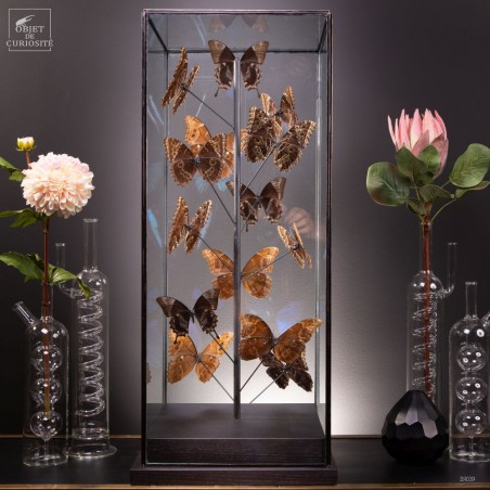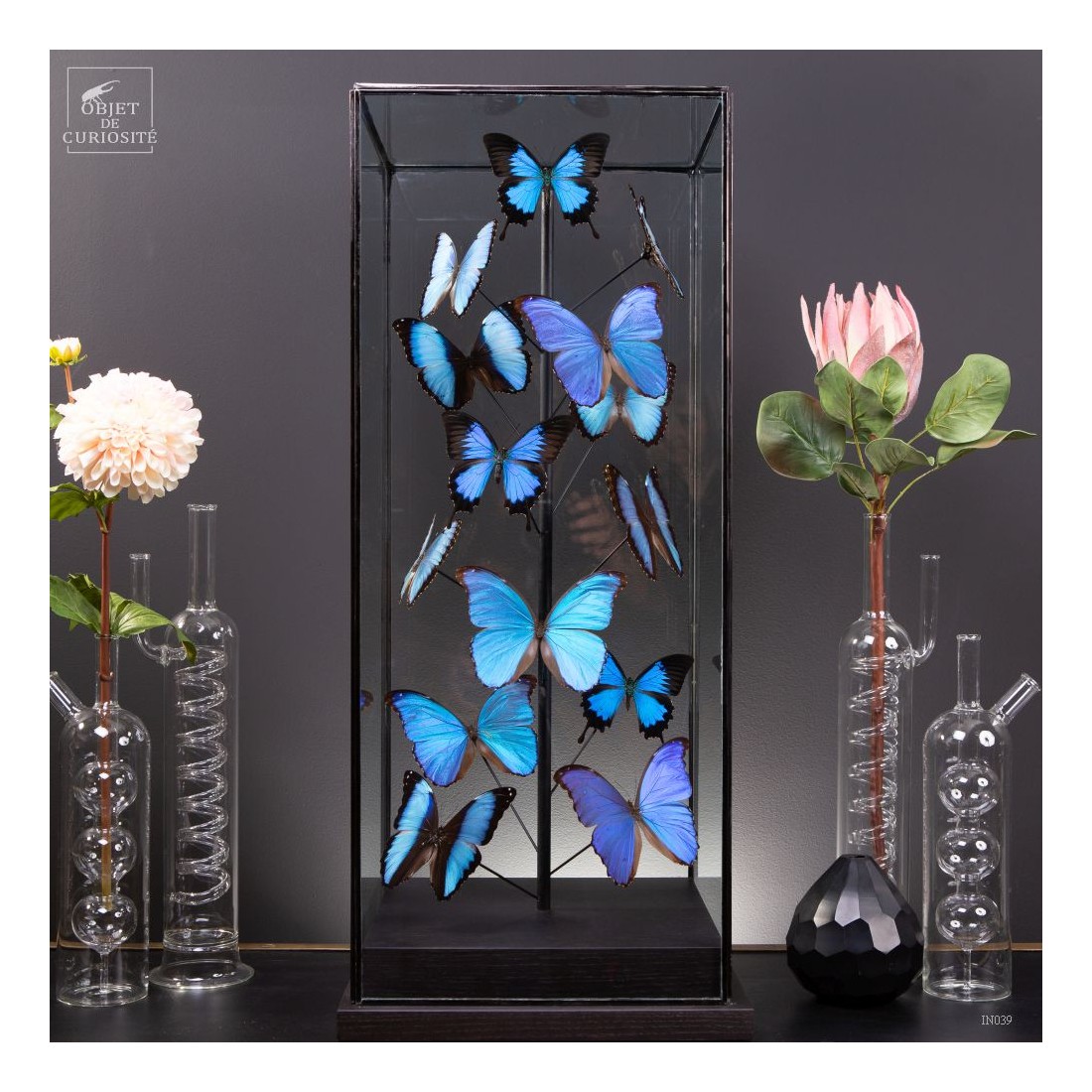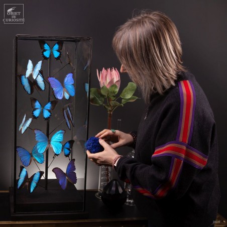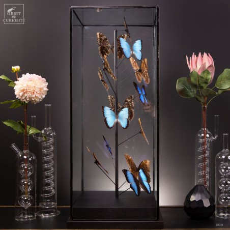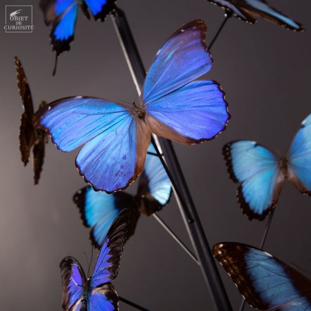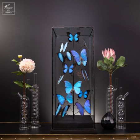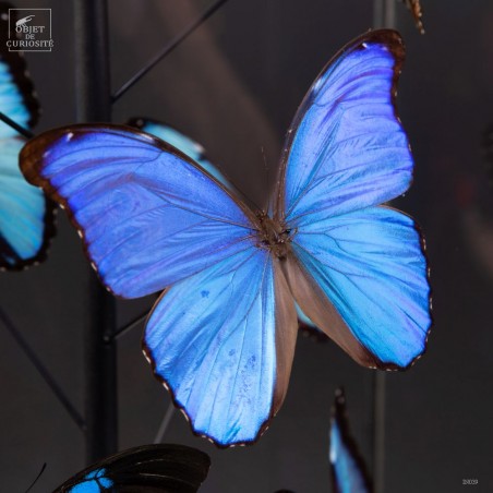 Papillons bleus morphos (14) sous globe carré Ht 77cm