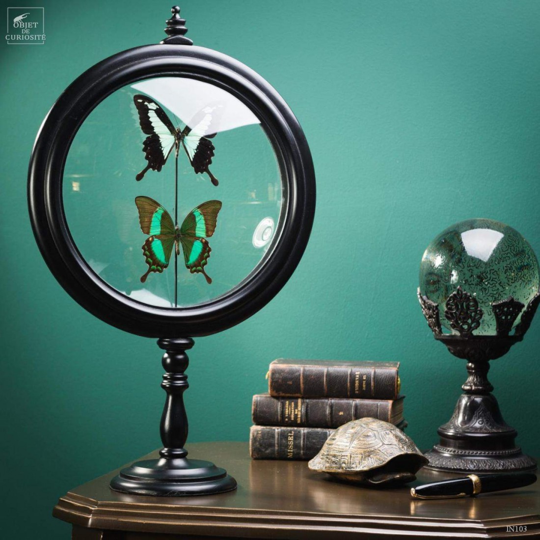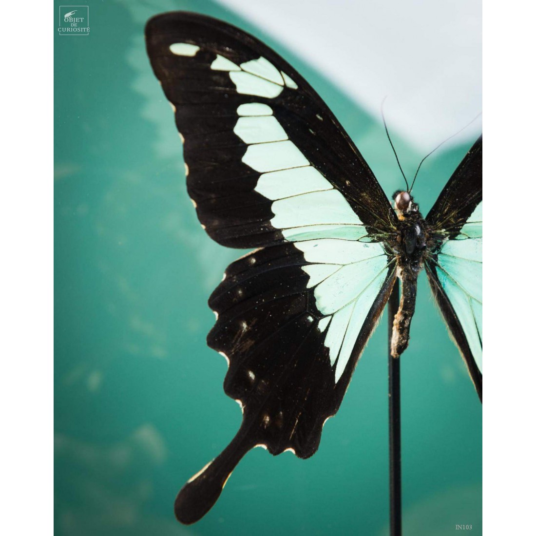 Ces deux papillons très colorés sont le Papilio Palinurus de Malaisie. Il a les ailes vert mousse et est surnommé le Machaon émeraude. Il se trouve en haut, avec cette large bande vert émeraude qui traverse ses ailes. Celui du dessous est un Papilio Phorcas, ou Machaon vert-pomme. Celui-ci se rencontre en Afrique.