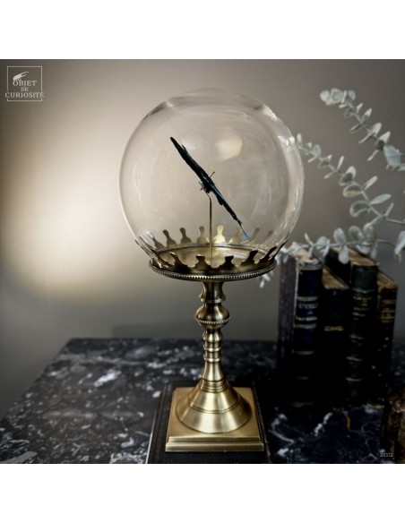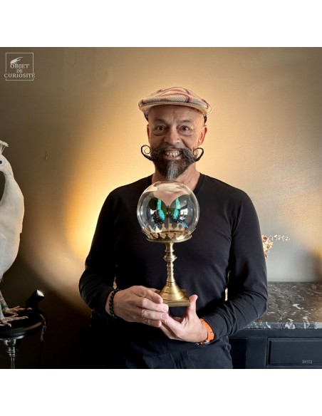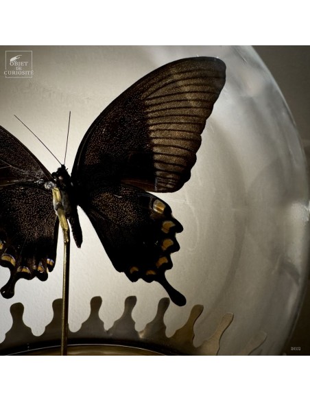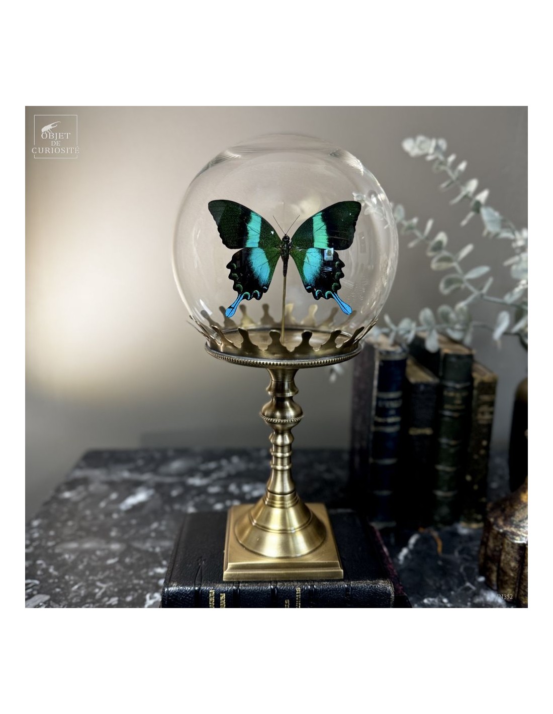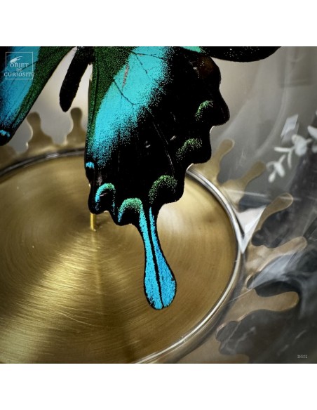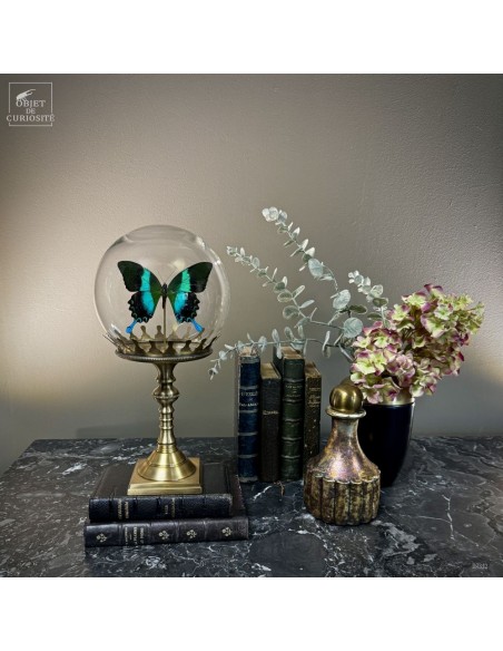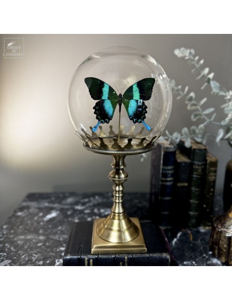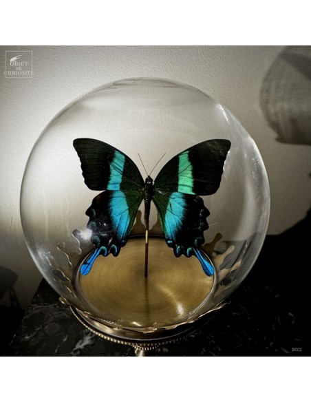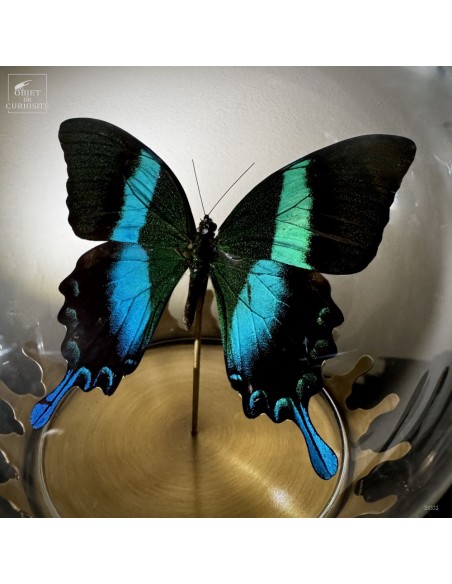 Le Papilio Blumei est un papillon diurne aux ailes vertes allant jusqu'au bleu sur les pointes. On le trouve à Bornéo, Sulawesi et en Papouasie-Nouvelle-Guinée. Il a une envergure de 12 à 14 cm. Et le plus dur, est de le faire entrer dans cette bulle de verre! Sur une base en laiton.