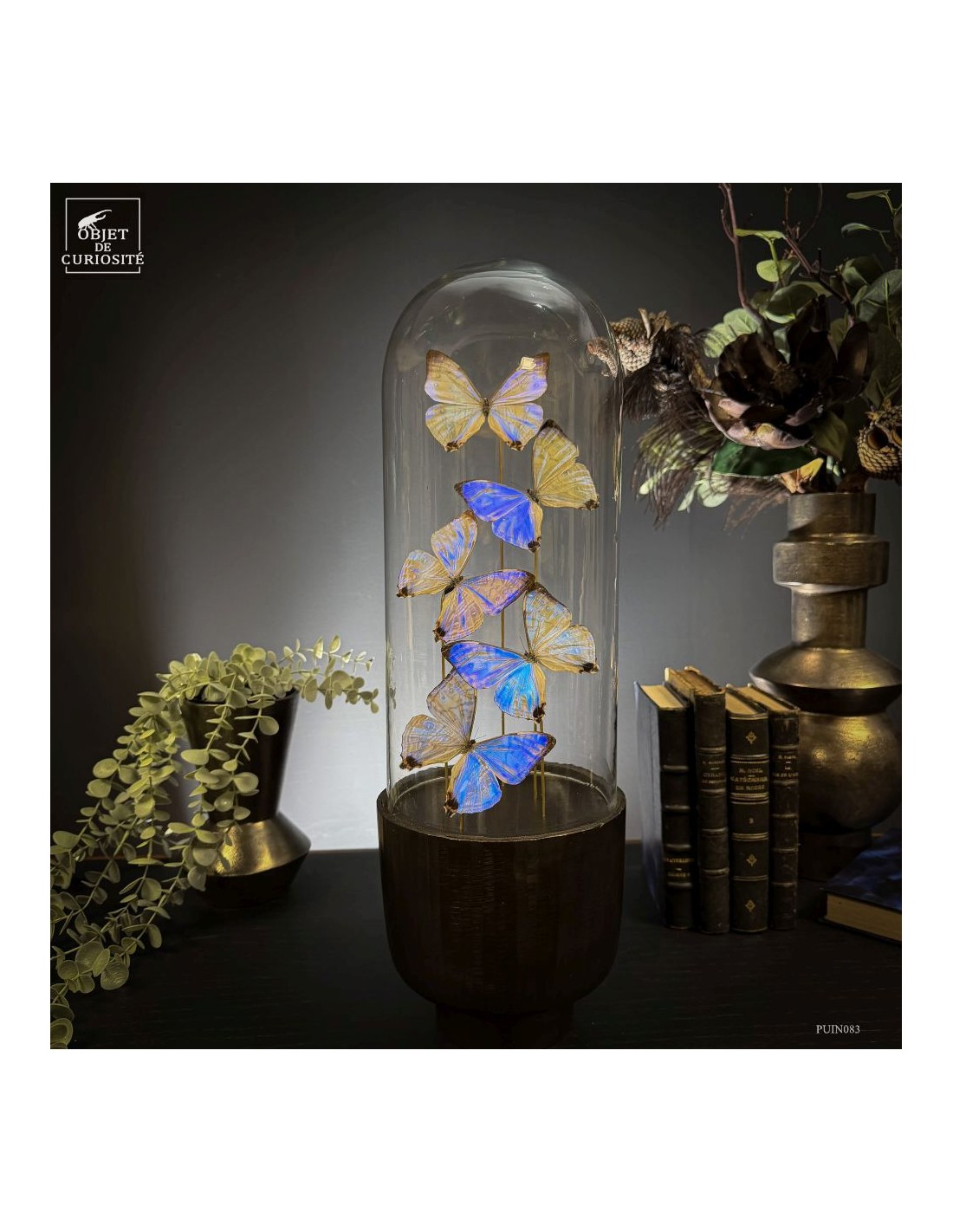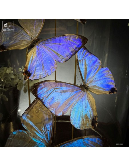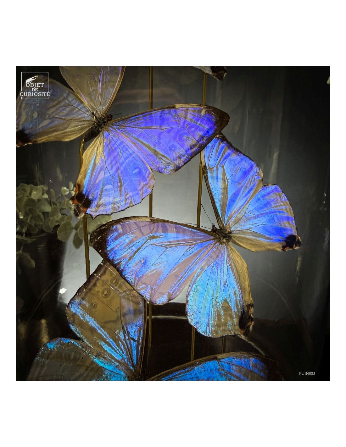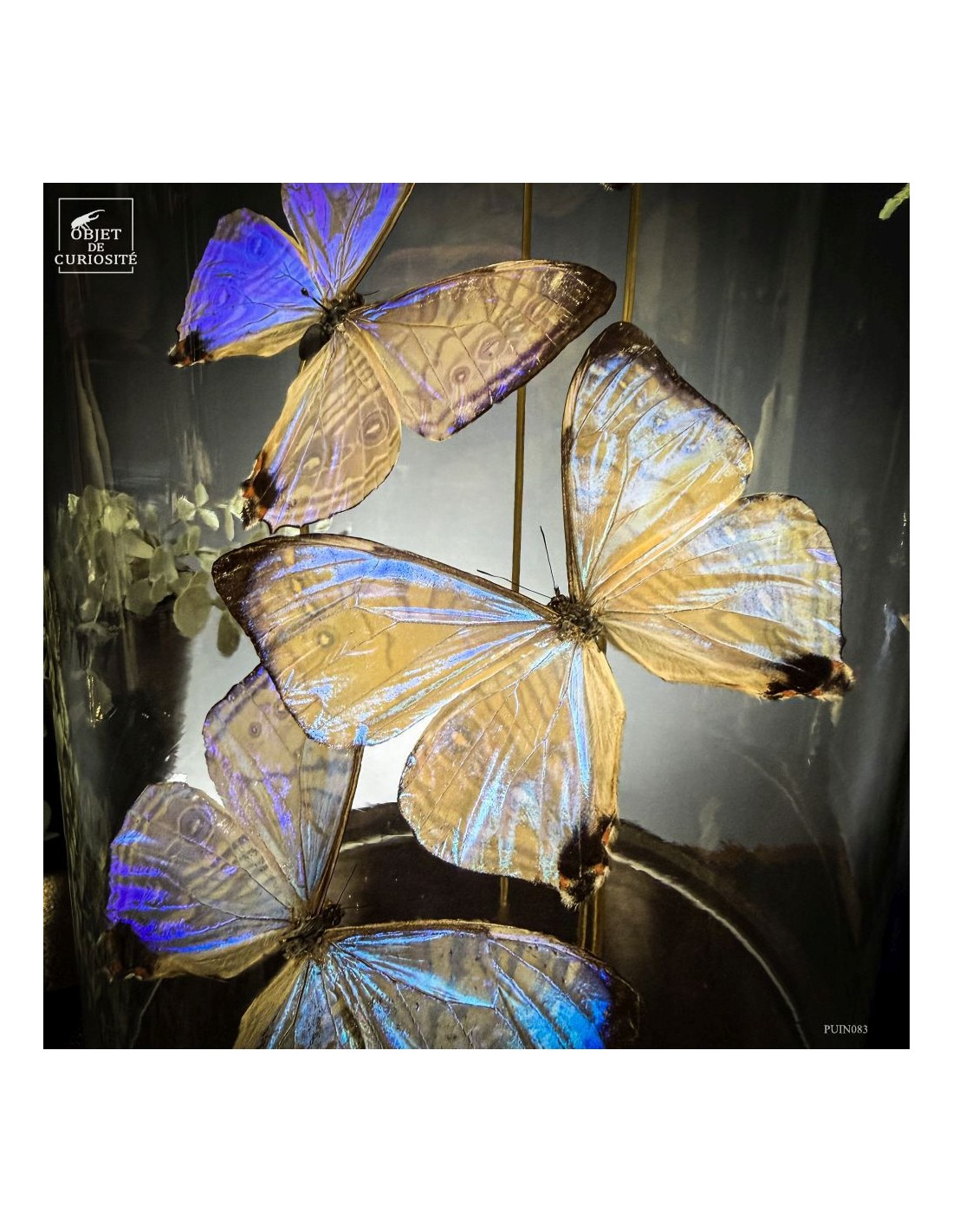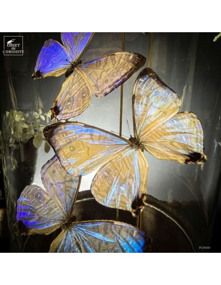 Ces cinq papillons MORPHO SULKOWSKII, originaires des forêts tropicales andines (Colombie). Ils se distinguent des autres morphos par leurs teintes opalines, tirant vers l’argenté et le bleu pâle, parfois avec un léger reflet rose. Cette iridescence singulière est due à la structure microscopique des écailles de leurs ailes, qui diffractent la lumière sans pigment.
