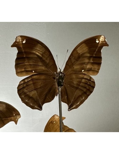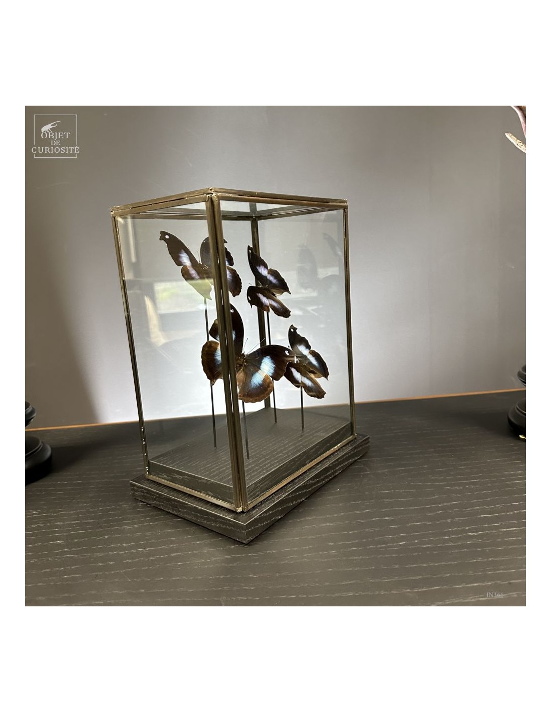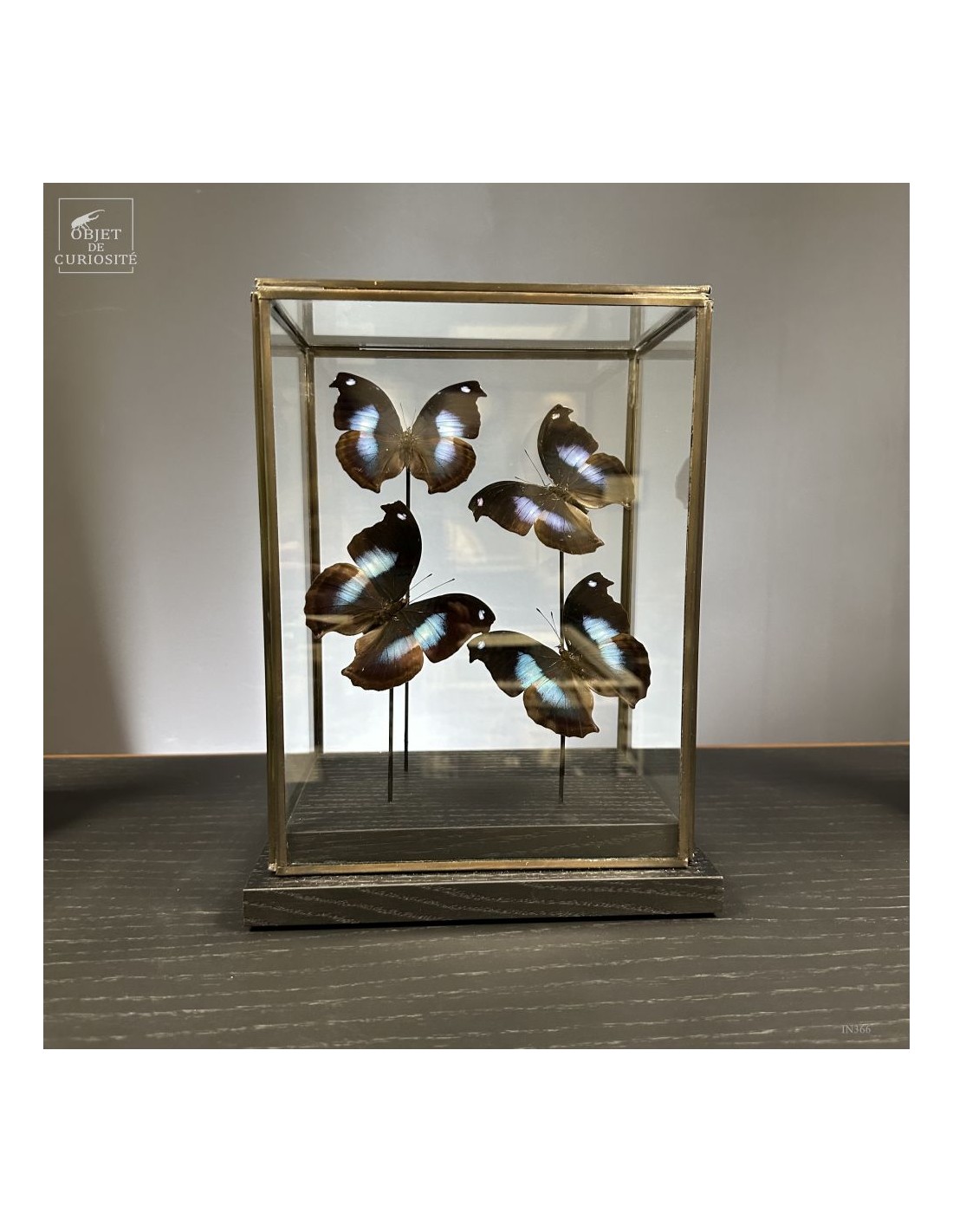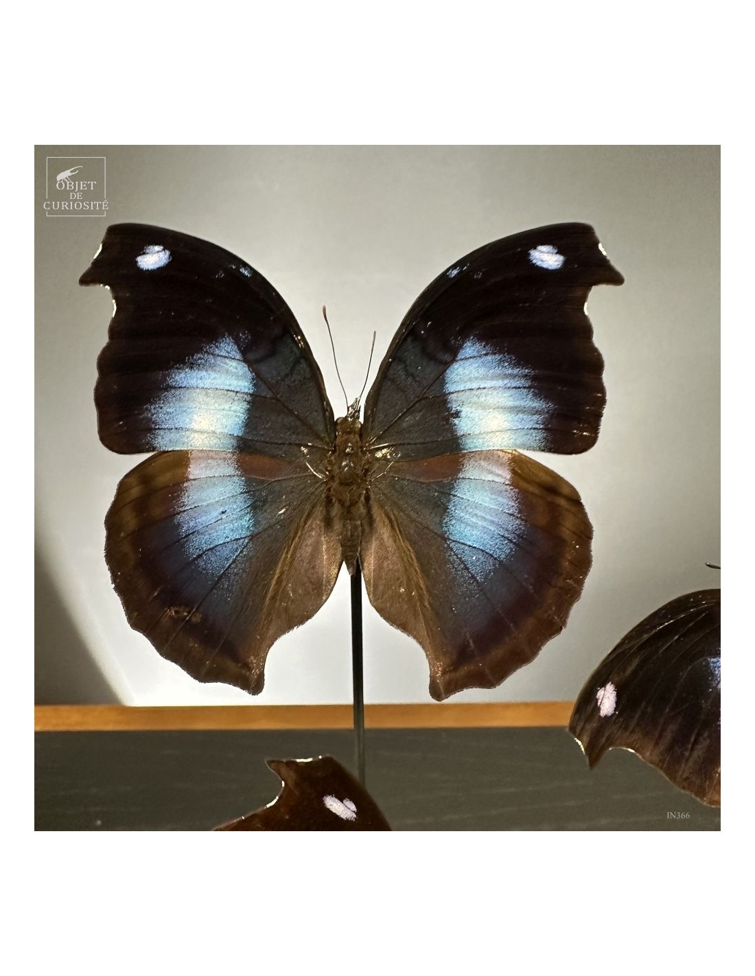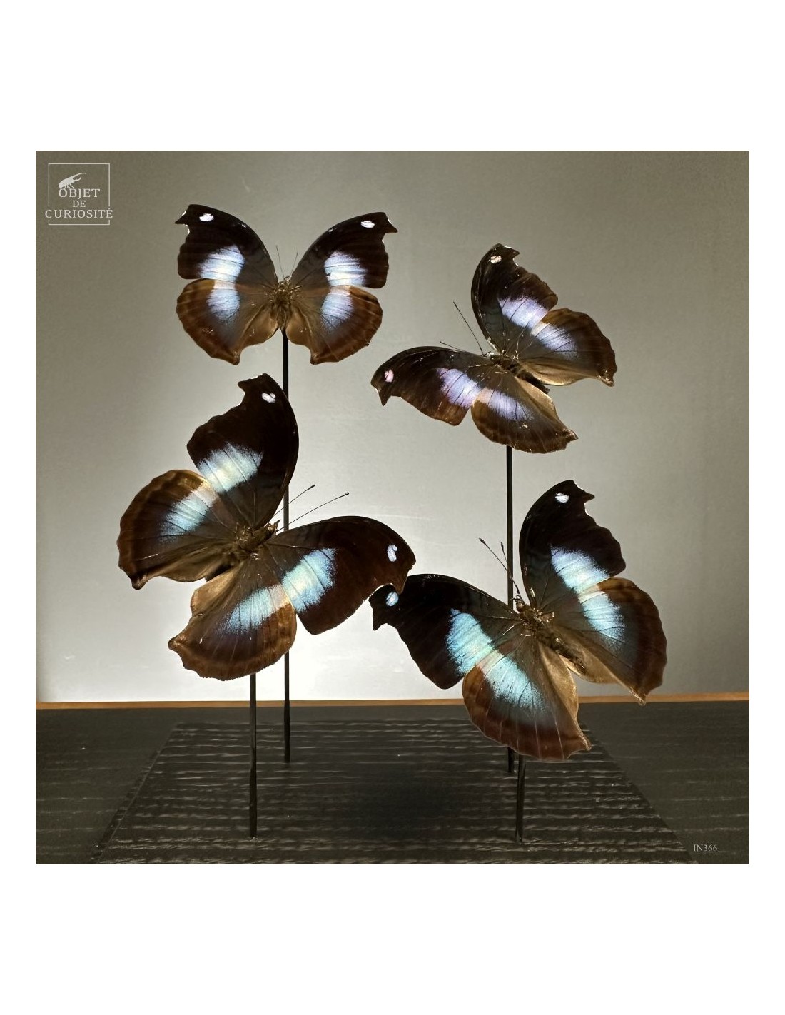 Ces quatre spécimens de NAPEOCLES JUCUNDA, originaires des forêts tropicales d’Amérique du Sud, présentent une teinte bleu-gris légèrement irisée. Chez cette espèce, la face dorsale affiche un éclat discret, presque minéral, tandis que le revers brun reste parfaitement camouflé dans l’environnement naturel.
