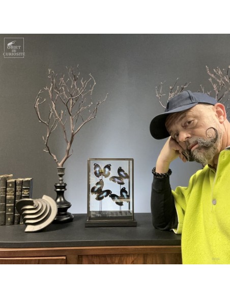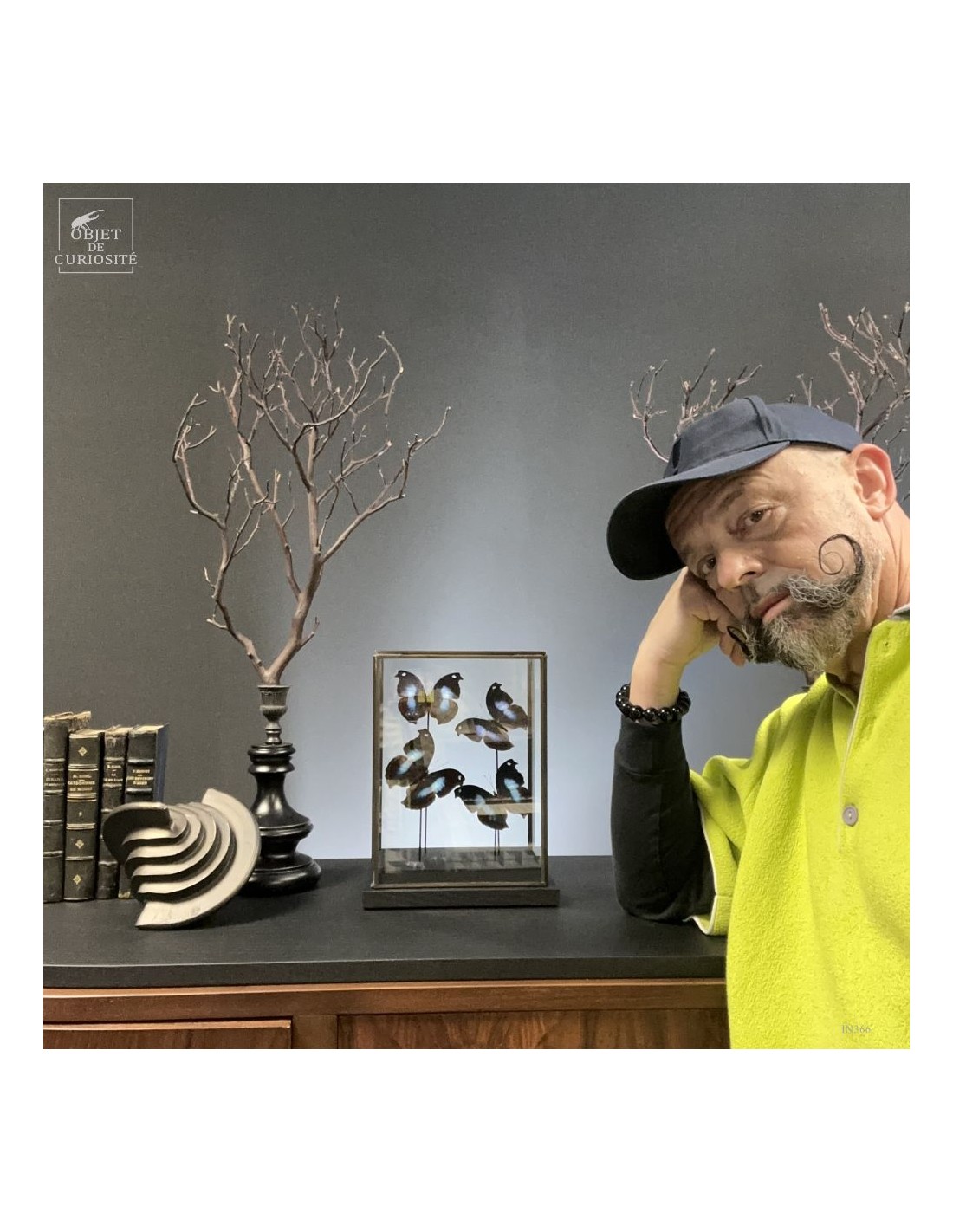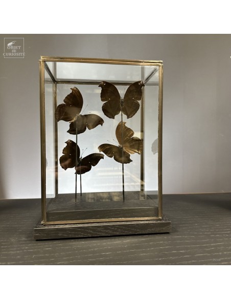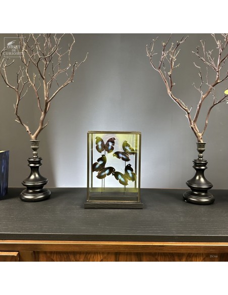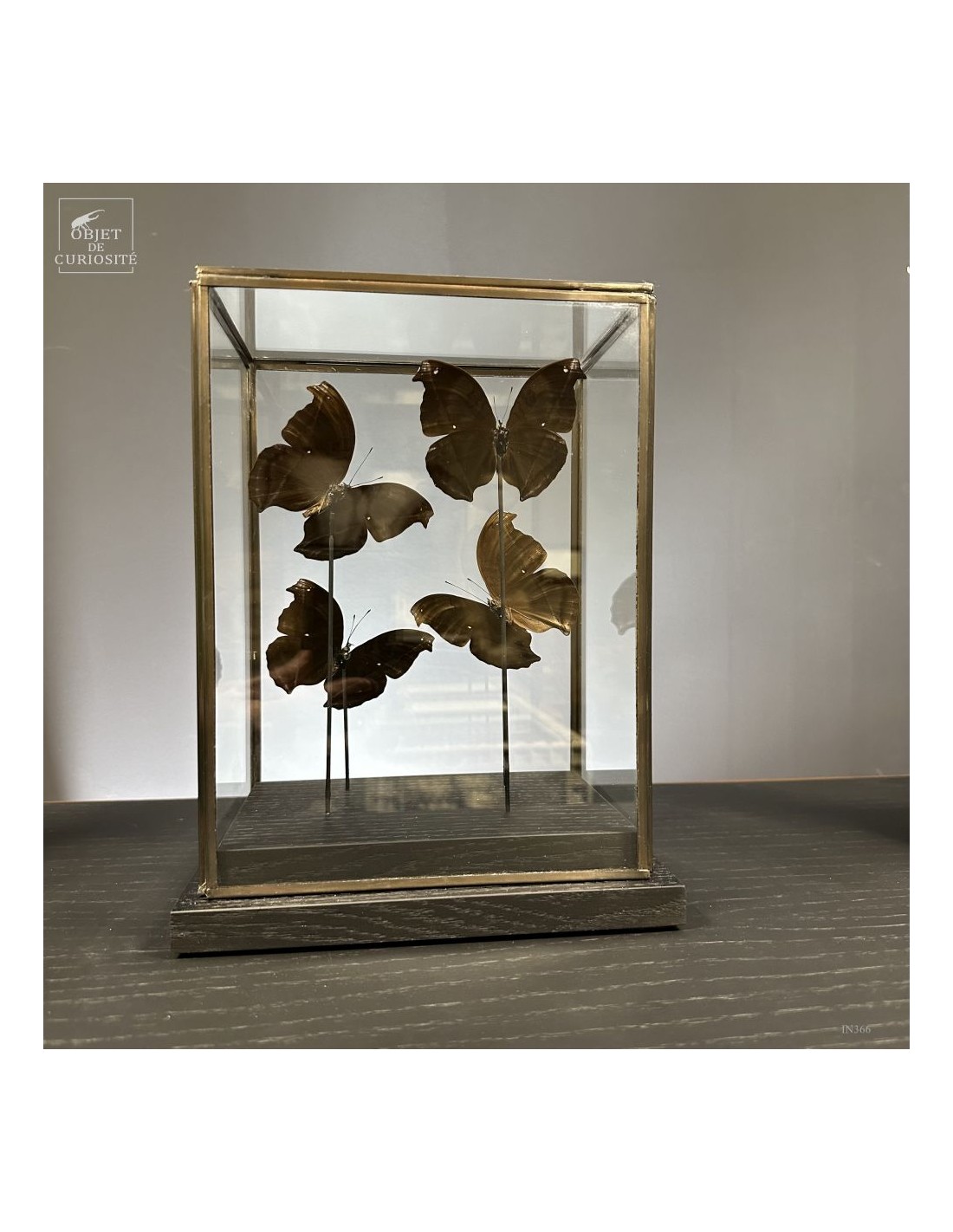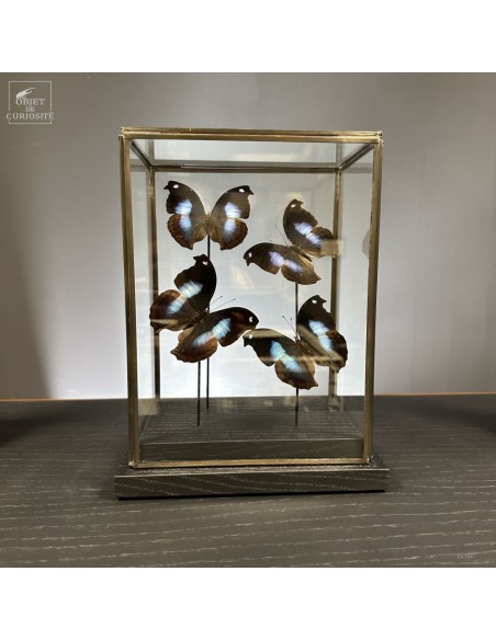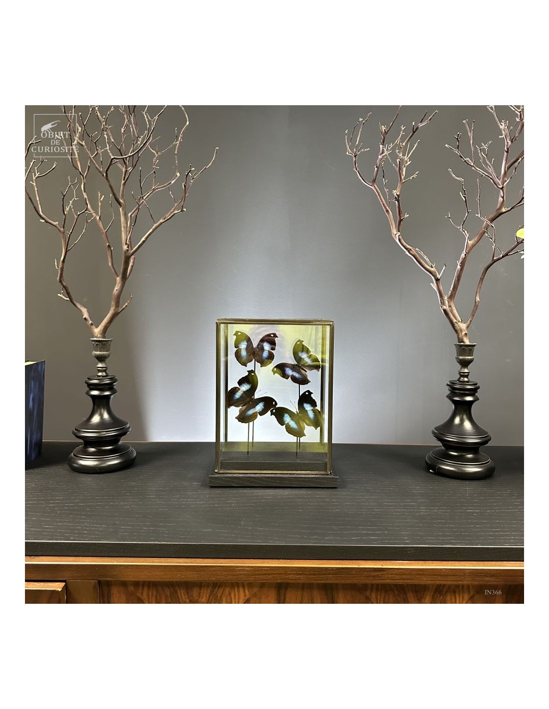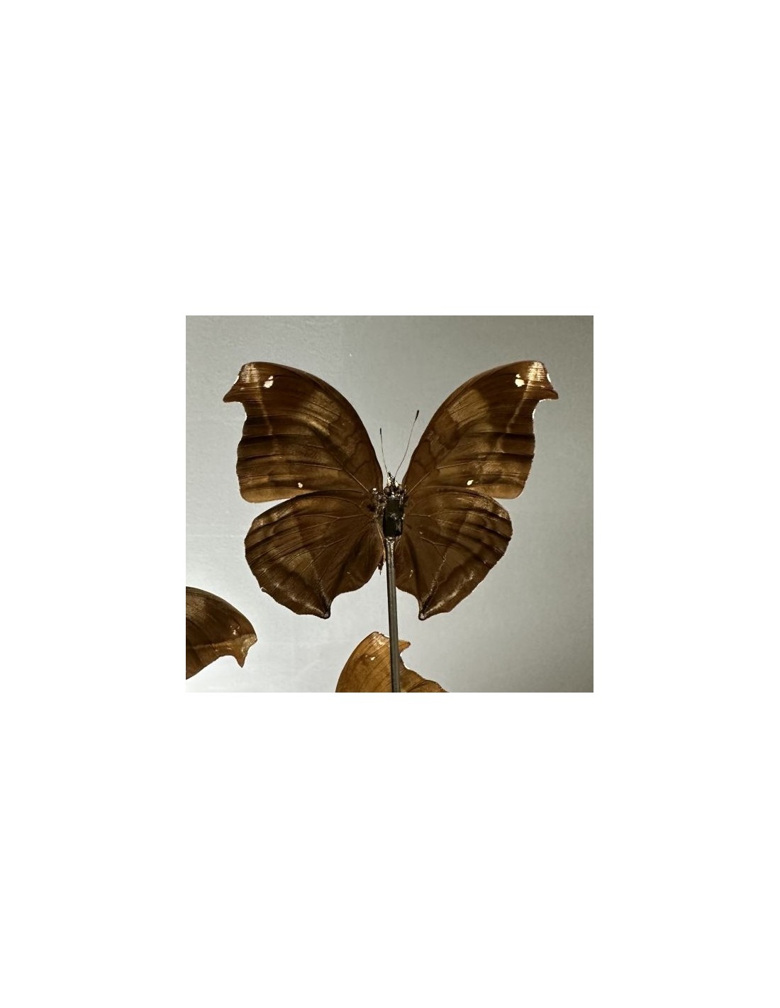 Ces quatre spécimens de NAPEOCLES JUCUNDA, originaires des forêts tropicales d’Amérique du Sud, présentent une teinte bleu-gris légèrement irisée. Chez cette espèce, la face dorsale affiche un éclat discret, presque minéral, tandis que le revers brun reste parfaitement camouflé dans l’environnement naturel.