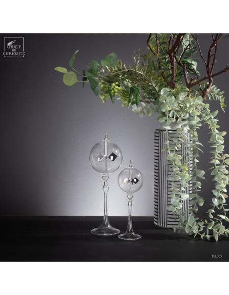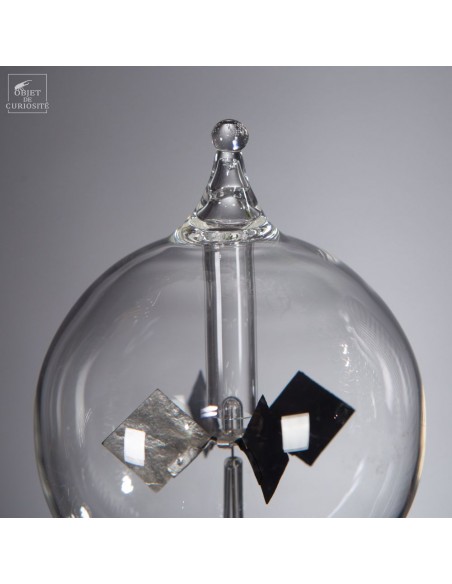 Radiomètre transparent intégral (le RA025 est plus grand) - Le radiomètre est composé d’une sphère en verre vidée en partie de son air, dans laquelle est posé, sur un axe, un ensemble de 4 pales en mica ayant chacune une face noircie et l'autre argentée. Ce dispositif a été inventé en 1873 par William Crookes,. Depuis Einstein, il est admis que c’est la différence de température des faces qui créent un déplacement des molécules d’air, entraînant les ailettes : les faces noires absorbent les photons du rayonnement infrarouge et donc s'échauffent plus, tandis que les brillantes les repoussent. L'air en contact avec la face foncée va se dilater et en s'écartant, les molécules vont la pousser, créant un mouvement comme par magie! Sans le vide partiel d'air l'expérience serait impensable car les frottements bloqueraient les pales, mais en son absence totale, le phénomène ne fonctionne plus non plus: un objet tout en finesse et en équilibre!