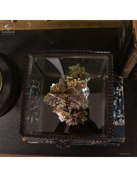 Sa surface irisée — aux reflets dorés, violets et verts — résulte d’une fine oxydation, indice d’un traitement non naturel. Ce choix de transformation découle d’une réalité : dans la nature, le bismuth est souvent trop diffus pour cristalliser ainsi, mais sa richesse géométrique méritait d’être révélée.