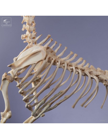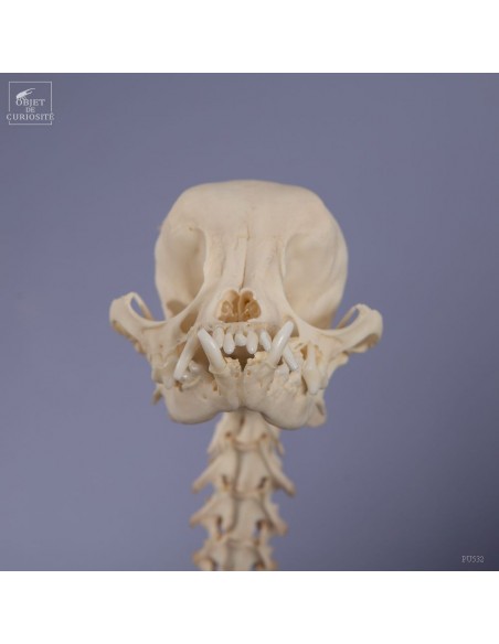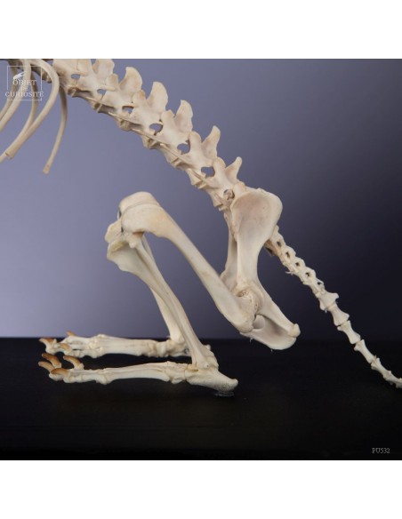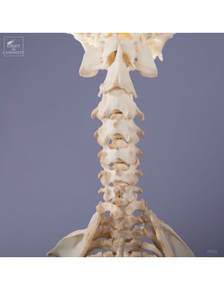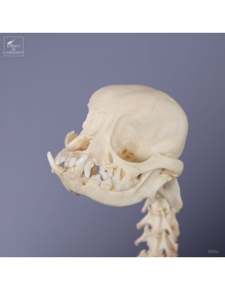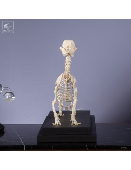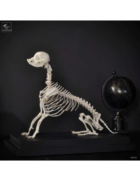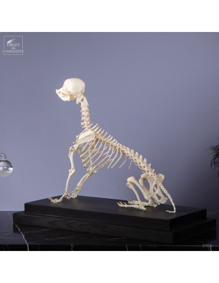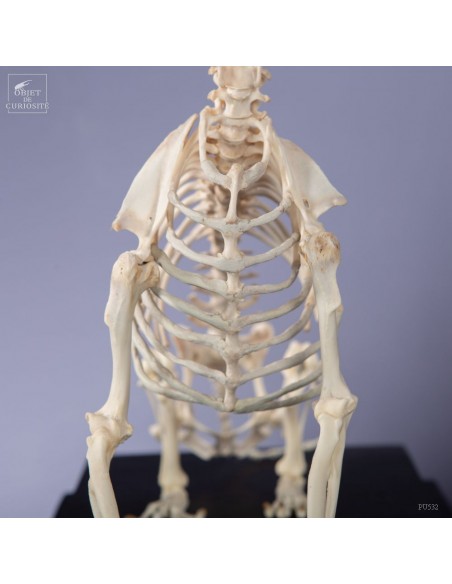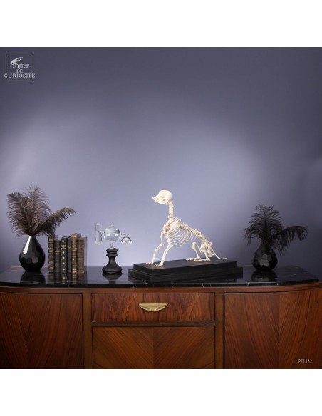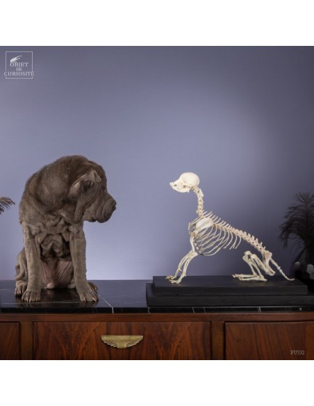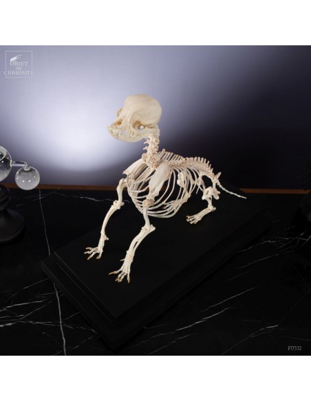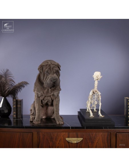 Une curiosité originaire du Mexique: le Chihuahua. surprenant représentant de la gente canine. On perçoit toute l'étrangeté de cet animal en regardant son ossature et plus particulièrement son crâne. Cette espèce est la plus petite du monde, mais celui-ci était un géant... au pays des miniatures. Il est bien-sûr décédé de causes naturelles aux Pays Bas.