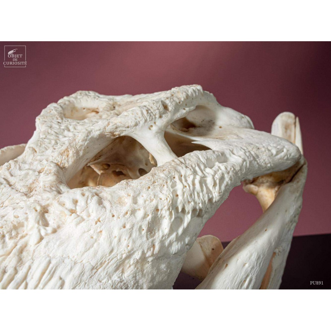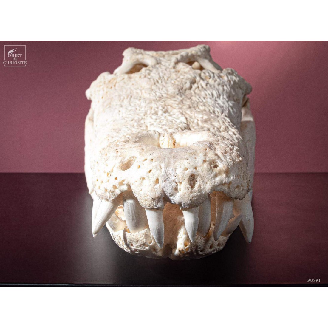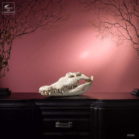 Le crocodile du Siam -Crocodylus Siamensis- est une espèce d'eau douce de taille moyenne (4 mètres et 370Kg pour les plus grands mâles). Il est originaire de Bornéo, Thailande ou Cambodge. Et aujourd'hui la population sauvage est bien inférieure à la population dans les élevages. La modification des milieux naturels par l'homme en est la principale raison. Ce gros spécimen mesurait certainement au moins 3 mètres. Ses 64 dents lui servent principalement à manger des poissons. Ce crocodile provient d'un élevage du Nord de la Thaïlande dont la production principale est le cuir. Cites I.