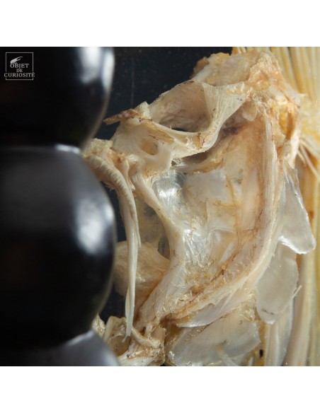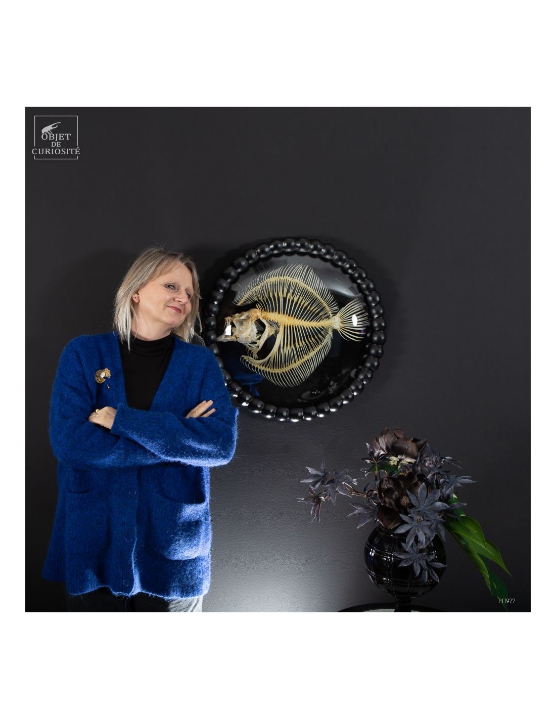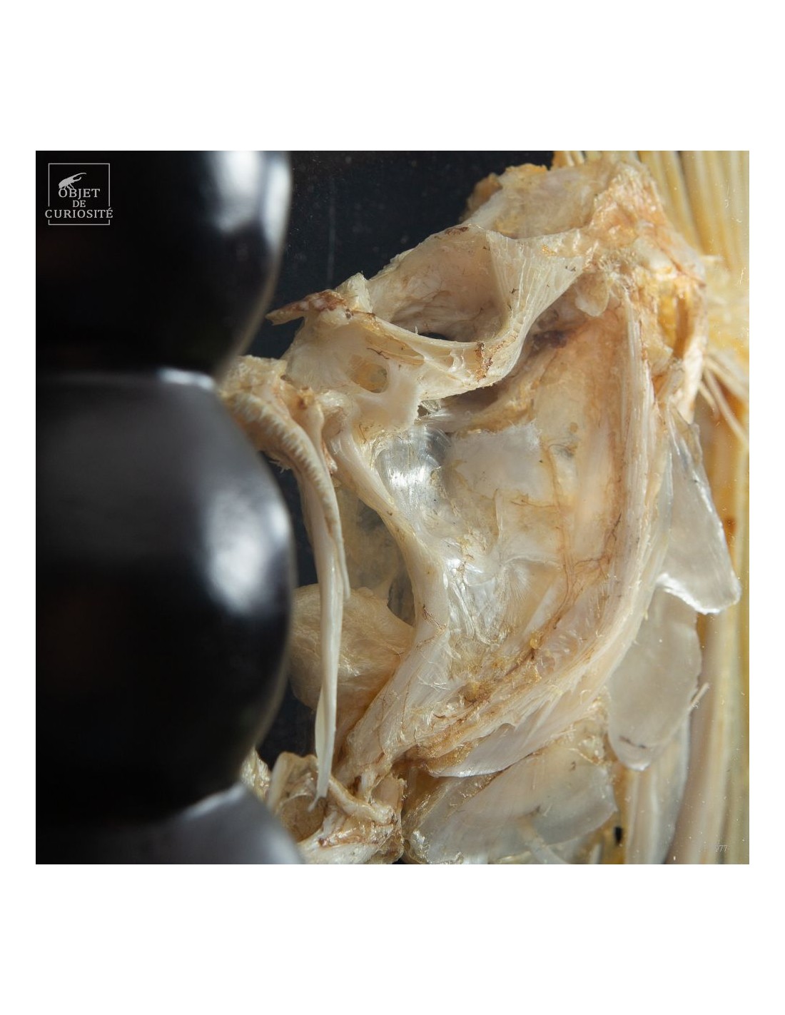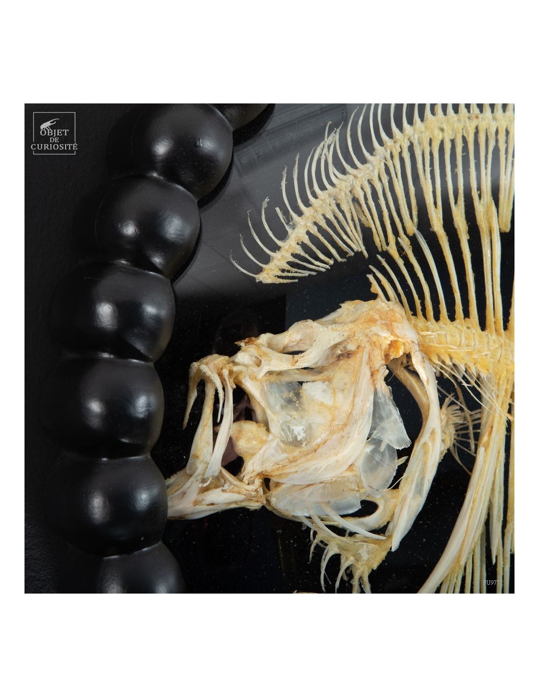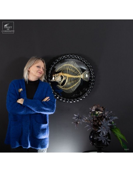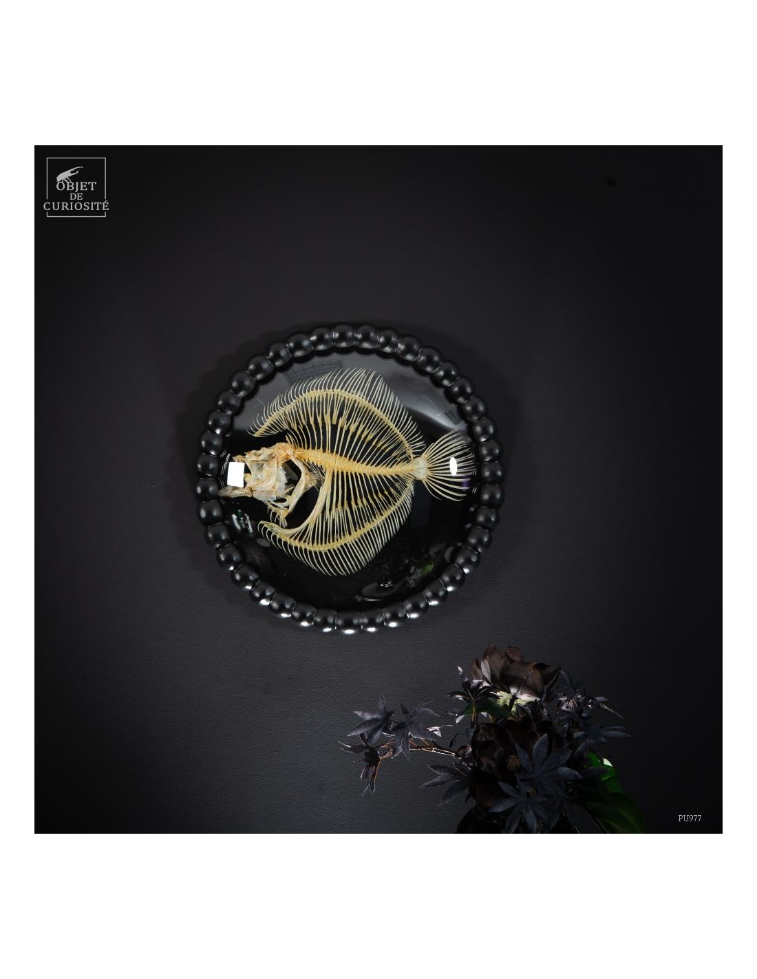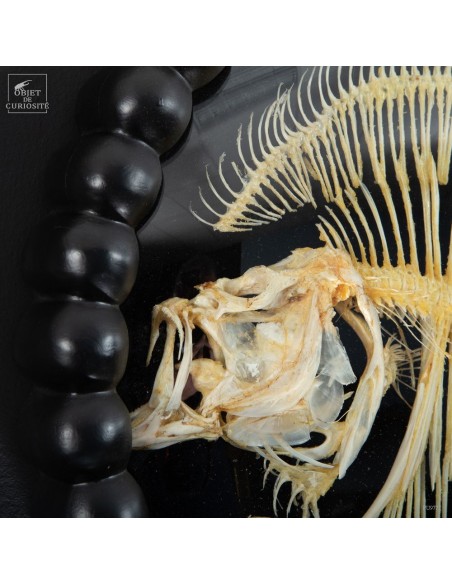 De la famille des Turbots, ce poisson plat s'appelle une Barbue - Scophthalmus rhombus - et il se trouve du Maroc jusqu'en Islande. Comme la sole ou le poulpe, la Barbue est capable d'homochromie: Elle est capable de modifier la couleur de sa peau pour imiter le fond où elle se trouve. Sauf, bien sûr, lorsqu'il s'agit de son squelette sur un velours noir. Le cadre est en manguier massif à perles sculptées.