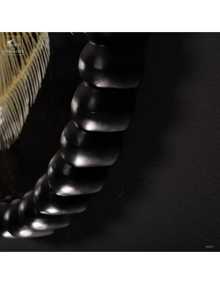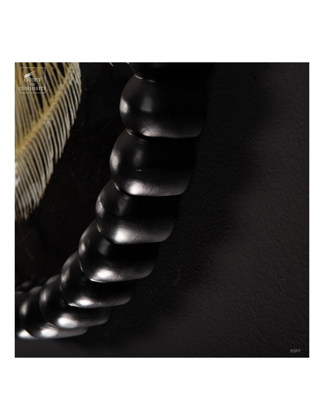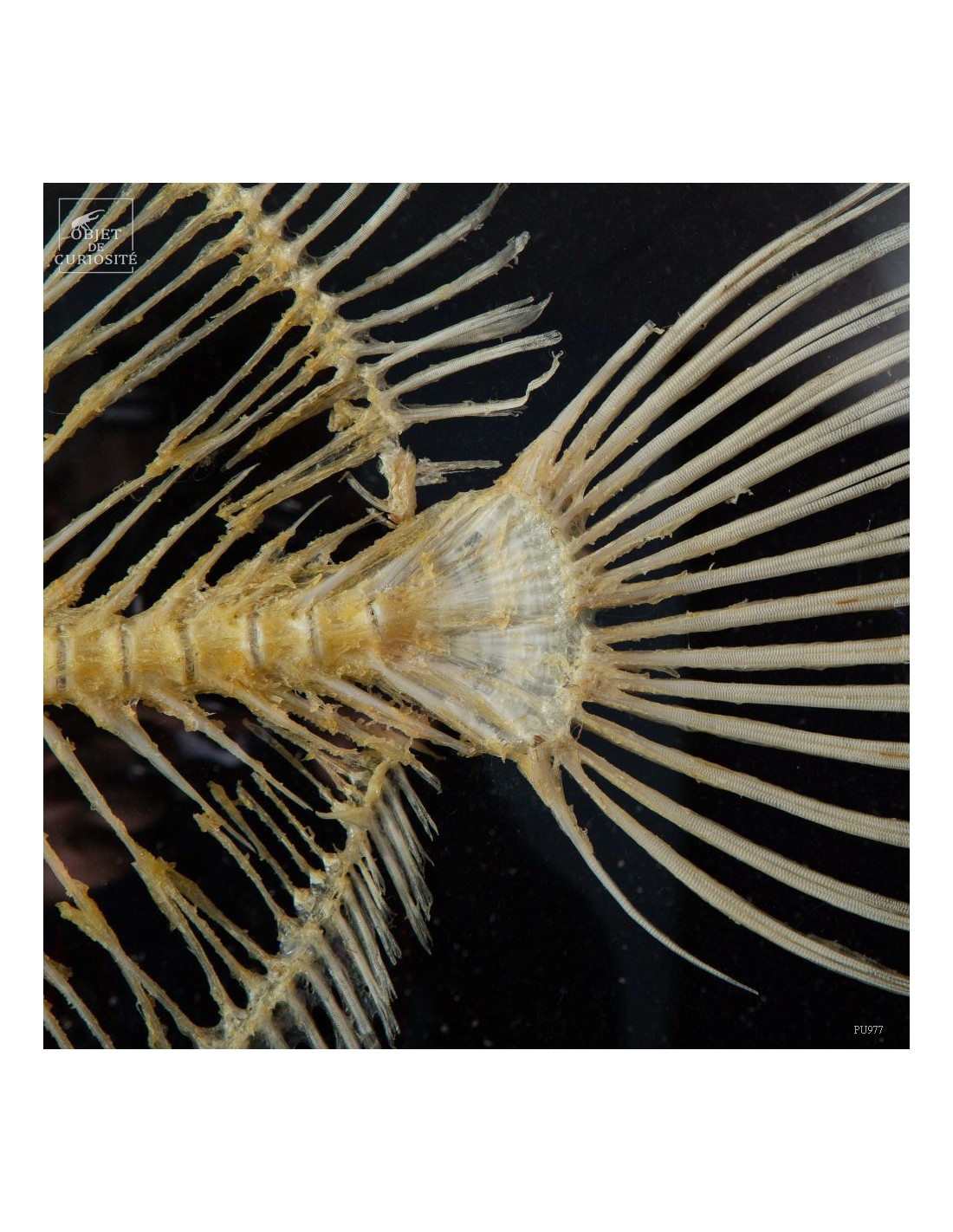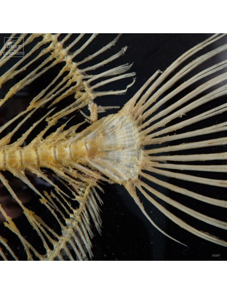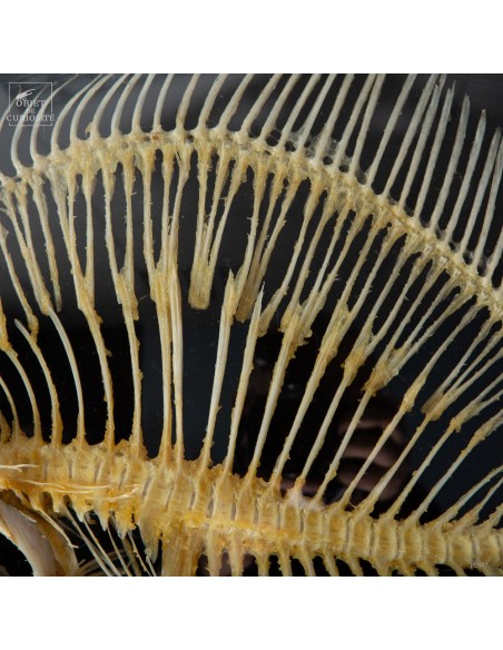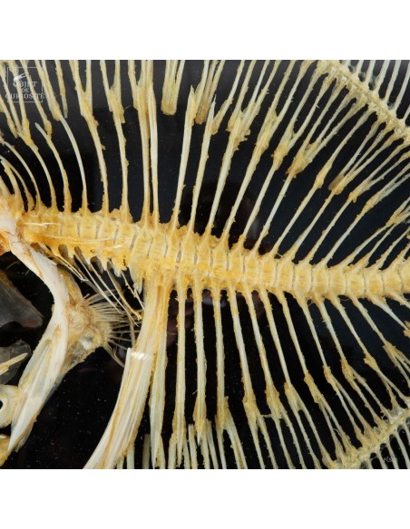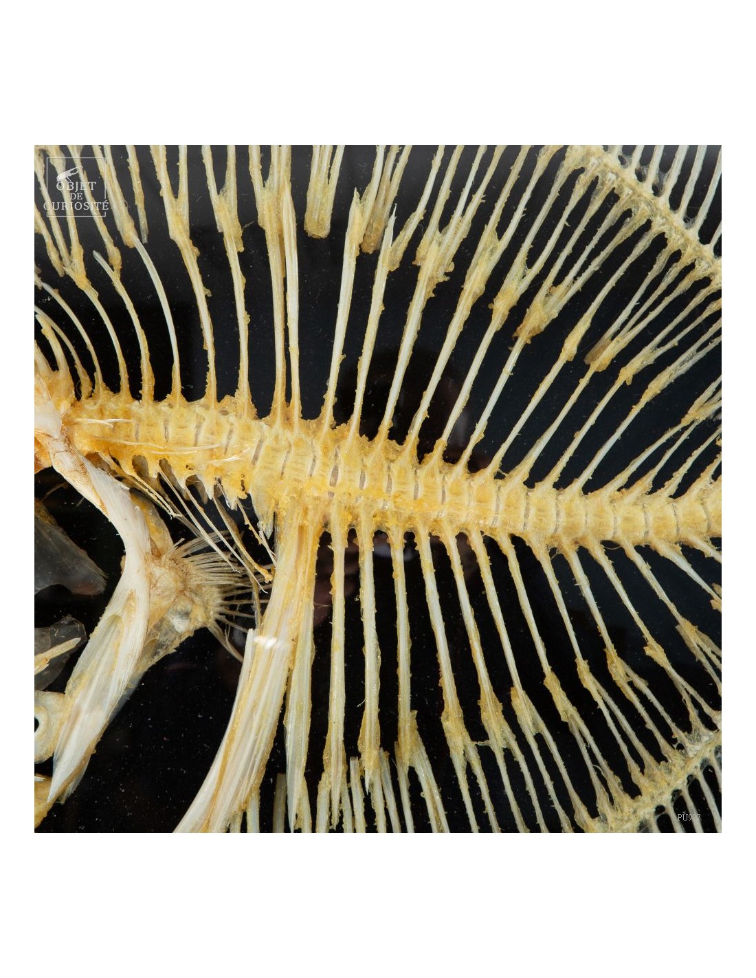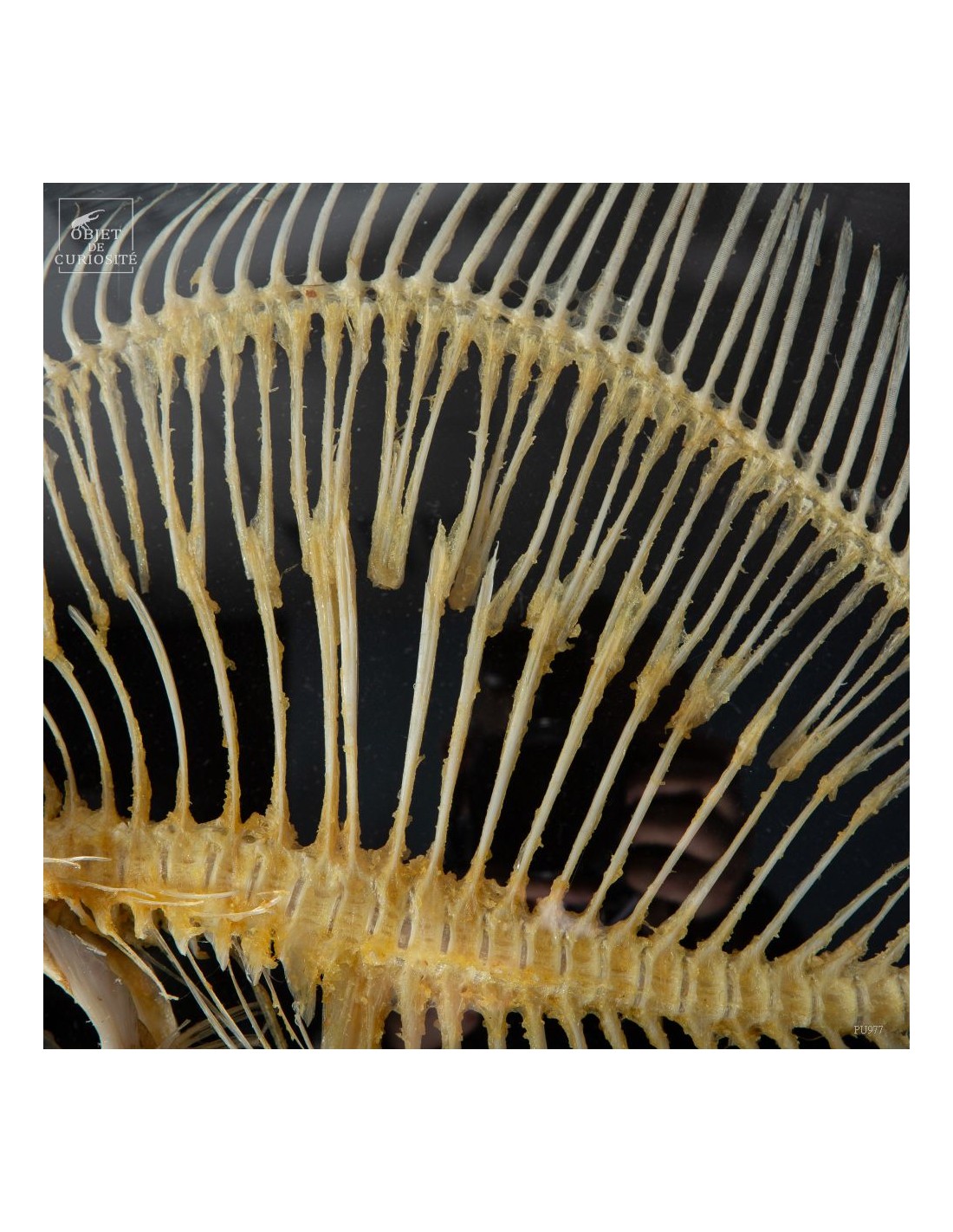 De la famille des Turbots, ce poisson plat s'appelle une Barbue - Scophthalmus rhombus - et il se trouve du Maroc jusqu'en Islande. Comme la sole ou le poulpe, la Barbue est capable d'homochromie: Elle est capable de modifier la couleur de sa peau pour imiter le fond où elle se trouve. Sauf, bien sûr, lorsqu'il s'agit de son squelette sur un velours noir. Le cadre est en manguier massif à perles sculptées.