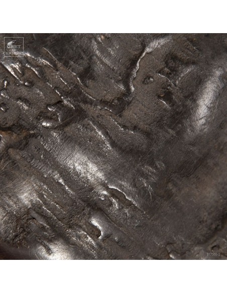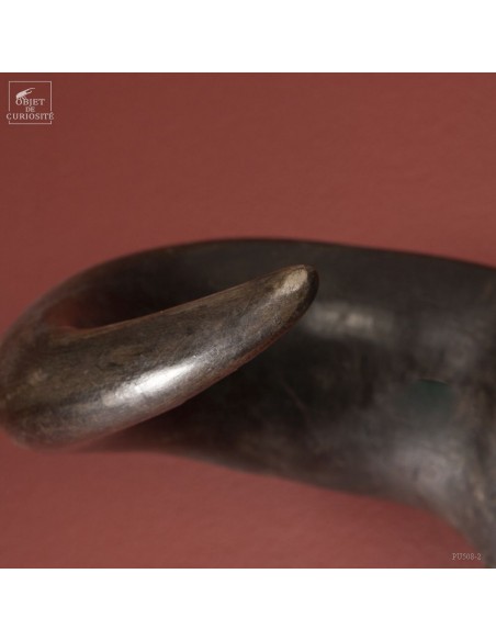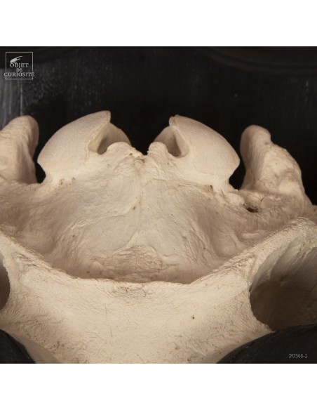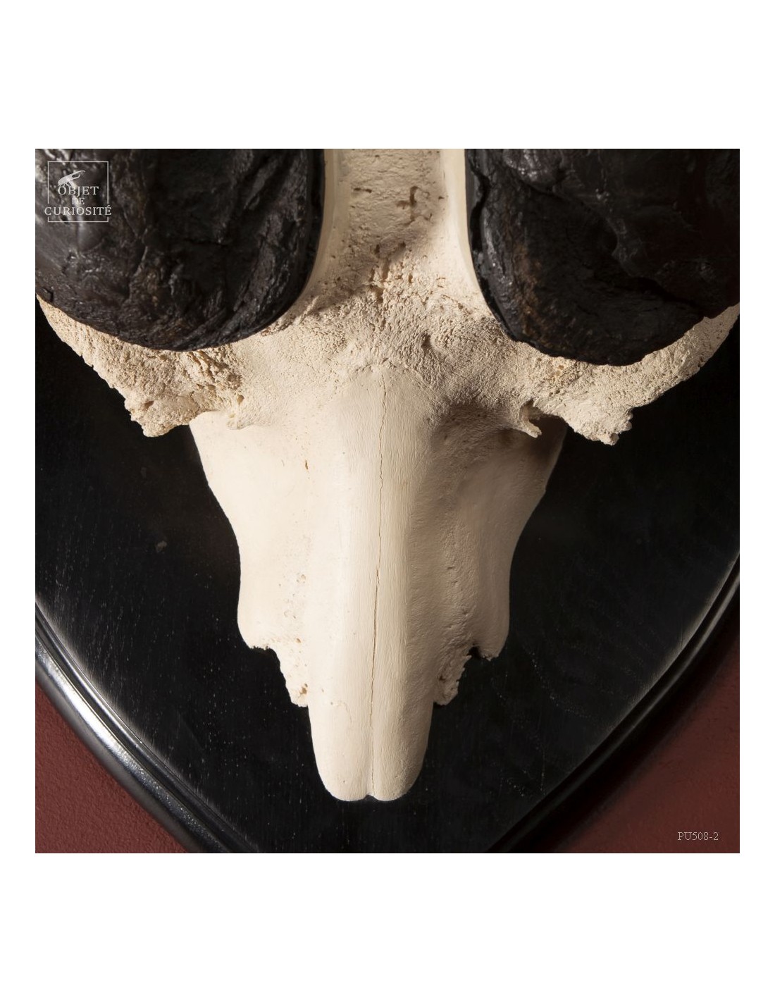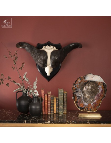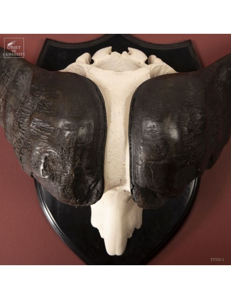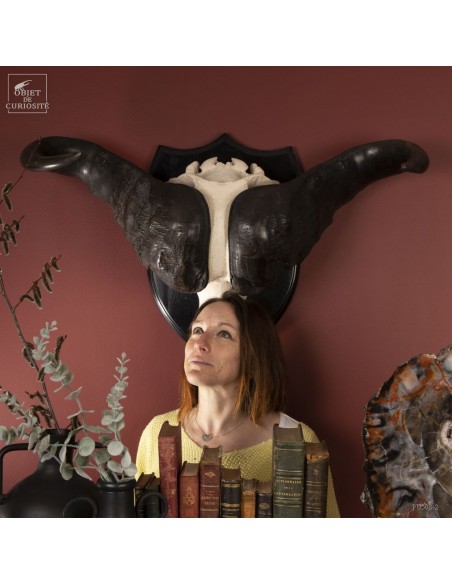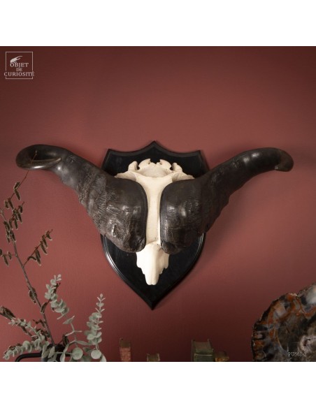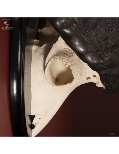 La force de cet animal de près d'une tonne, restituée en noir et blanc, épuré, à l'opposé des crânes très sculptés. Les cornes plaquées le long du crâne permettent de visualiser les chocs entre deux mâles à la saison des amours. Le choc était prévu...