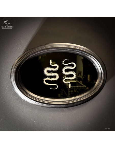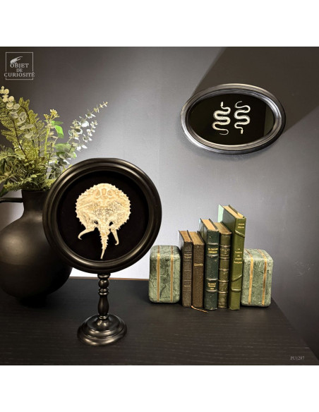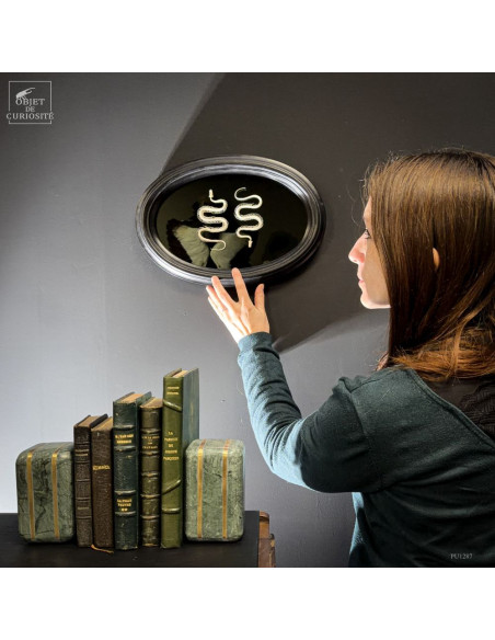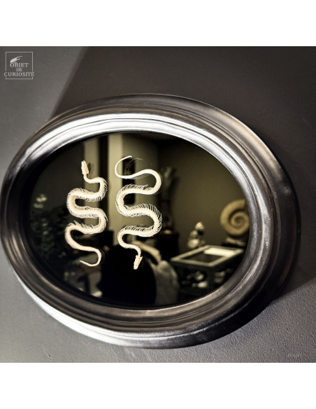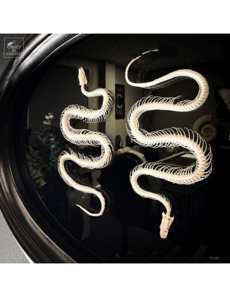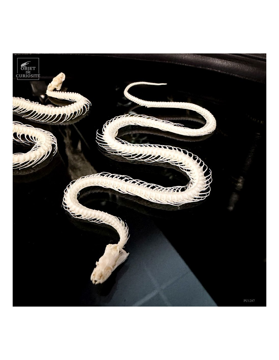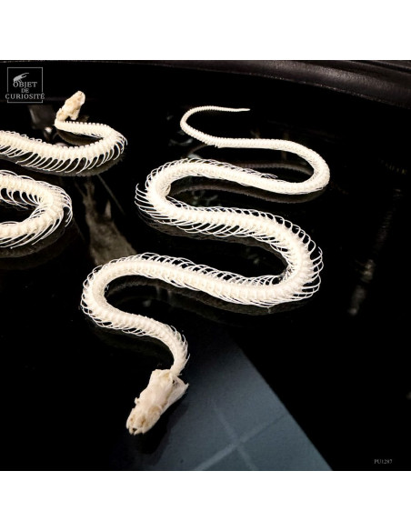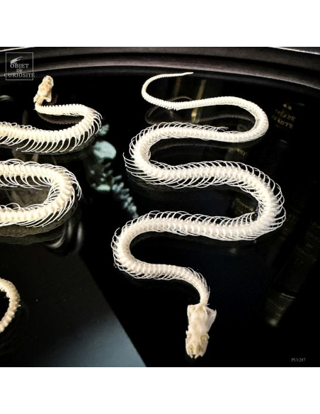 Cette dentelle blanche sur un miroir noir, est le squelette de deux serpents: La couleuvre des rizières, Laos, Cambodge, Malaisie ... milieu humide, passe beaucoup de temps dans l'eau. Son nom fait référence à la couleur grise (du plomb) de sa peau. Sa tête n'est pas plus large que son corps. Il ne dépassera pas 50cm à l'âge adulte.