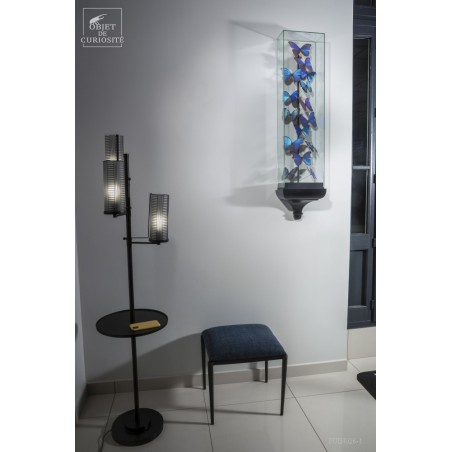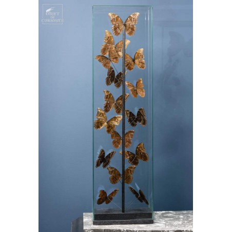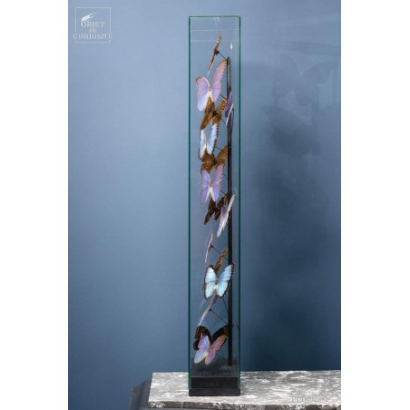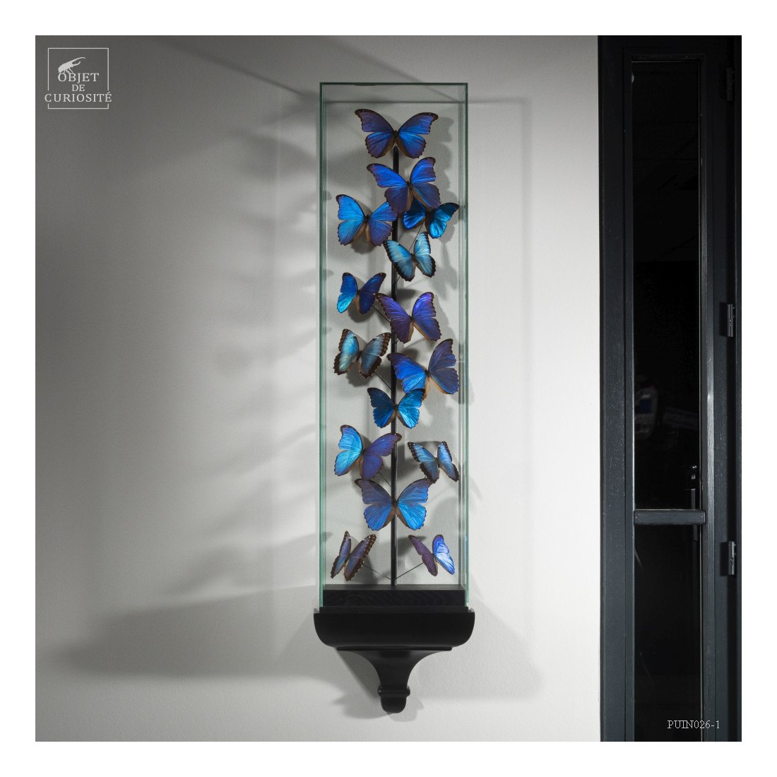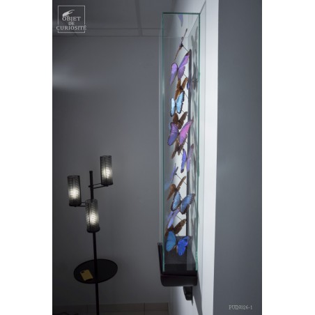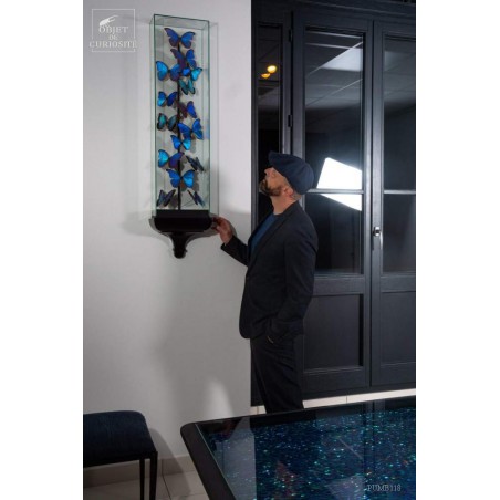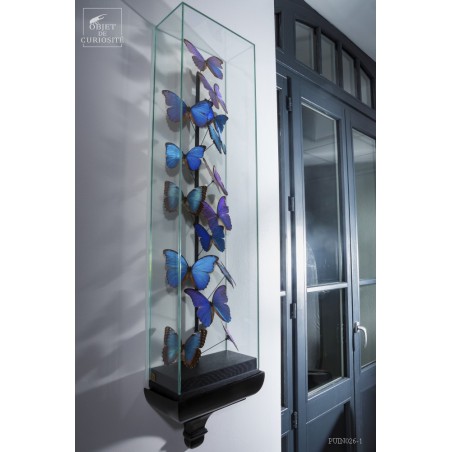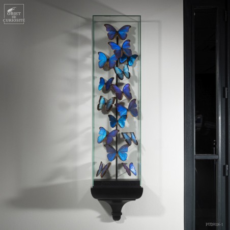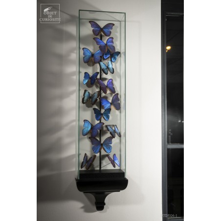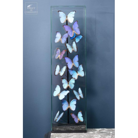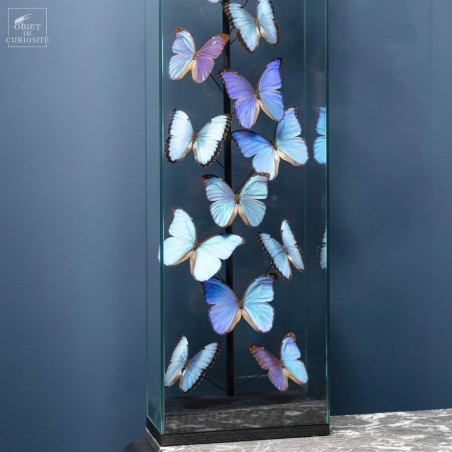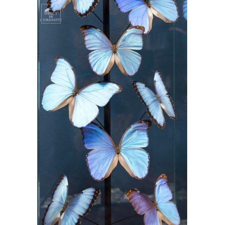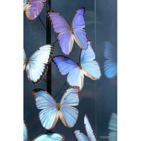 15 papillons bleus de la famille des Morphos. Originaires d'Amérique du Sud, ces papillons étonnent par les couleurs métalliques de leurs ailes. Ils reflètent naturellement la lumière. Le revers plus discret est doté d'ocelles, qui imitent des yeux d' oiseaux, destinés à effrayer les prédateurs. Très hauts (120cm) mais étroits car ils correspondent exactement à nos consoles noires DA071. 2 belles verticales pour encadrer cette fenêtre.
