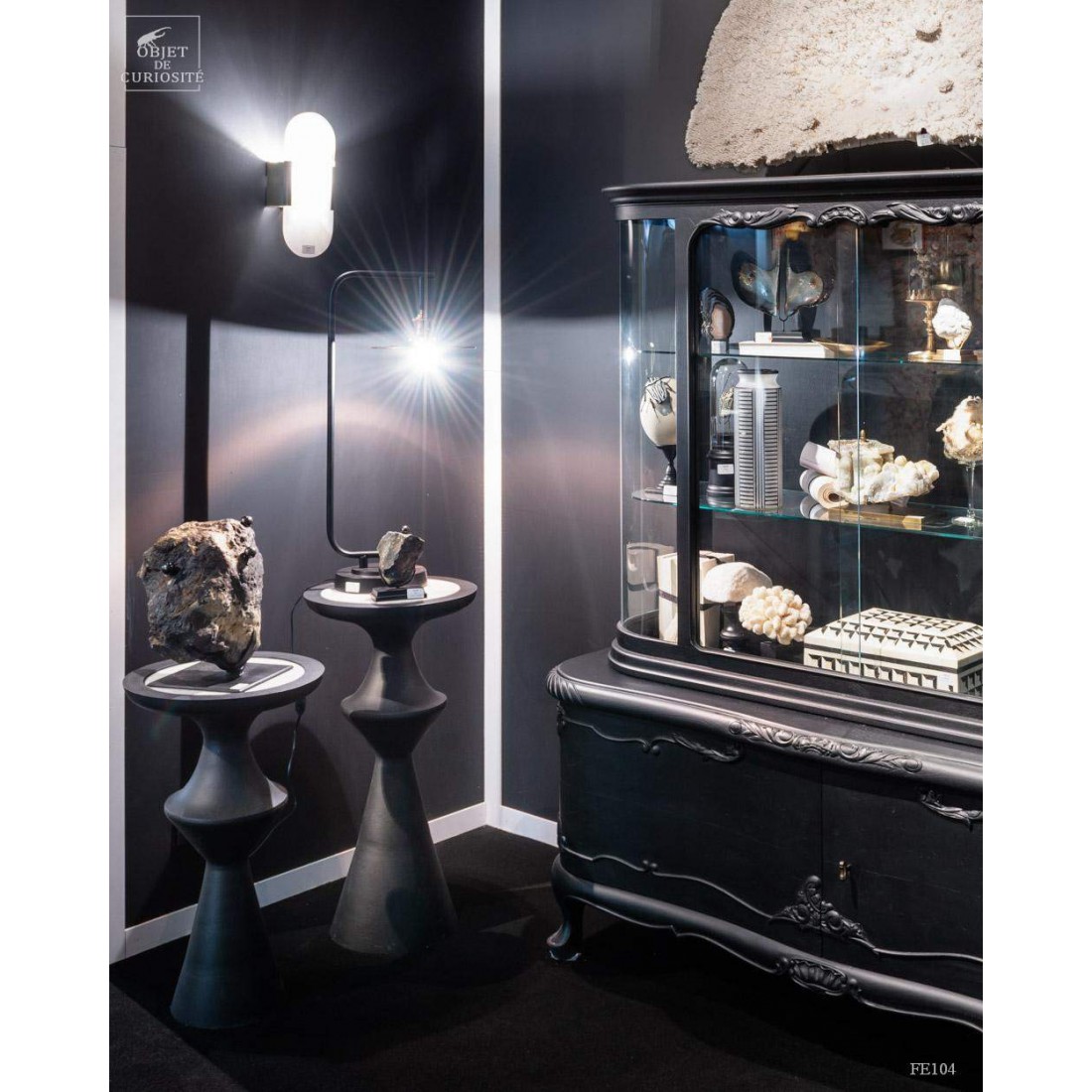 Le mélange des matières: la fonte d'aluminium noire et le marbre blanc. Le plateau de marbre est incrusté dans le métal noir. Un deuxième modèle existe un peu plus haut: 73cm de haut. FE105.