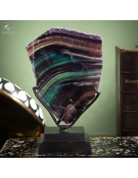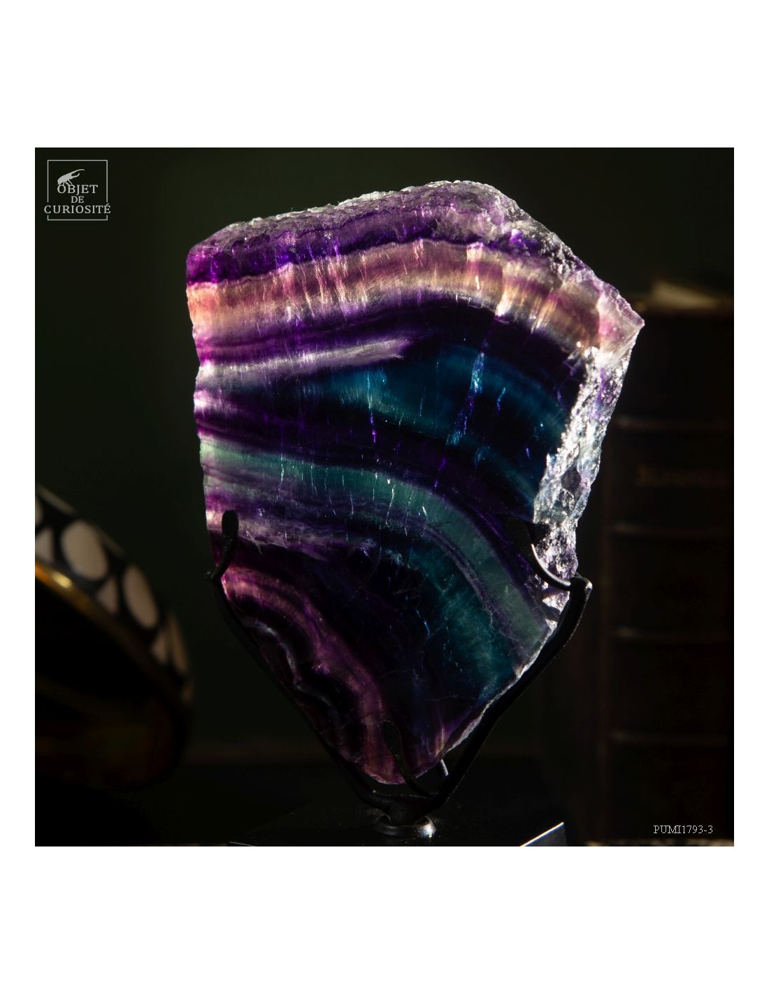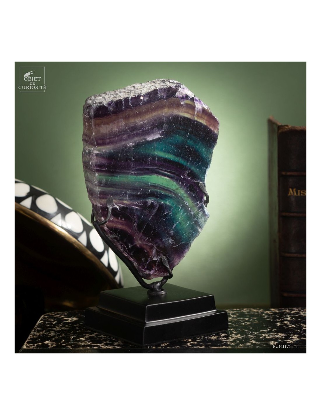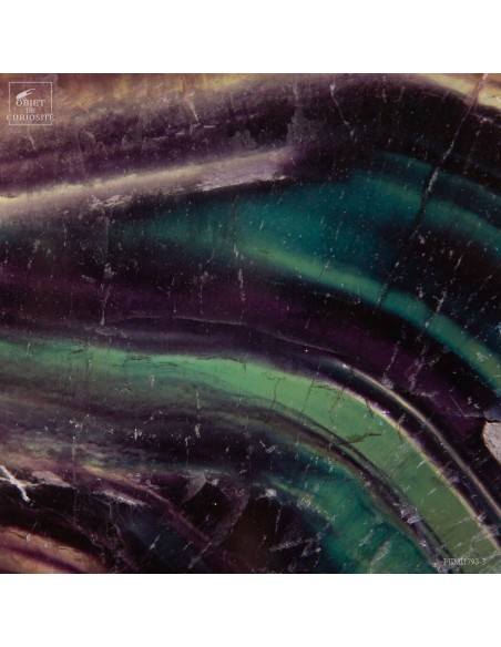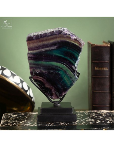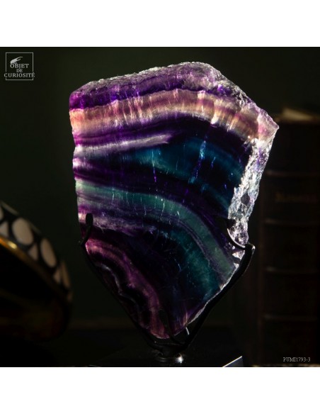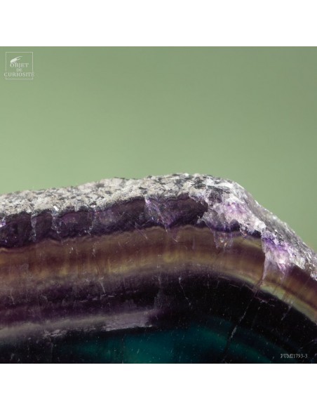 La Fluorite à bandes la plus célèbre au monde a été exploitée au 19ème siècle dans le Derbyshire en Angleterre: Blue John. Elle était récoltée pour sa valeur ornementale et les artisans arrivaient à creuser des saladiers et coupes que l'on trouve aujourd'hui dans les plus beaux châteaux Anglais. Mais une découverte récente a surclassé Blue John: La Fluorite Arc en Ciel de la mine Deqing fluorite, dans la province du Zhejiang en Chine. Cette pièce a des bandes parfaites de violet, vert, transparent... et très peu de pierres, y compris dans cette mine, ont un tel intérêt graphique.0.6Kg
