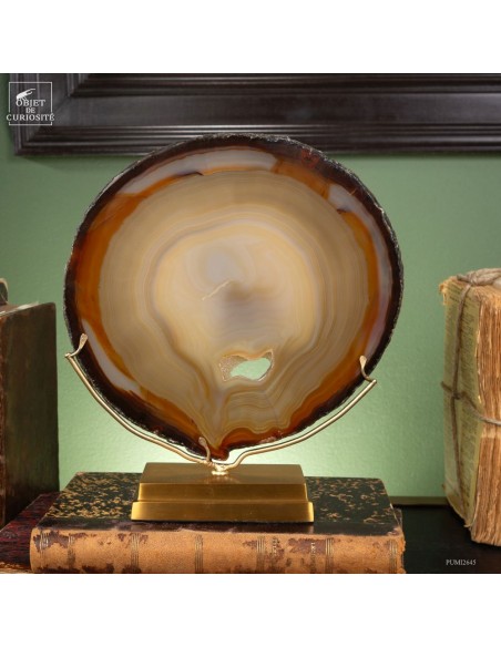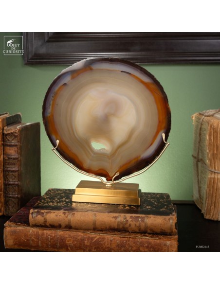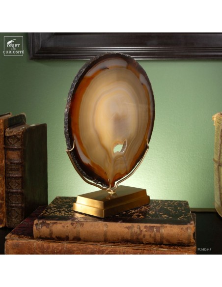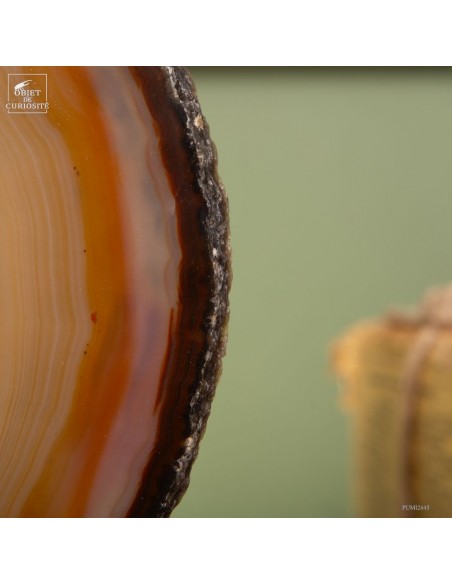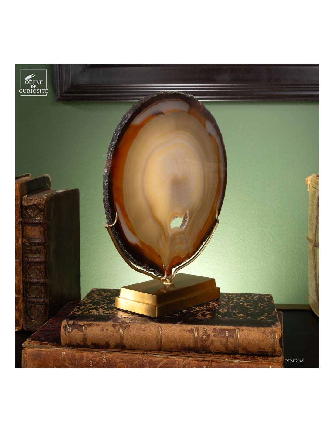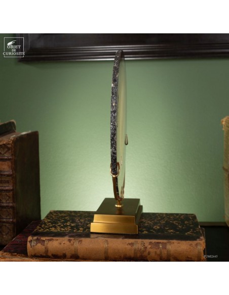 Montée sur une base en laiton, cette tranche révèle toute sa finesse lorsqu’elle est traversée par la lumière (photos 2 et 3), mettant en valeur la transparence subtile et les détails des différentes couches.