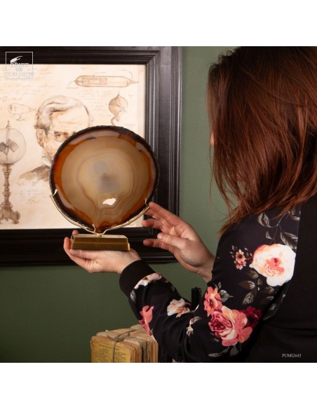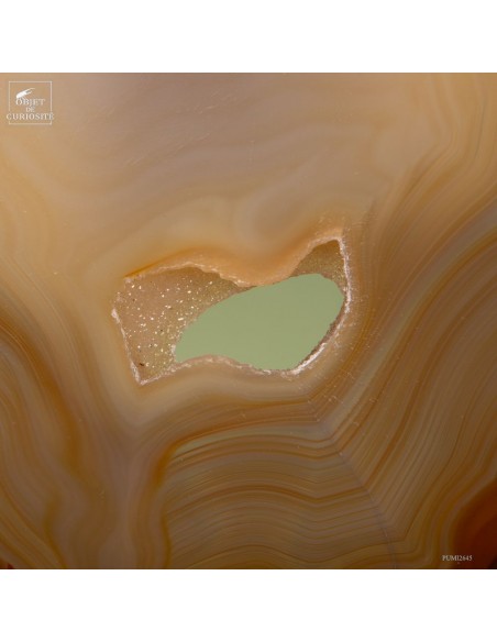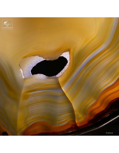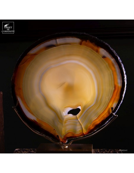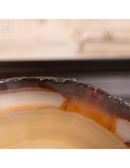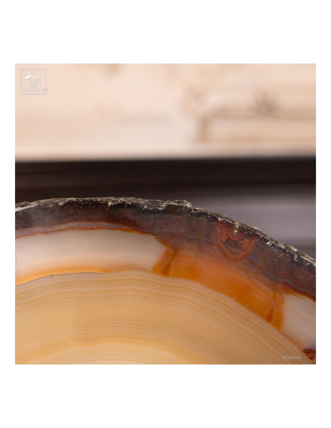 Le contour brun profond contraste avec les nuances dorées, marron et blanches qui se déploient en cercles concentriques. Cet effet visuel est le résultat des dépôts successifs, créant une alternance harmonieuse de couleurs. Une petite cavité cristallisée apporte une touche minérale supplémentaire, tandis que le reste de la pièce révèle la pureté de l’agate.