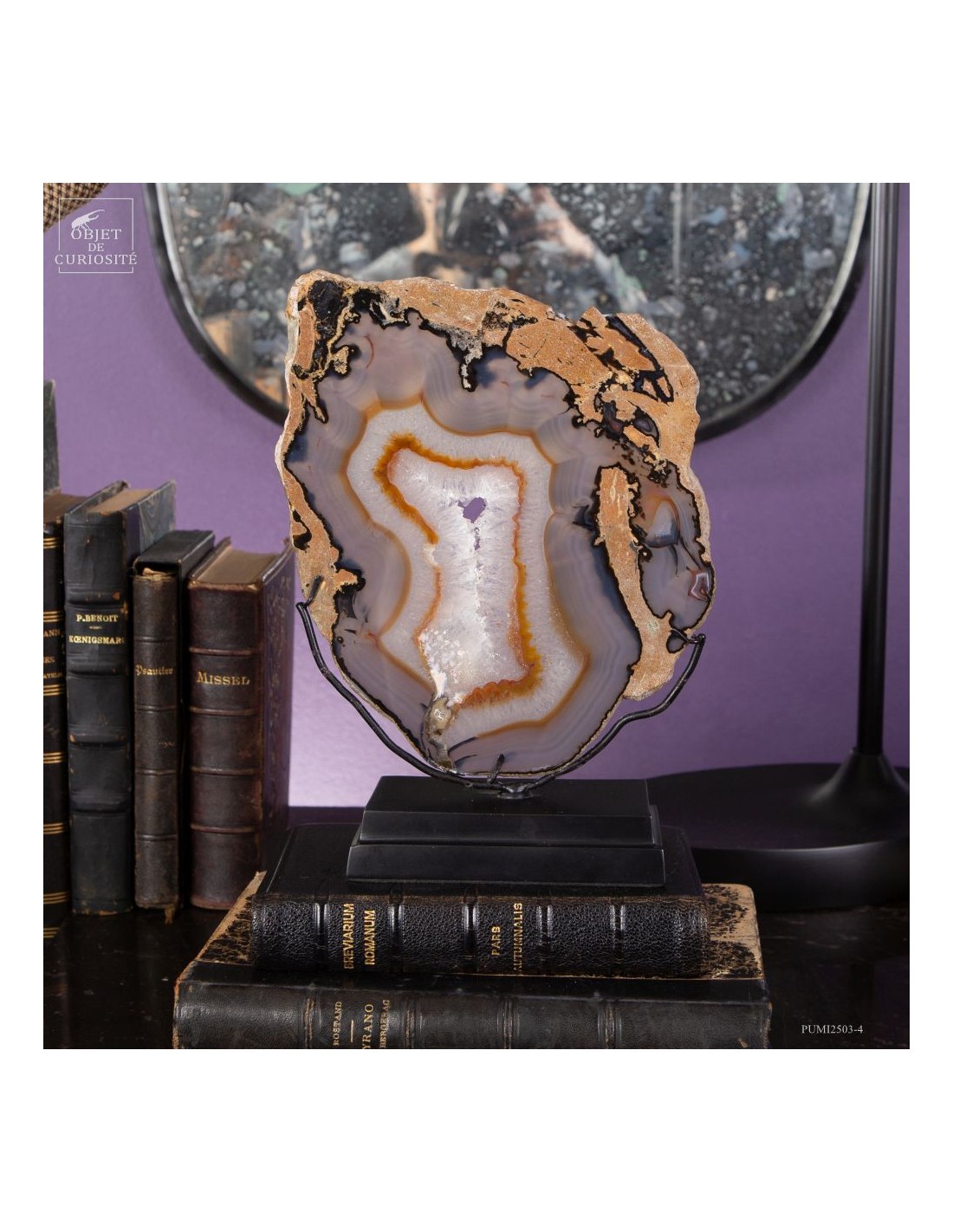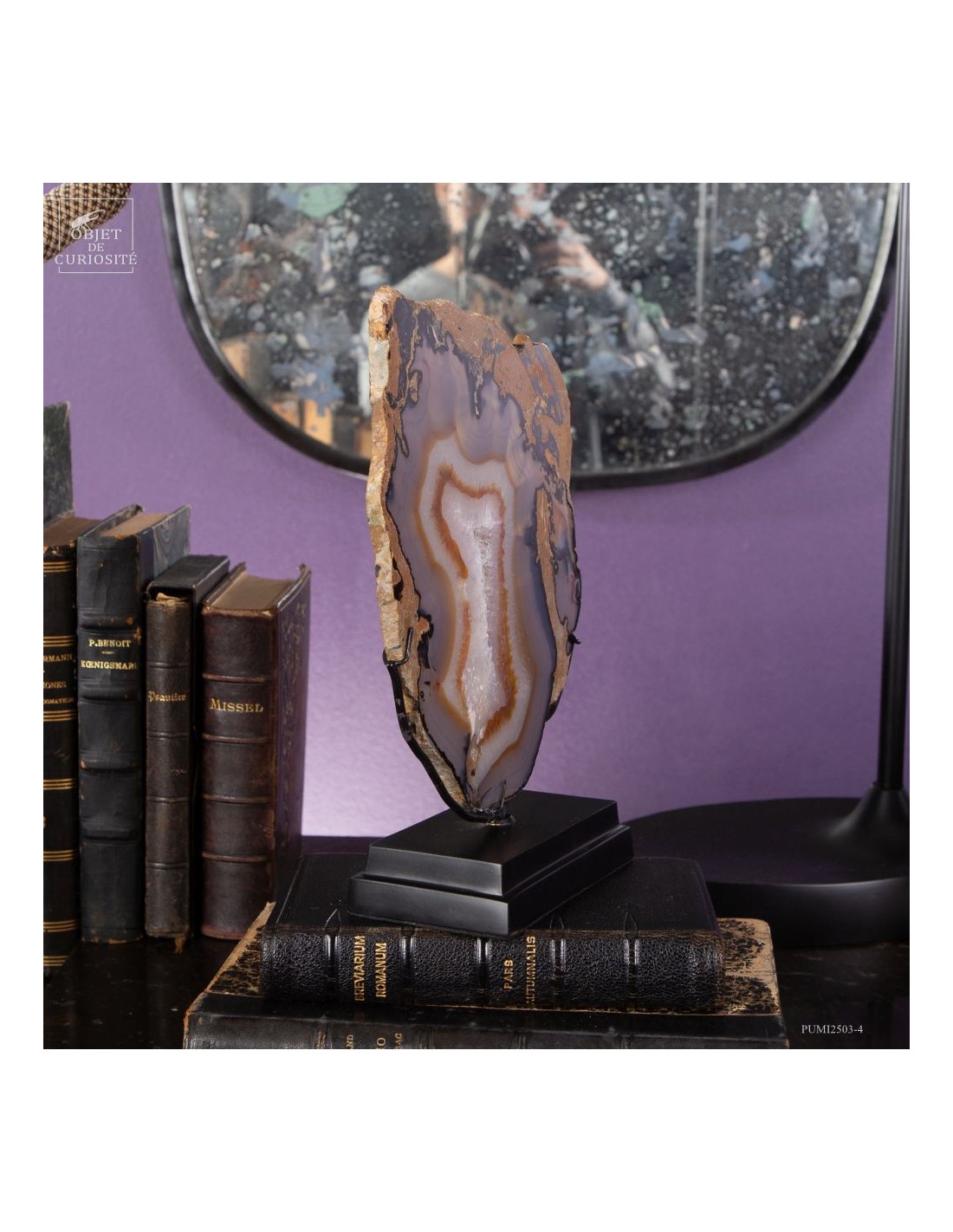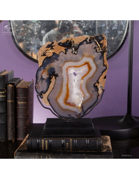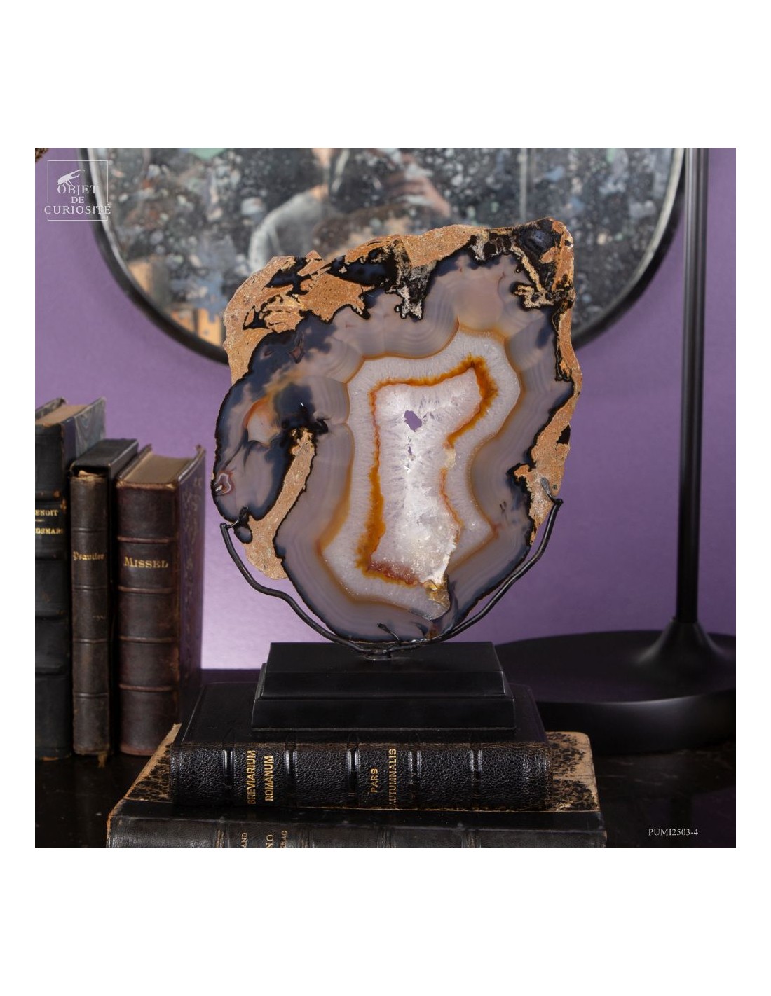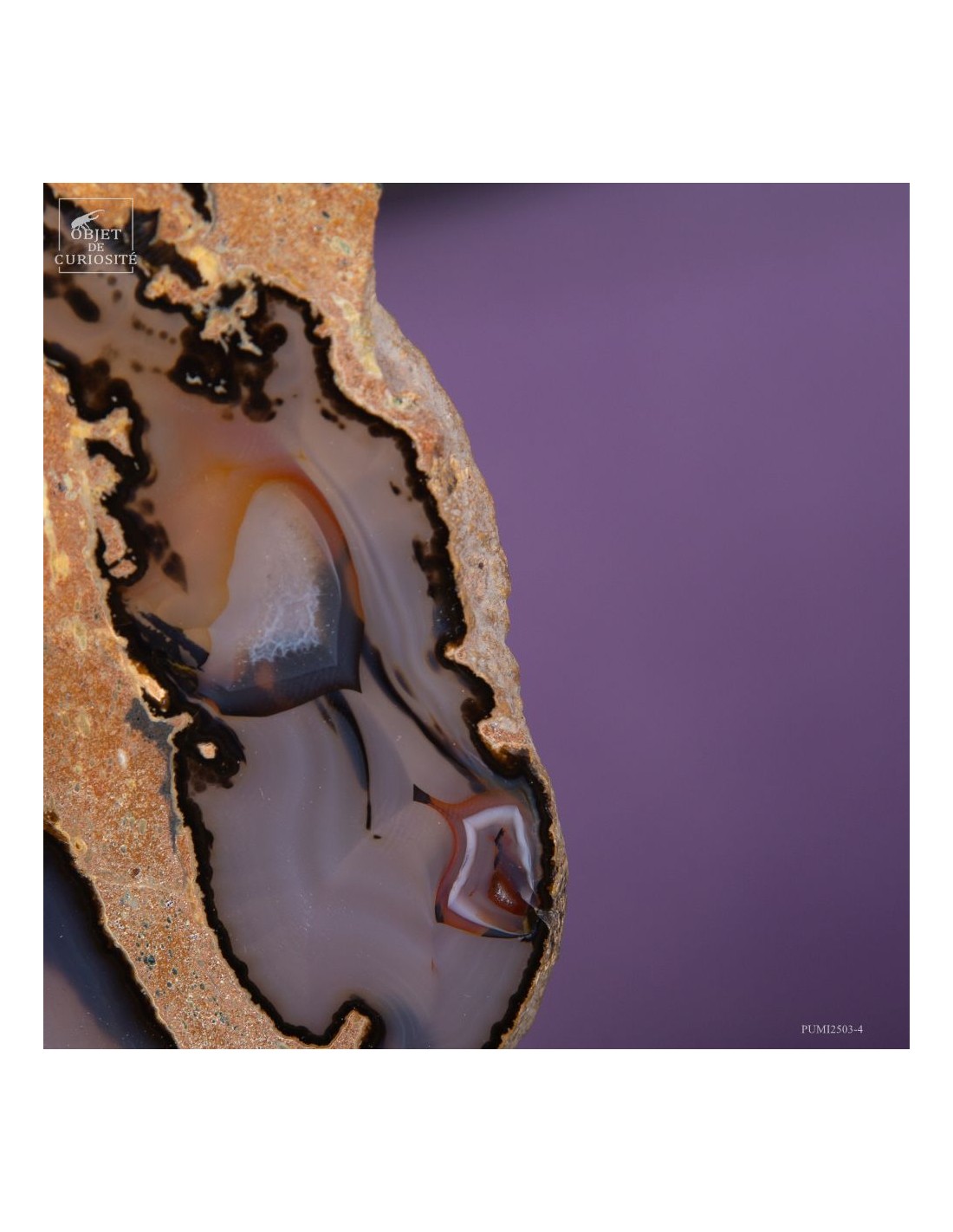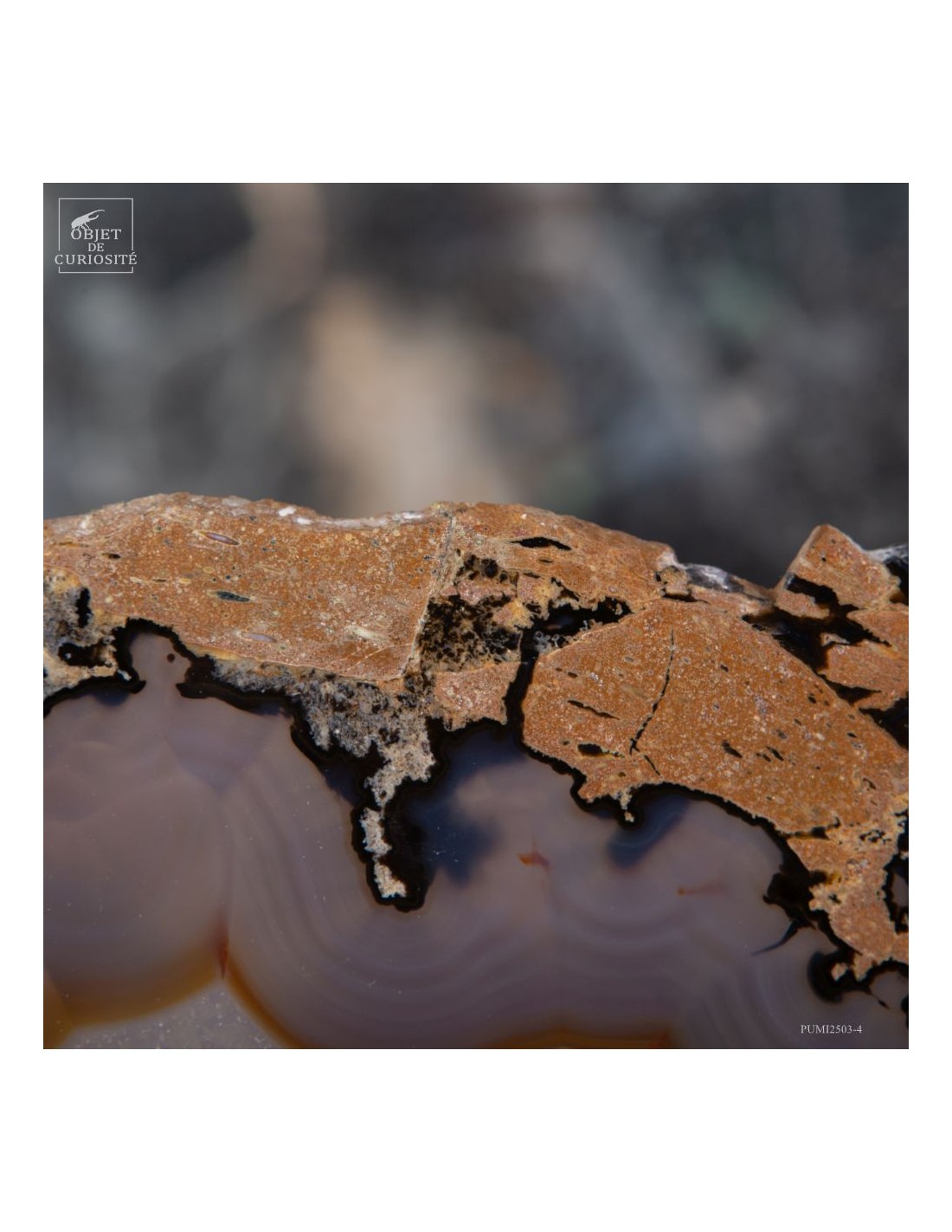 Cette Agate du Brésil est naturelle. L'eau qui s'est infiltrée pendant des milliers d'années dans cette ancienne géode était plus ou moins chargée en manganèse et fer. C'est ce qui a donné ces tons foncés, variant selon les saisons et les années. Taillée en fine tranche, elle devient translucide et laisse passer la lumière.