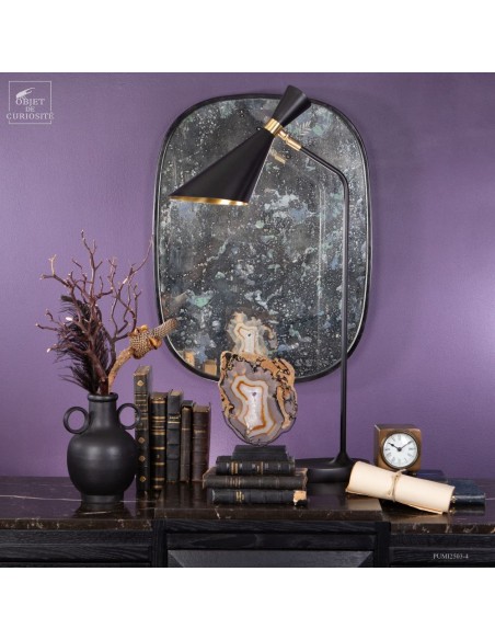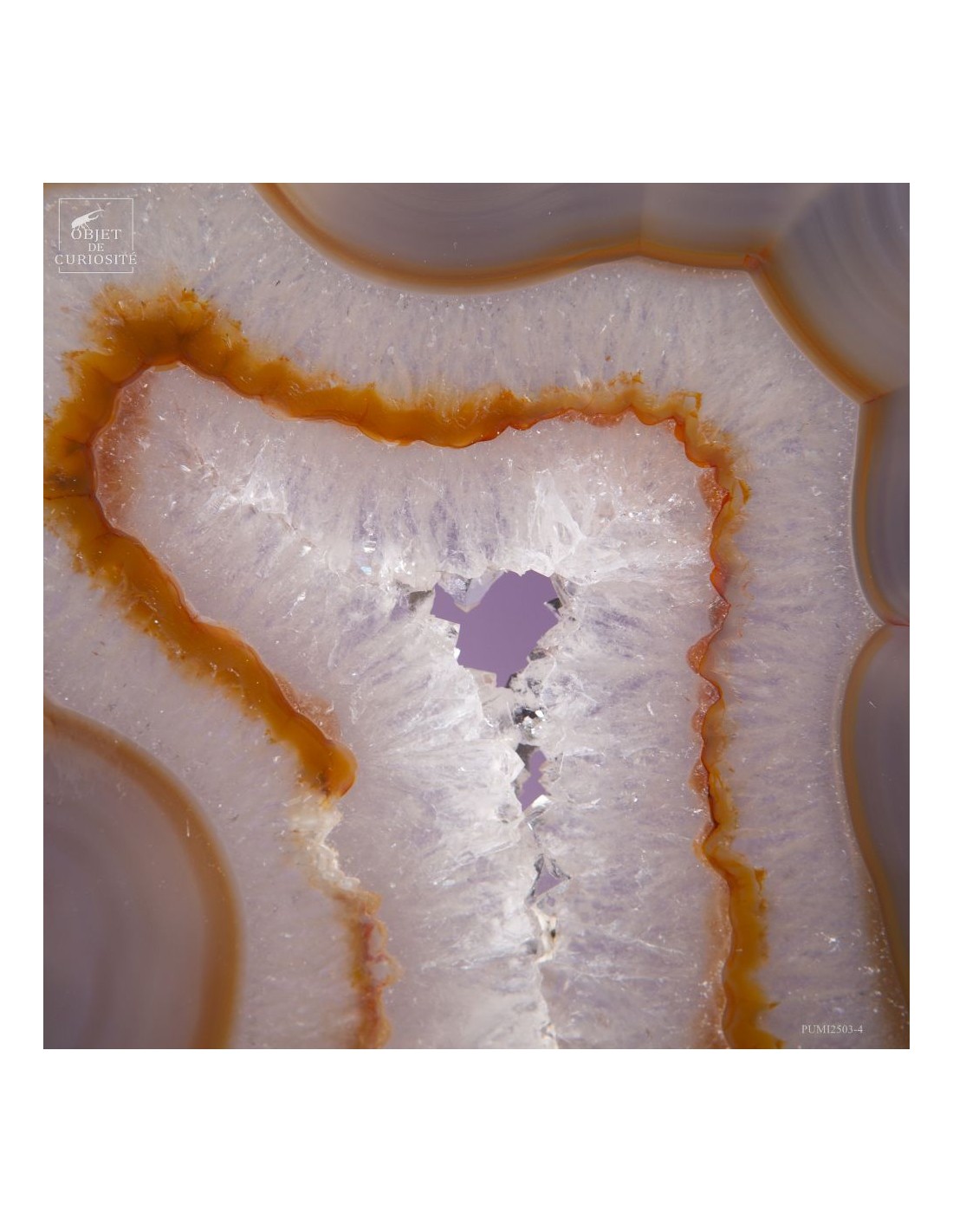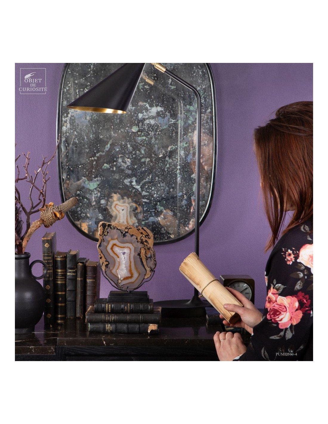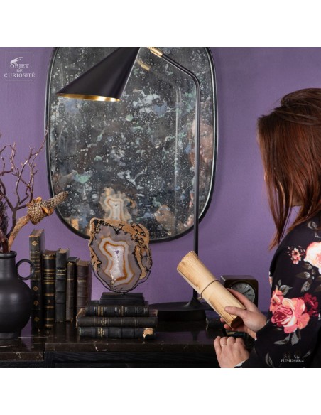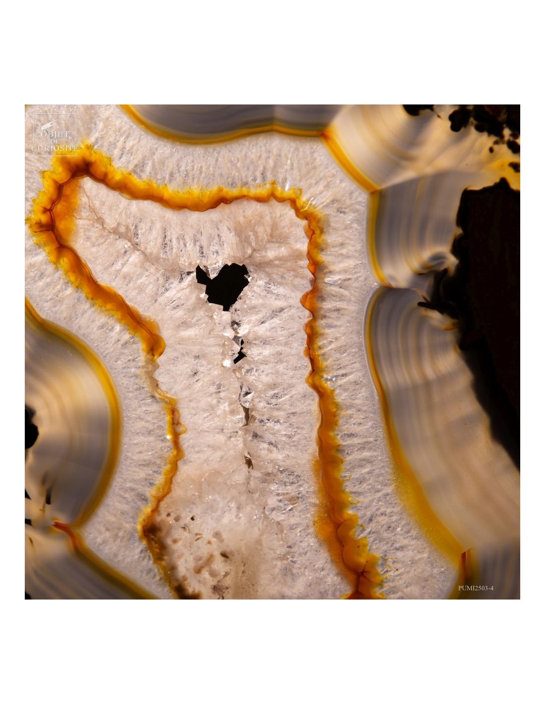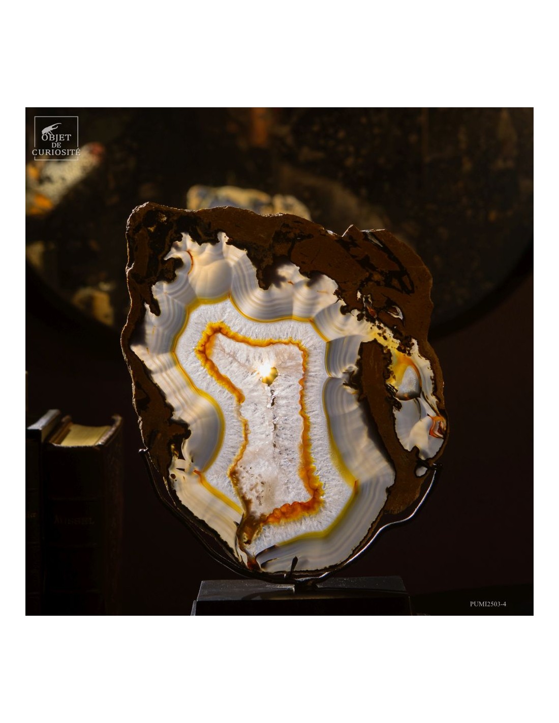 Cette Agate du Brésil est naturelle. L'eau qui s'est infiltrée pendant des milliers d'années dans cette ancienne géode était plus ou moins chargée en manganèse et fer. C'est ce qui a donné ces tons foncés, variant selon les saisons et les années. Taillée en fine tranche, elle devient translucide et laisse passer la lumière.