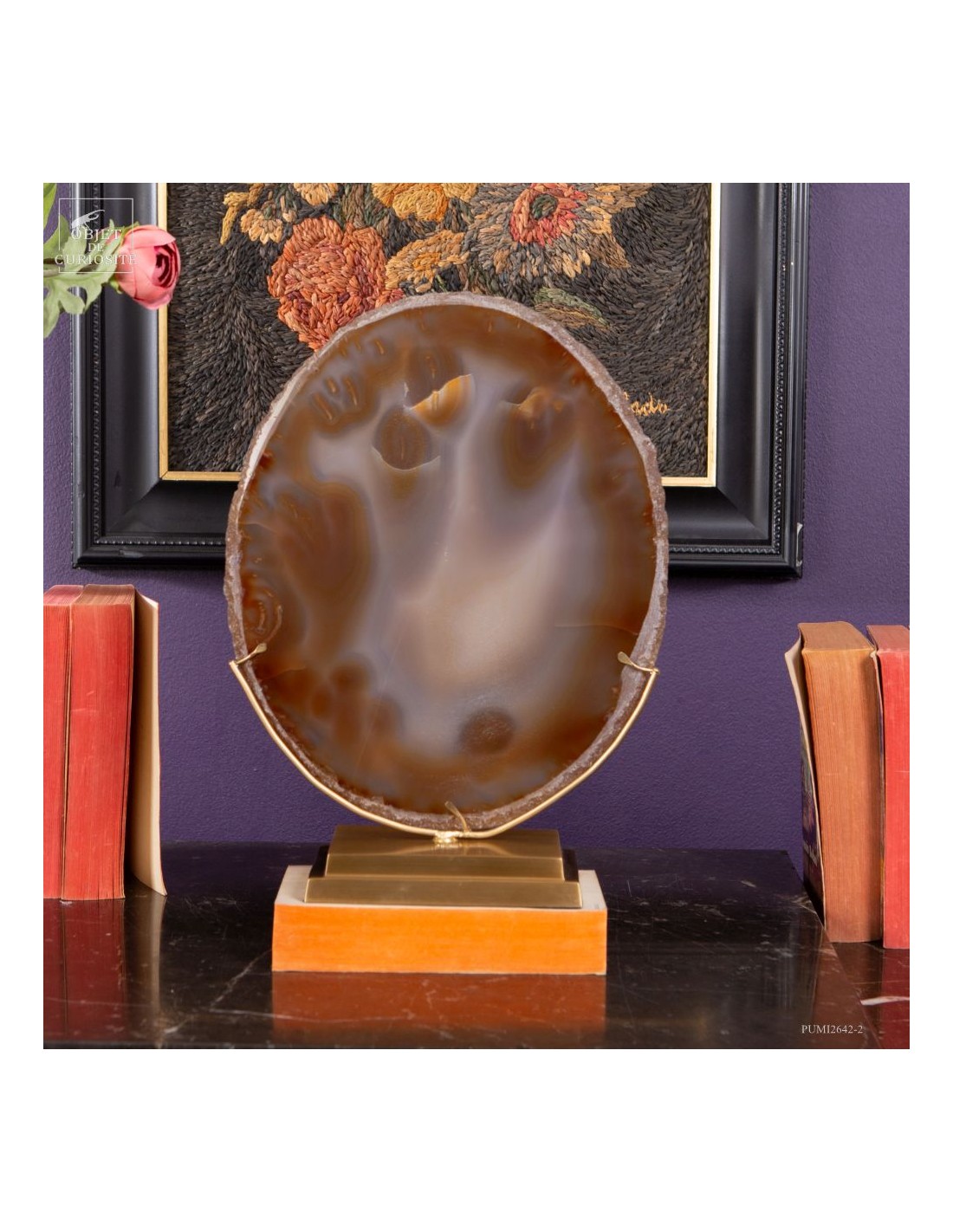 Montée sur une base en laiton, cette tranche d’agate dévoile encore plus de détails lorsqu’elle est éclairée, offrant un jeu subtil de transparence et de contrastes.
