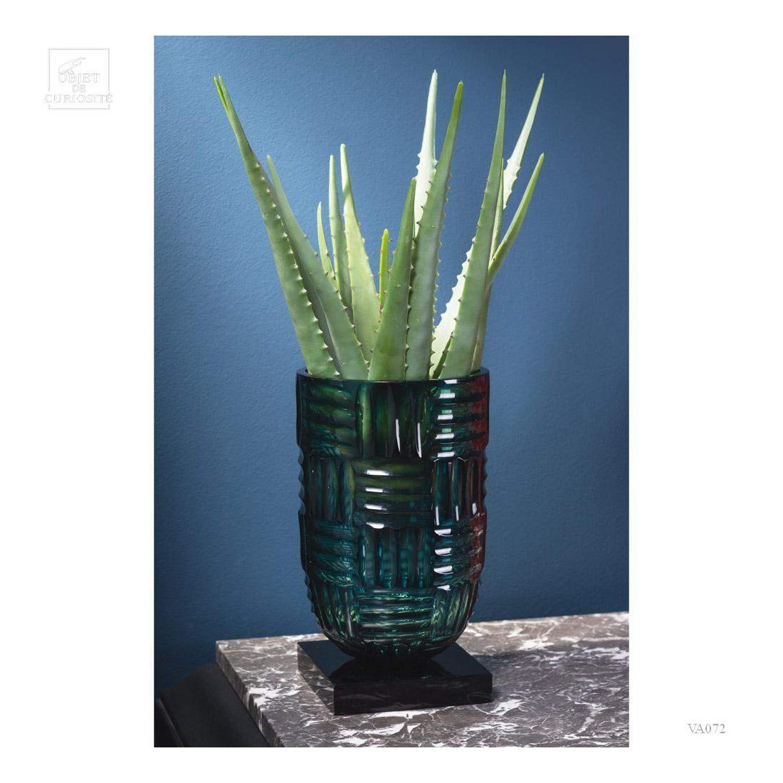 Une forme élégante inspirée des vases des années 1940. Nous avons complexifié les codes esthétiques de l'époque: une double couche de verre permet d'avoir 2 couleurs dans les motifs entaillés dans la matière. La couche de bleu qui est à l'extérieur laisse la place à un vert tendre dans les entailles qui sont pratiquées. La complexité de la fabrication n'a qu'un seul but: un certain raffinement.