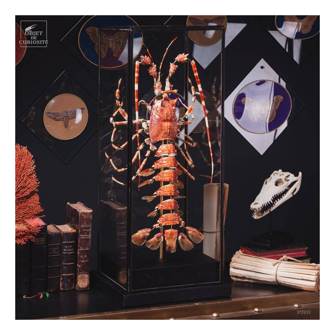 Cette jolie Langouste rouge vous en montre plus qu'une autre langouste! Pêchée en Bretagne au large du port de Brest elle pesait 1.2Kg, lorsque nous l'avons achetée au poissonnier. Et cette couleur est bien celle de l'animal même lorsqu'il n'est pas cuit. Cette langouste -Palinurus elephas- :est ici présentée en éclaté de Beauchêne: chaque articulation est séparée puis remontée sur un fil de cuivre. Elle vous dévoile ainsi chaque partie de sa carapace et de ses pattes articulées, jusqu'à sa queue en 5 parties avec laquelle elle fait des bonds en arrière, en cas de danger.