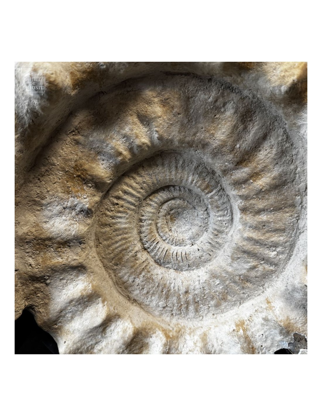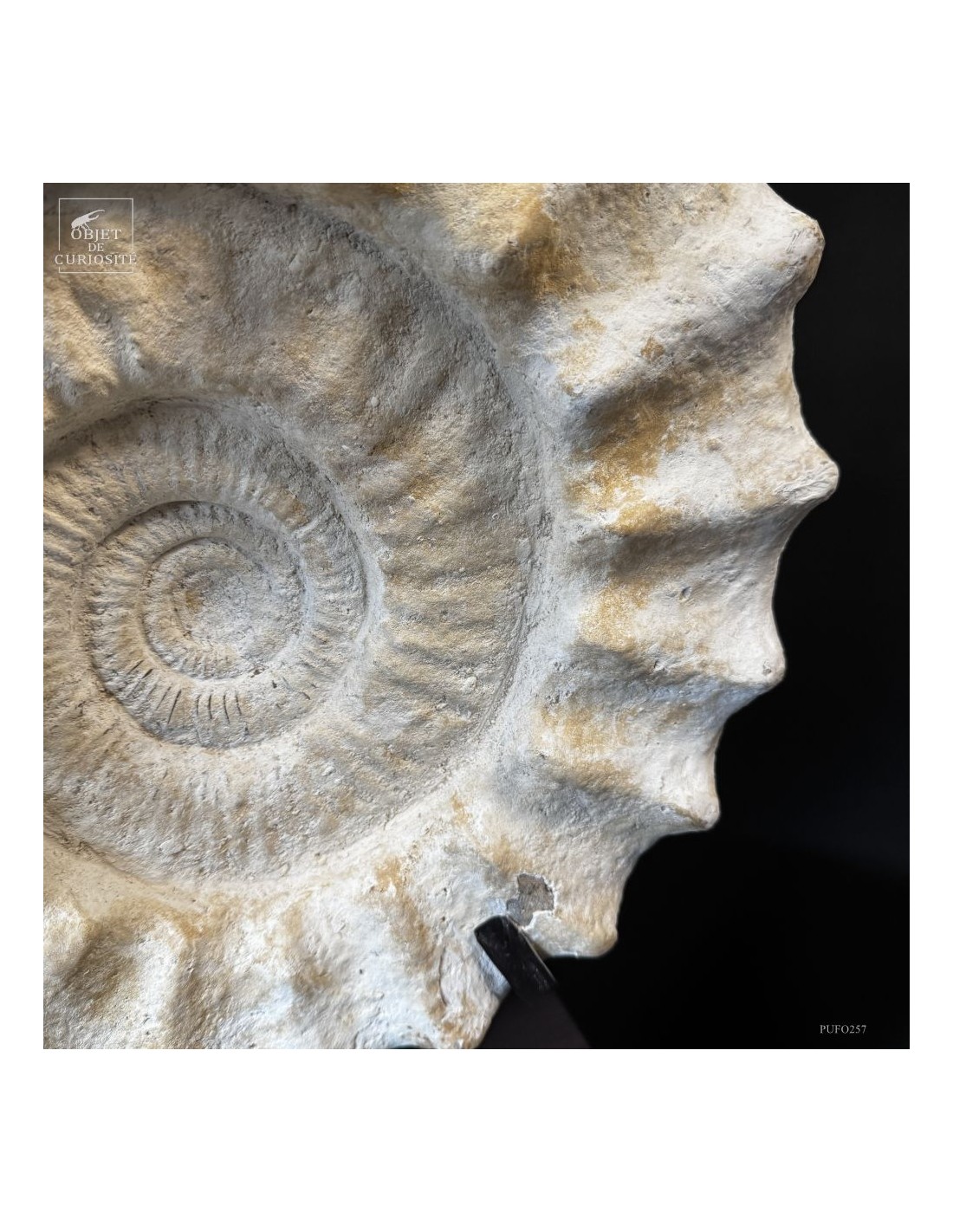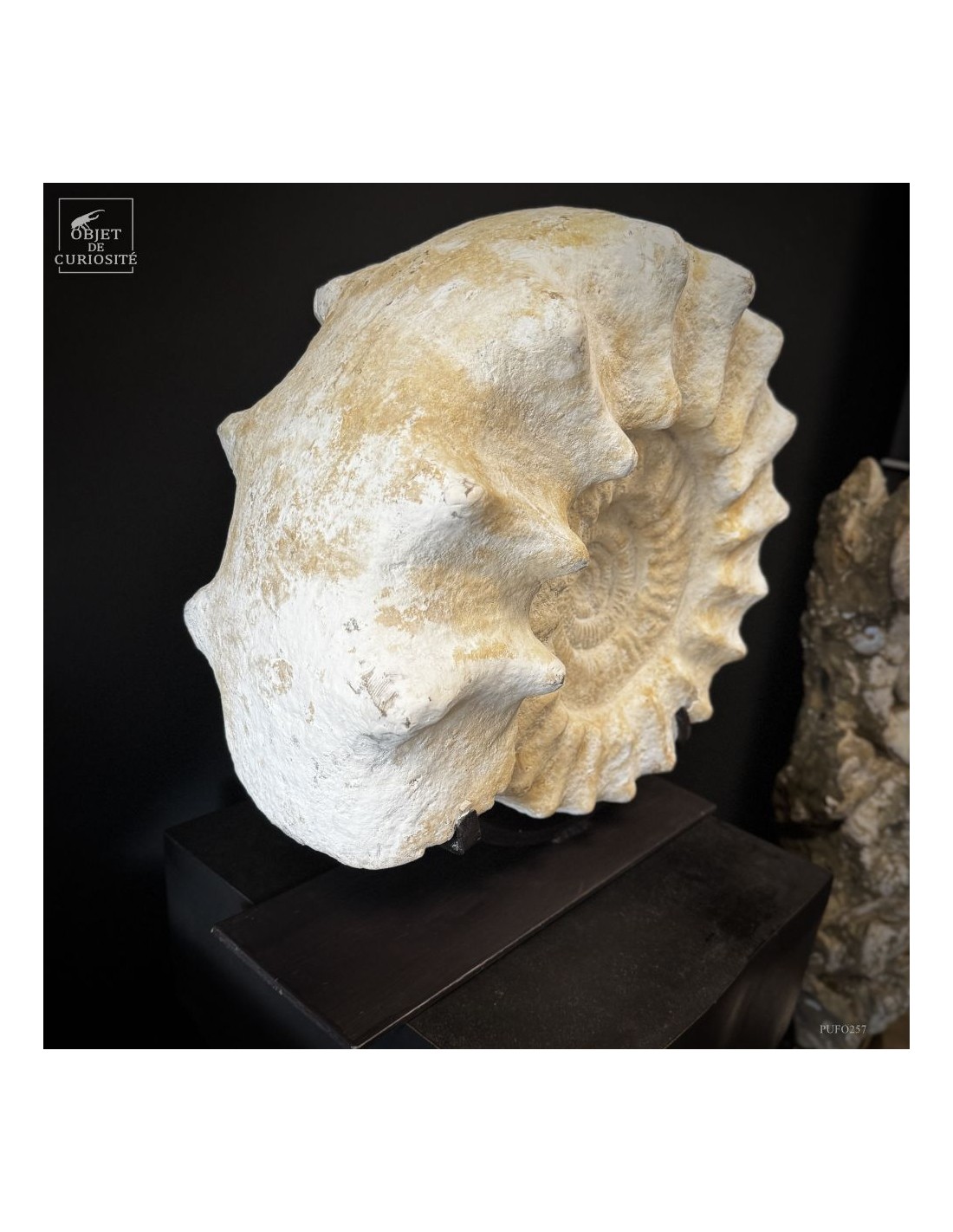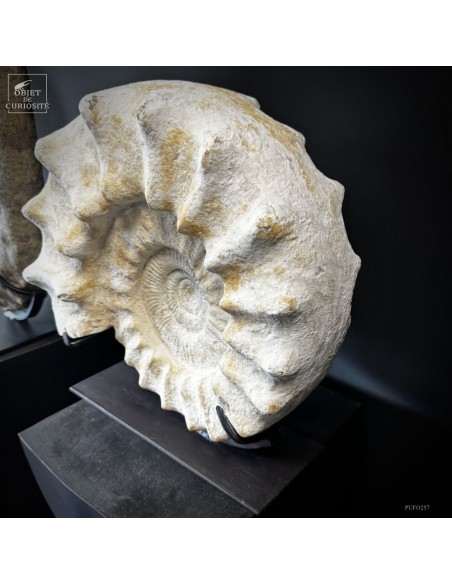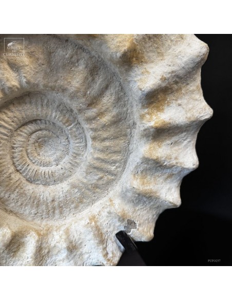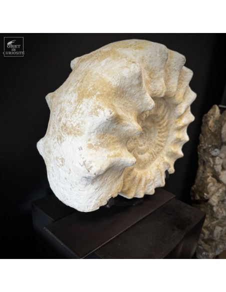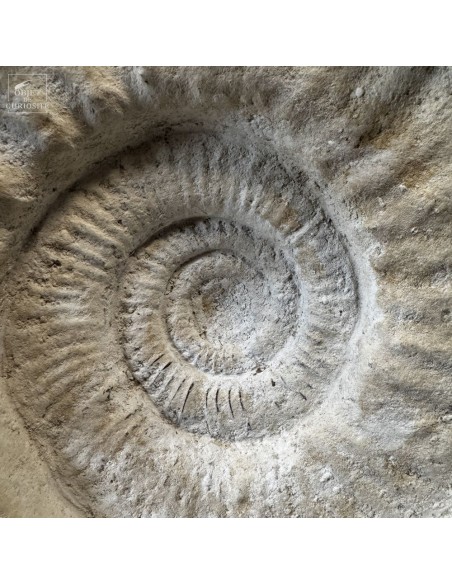 Cet énorme coquillage fossile date de l'Oxfordien, donc autour de 150 Millions d'années, et il ne vient pas d'Angleterre mais plutôt de Madagascar... Cette ammonite présente de très grosses côtes mais aussi une tuberculation proéminente.