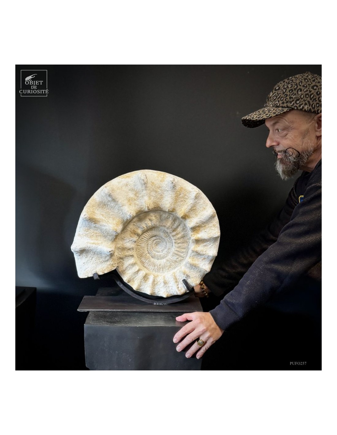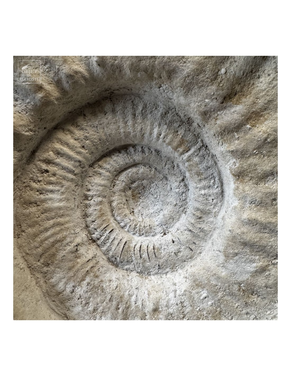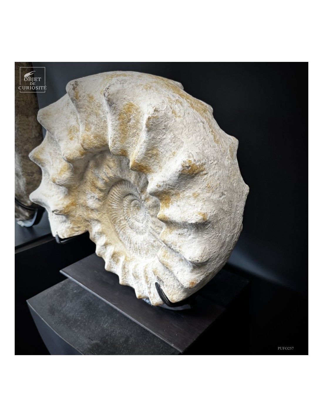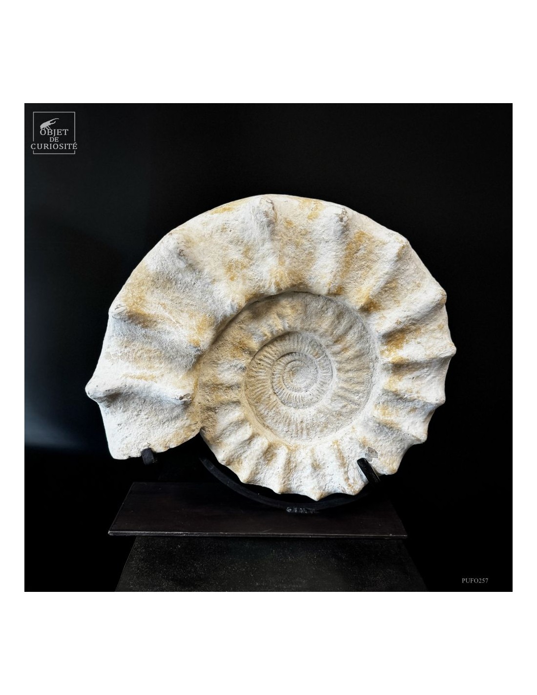 Cet énorme coquillage fossile date de l'Oxfordien, donc autour de 150 Millions d'années, et il ne vient pas d'Angleterre mais plutôt de Madagascar... Cette ammonite présente de très grosses côtes mais aussi une tuberculation proéminente.